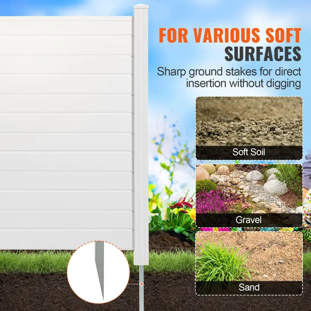 Outdoor Privacy Screens, 50" W x 50" H Air Conditioner Fence, Pool Equipment Enclosure, Horizontal Vinyl Privacy Fence, Perfect to Enclose Trash Can and A/C Units (2-Panel) Description: Suitable for Various Soft Grounds: This premium full-coverage vinyl fence panel comes with pointed metal ground stakes, suitable for various soft grounds such as soil, gravel, or sand. No need the tedious digging, saving both time and effort. The extended metal stakes provide exceptional support, ensuring stability and safety for prolonged use. Dual Wind-Resistant Design: To enhance durability, we've replaced standard plastic stakes with galvanized metal ones, extending to 27.5" for deep soil anchoring. Make the vinyl privacy fence panels' more stable. Embedding the metal legs into the posts, reduces direct damage from heavy rain or storms, enhancing aesthetics and boosting durability. 50x50 inch Large Size: Upgraded to offer superior full coverage, our vinyl fence measures 50x50 inches. It efficiently screens larger equipment or objects and enhances privacy in yard enclosures. Ideal for households seeking tranquility, this also effectively blocks external noise and prevents unwanted interference from passersby. Aesthetic & Practical: Our privacy screen outdoors is crafted from premium PVC instead of cast iron, it's more resistant to water and corrosion. The smooth surface resists dust and stains, while the simple white color complements any setting. For added practicality, metal feet have replaced plastic ones, enhancing overall robustness. The umbrella-shaped protective caps reduce water accumulation. Easy Installation: These air conditioner fences come with all necessary accessories, including metal stakes, U-shaped grooves, protective caps, clips, a generous supply of screws, and positioning board. Detailed instructions ensure quick assembly, making vertical and horizontal installations effortless, even for beginners. Package Content: 2 x Panels 3 x Posts 3 x Galvanized Metal Ground Stakes 3 x Post Caps 2 x U-shaped Grooves 1 x Ground Stake Positioning Board