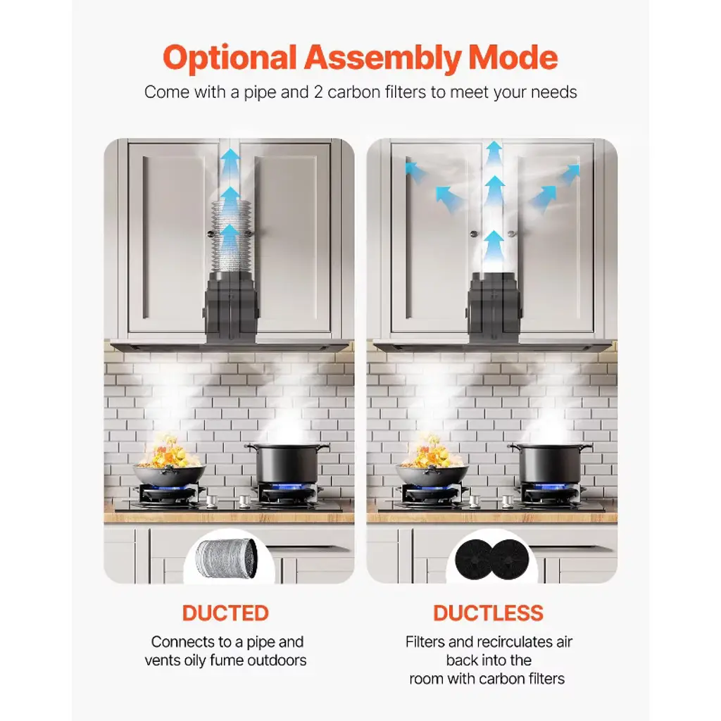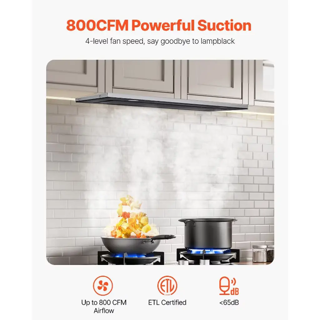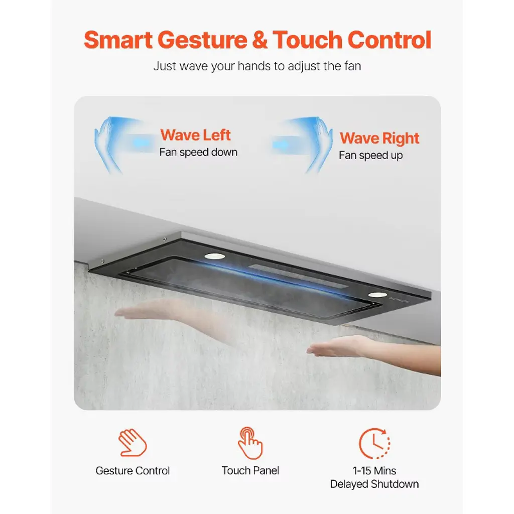 Feature: 800CFM Powerful Suction: Enjoy efficient air purification with our insert range hood's robust 800 CFM airflow. Featuring a 4-level fan speed control, it effectively eliminates smoke and odors from your kitchen while maintaining a quiet operation of less than 65dB. ETL certified for safety and performance. Ducted/Ductless Convertible: Adapt the range vent hood to your kitchen setup with ease. It comes with a duct pipe and 2 carbon filters, allowing for versatile installation options to suit your ventilation needs. Premium Stainless Steel: Crafted for durability and ease of maintenance, the vent hood features stainless steel. Its 2 detachable filters effectively capture grease and oil, and are dishwasher safe, making cleanup a breeze. Smart Gesture & Touch Control: Experience modern convenience with a stylish touch panel and intuitive gesture control. Adjust fan settings effortlessly, even with dirty hands, and utilize the 1-15 minute delayed shutdown feature for added flexibility. Dimmable LED Lights: Customize your kitchen lighting with the adjustable LED lights. Whether you need bright illumination or a softer glow, the dimmable feature allows you to set the perfect ambiance while you cook. Package Content: 1 x Built-in Range Hood 1 x Vent Pipe (59"/1.5m) 2 x Carbon Filters 1 x Screw Pack 1 x User Manual