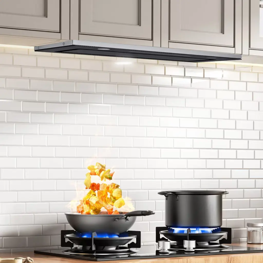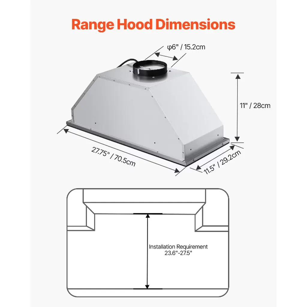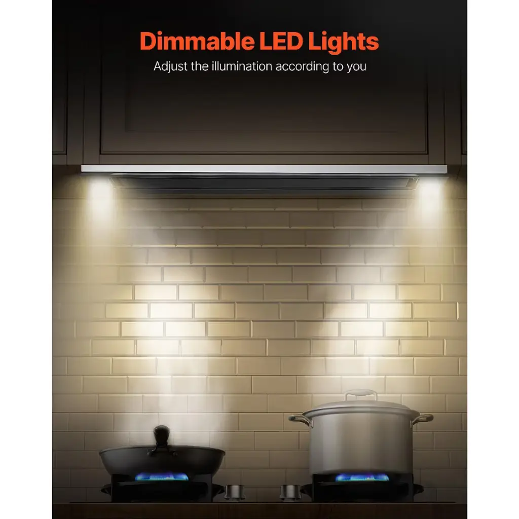 Feature: 800CFM Powerful Suction: Enjoy efficient air purification with our insert range hood's robust 800 CFM airflow. Featuring a 4-level fan speed control, it effectively eliminates smoke and odors from your kitchen while maintaining a quiet operation of less than 65dB. ETL certified for safety and performance. Ducted/Ductless Convertible: Adapt the range vent hood to your kitchen setup with ease. It comes with a duct pipe and 2 carbon filters, allowing for versatile installation options to suit your ventilation needs. Premium Stainless Steel: Crafted for durability and ease of maintenance, the vent hood features stainless steel. Its 2 detachable filters effectively capture grease and oil, and are dishwasher safe, making cleanup a breeze. Smart Gesture & Touch Control: Experience modern convenience with a stylish touch panel and intuitive gesture control. Adjust fan settings effortlessly, even with dirty hands, and utilize the 1-15 minute delayed shutdown feature for added flexibility. Dimmable LED Lights: Customize your kitchen lighting with the adjustable LED lights. Whether you need bright illumination or a softer glow, the dimmable feature allows you to set the perfect ambiance while you cook. Package Content: 1 x Built-in Range Hood 1 x Vent Pipe (59"/1.5m) 2 x Carbon Filters 1 x Screw Pack 1 x User Manual