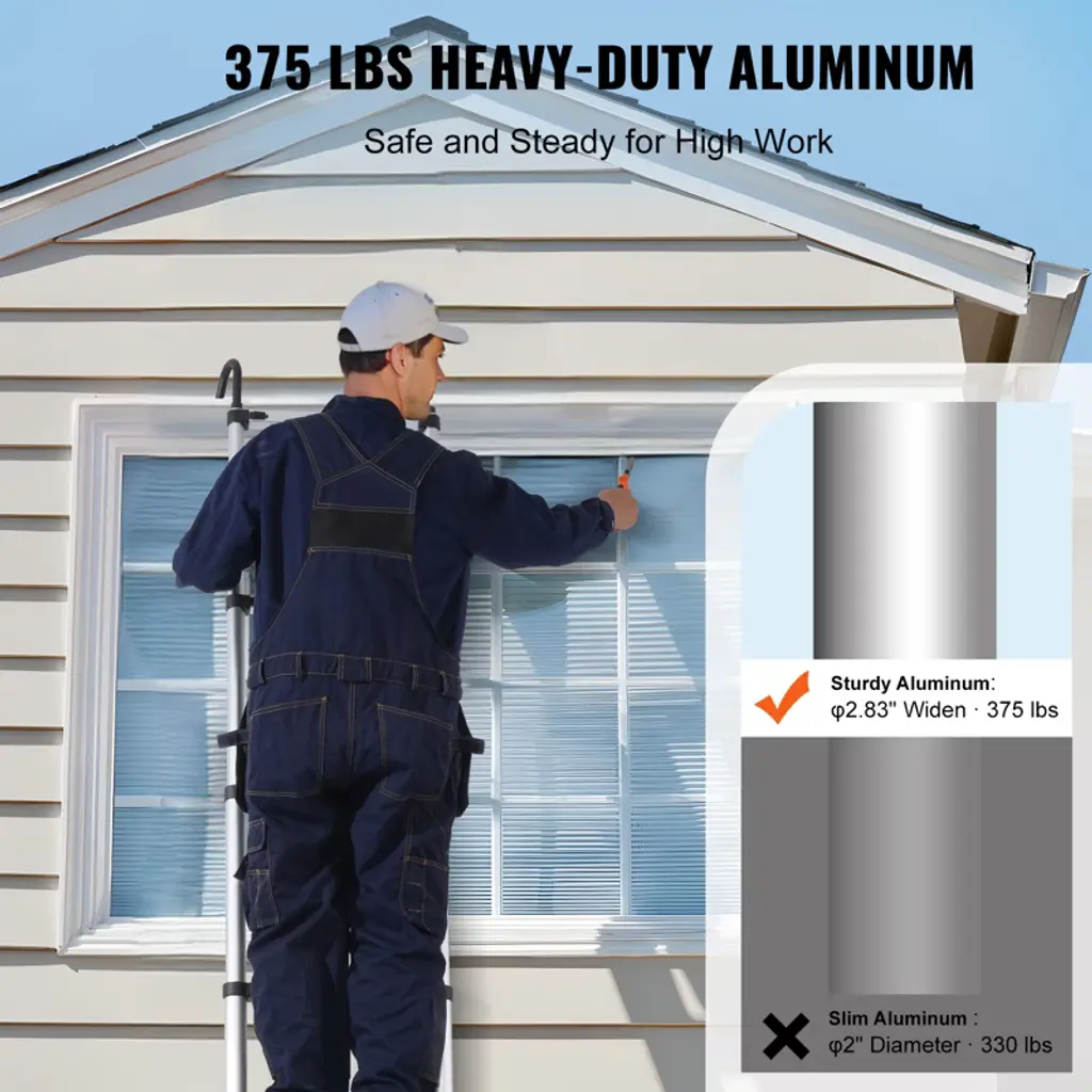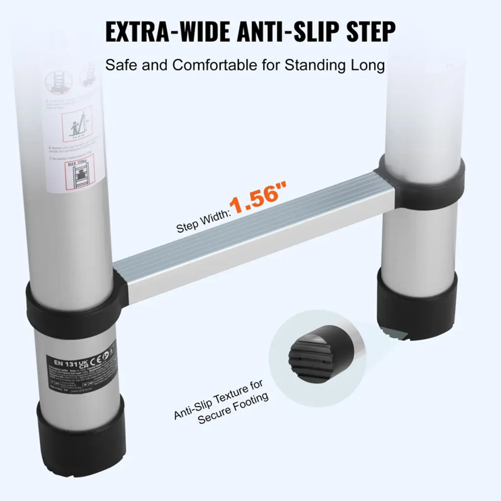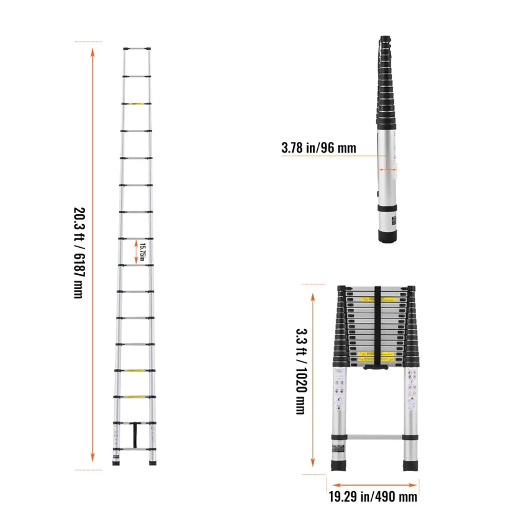 Feature: Stable and Durable: Made from robust aluminum with nylon connectors for enhanced durability, this ladder supports up to 375 lbs, meeting various home and commercial needs and providing peace of mind during elevated tasks. Widened Rungs: The rungs are widened to 1.56 inches, offering a more comfortable and stable standing surface that effectively reduces fatigue during prolonged standing, allowing you to easily complete various high-altitude tasks. Multi-Key Folding: Each level is equipped with an individual locking switch, making it simple and convenient to operate. Easily adjust to your desired height for a more user-friendly experience. Easy to Carry: Crafted from aluminum alloy, this collapsible ladder is lightweight and portable, making it easy to transport even when fully extended. It can be conveniently stored at home or in the garage, helping to keep your living space tidy and organized. Versatile Design: The telescopic ladder allows for manual height adjustment, fully extending to 20.3 ft and retracting to a compact height of 3.3 ft, making it perfect for various tasks, from indoor projects to outdoor maintenance, all while ensuring easy storage and transport. Package Content Telescoping Ladder x 1 User Manual x 1 Hooks x 2 (φ23.8 mm)