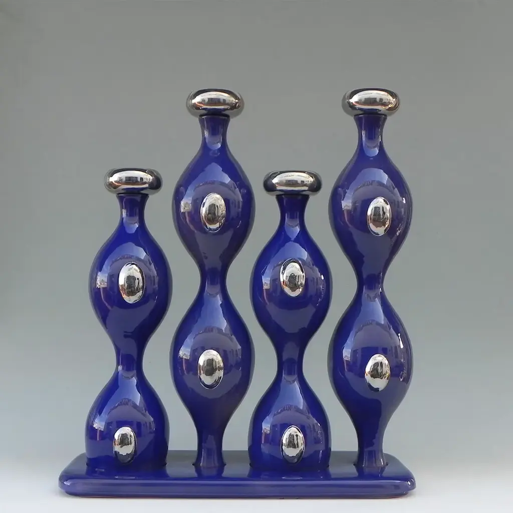 Vibrazioni Auree is a ceramic sculpture with sinuous three-dimensional shapes decorated with a protruding silver ellipse. The four elements that come together in space alternating make the rhythm in space three-dimensional. The ceramic is glazed in cobalt blue, and the silver parts which are then platinum paintings enhance the ellipses and a terminal cup that acts as an oil bulb. The work consists of nine pieces, handmade in the city of ceramics, Albissola, and signed by the designer.