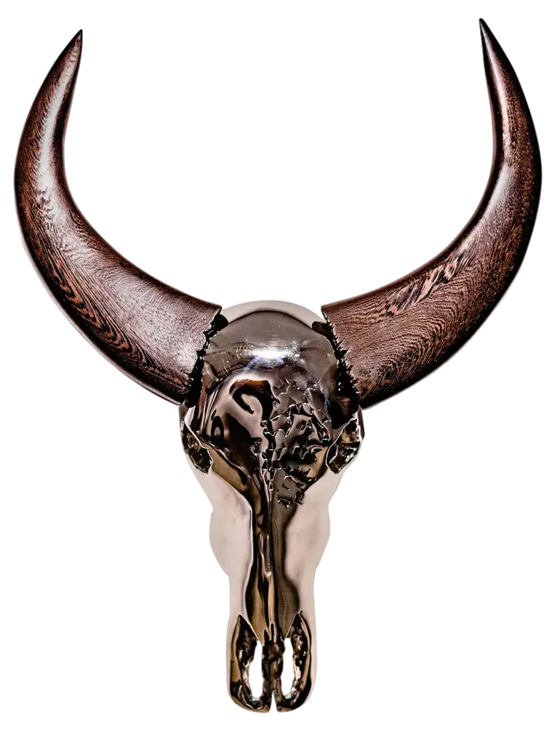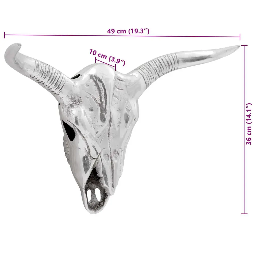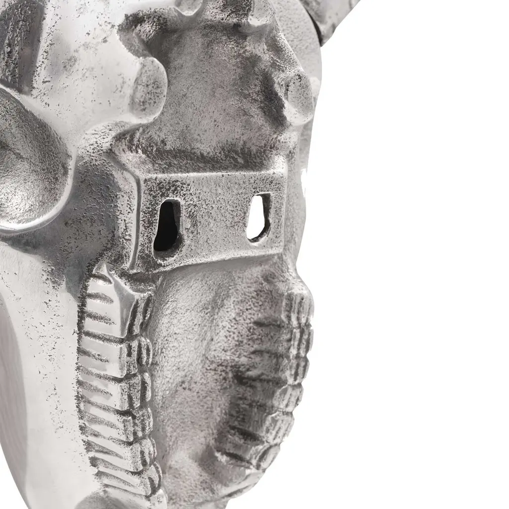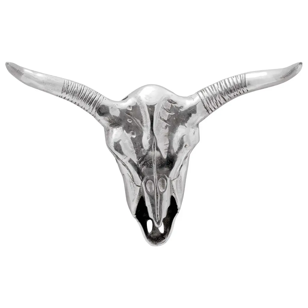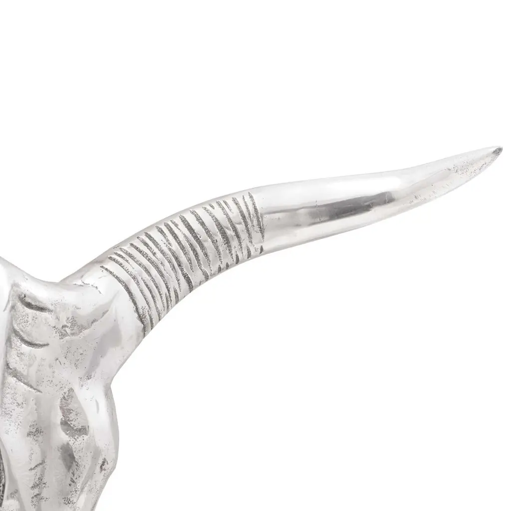 This Bull Skull sculpture, crafted from shiny aluminum, adds a modern touch to any indoor area. It's perfect for those who dig contemporary decor and want to spice up their living spaces with unique, conversation-starting pieces. Combining art and craftsmanship with style, the sleek silver finish brings a classy vibe, making it a versatile addition to different home setups, from minimalist apartments to creative homes. Materials: The Bull Skull is expertly crafted from aluminum, known for its lightweight yet strong qualities. The aluminum gives this sculpture a sleek shine that fits right in with modern decor, and its weather-resistant properties keep it looking fresh over time indoors.Included Components: This piece comes fully assembled—no hassles for those wanting a quick setup. As a wall-mounted decorative art item, it easily blends into various interior styles without taking up floor space.Features /Function /Design: This one-of-a-kind sculpture features decorative inlays, adding depth and artistic flair. Its smooth texture and reflective high-gloss finish beautifully catch the light, creating a lively visual appeal in living rooms, offices, or lobbies.Recommended Uses: Perfect for indoor spots, this art piece adds charm to living rooms or study areas. It's a fantastic accent for eco-conscious folks looking to mix natural themes into modern decor.Care &Maintenance: Keeping the Bull Skull looking pristine is as easy as giving it a dusting with a dry cloth. This simple upkeep keeps the sculpture looking just as stunning as the day it arrived, without needing complicated cleaning routines.