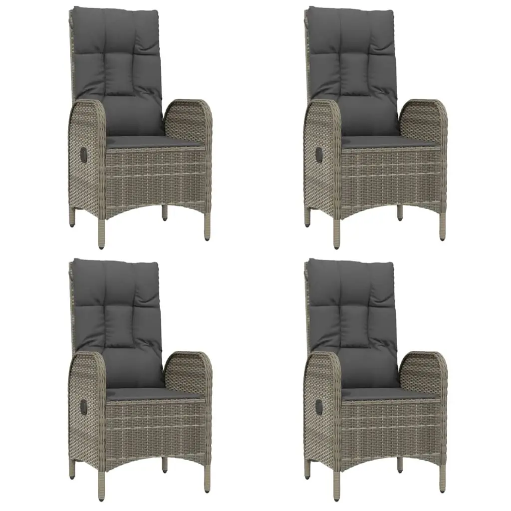 This garden dining set features a sleek design, perfect for your outdoor space, accommodating up to four people comfortably. Its poly rattan structure and tempered glass surface create a stylish yet functional addition to your balcony or patio décor. Adjustable Armrests: The armrests can be manipulated for maximum comfort, making it possible to customize your seating as needed. This functionality is designed to enhance relaxation, perfect for extended outdoor gatherings or quiet evenings. Diverse Seating: The set includes four reclining chairs, providing flexibility for enjoying your meals or lounging. With adjustable positions, this feature ensures everyone can find their ideal comfort during family meals. Durable Frames: Crafted with a sturdy powder-coated steel frame, this dining set is built to withstand the rigors of outdoor use. The robustness of the materials promises longevity, allowing you to enjoy family dining on your patio season after season. Easy Maintenance: Made from weather-resistant PE rattan, this set is easy to maintain, requiring simply a damp cloth for cleaning. The fade-resistant and UV-resistant materials ensure it maintains its aesthetic appeal even in harsh outdoor conditions. Stylish Aesthetics: Its contemporary design features a smooth finish that blends well with various outdoor themes, making it a striking centerpiece in gardens, terraces, and patios. The elegant, understated elegance of the set complements beauty in simplicity.