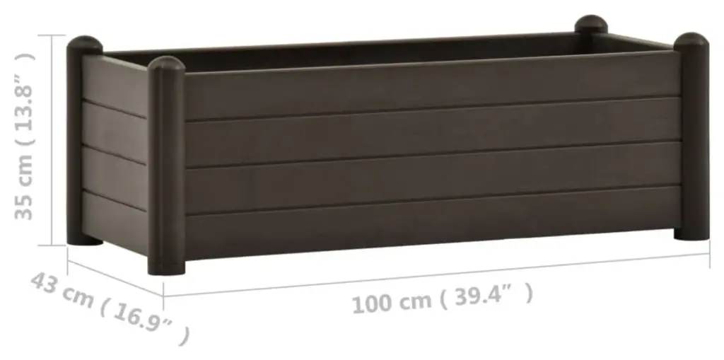 vidaXL Garden Raised Bed PP Mocha 39.4"x16.9"x13.8"Display your favorite flower or plants beautifully with this elegant and functional raised bed! This garden planter, crafted of robust UV, weather and frost resistant PP (polypropylene), is suitable for indoor and outdoor use. This planter is deep and wide enough to hold a large amount of soil, as well as provide ample space for your plants, vegetables, herbs and flowers.Color: MochaMaterial: PP (polypropylene)Dimensions: 39.4" x 16.9" x 13.8" (L x W x H)Capacity: 21.1 galSuitable for indoor and outdoor useUV, weather and frost resistantDesigned with draining bottomAssembly required: YesColor: Brown