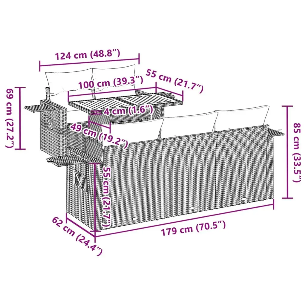 This stunning 6 piece garden sofa set redefines outdoor living, offering a perfect blend of style and functionality. Crafted with elegant black poly rattan, this set includes comfy corner seats and a center seat, combined with plush cushions, delivering a sophisticated look that enhances any patio, terrace, or garden ambiance. Versatile Modular Design: The modular construction allows for different configurations to suit your space, making it perfect for any outdoor setting. Whether hosting a lively gathering or a quiet evening under the stars, this sofa set can easily adapt to meet your needs.Comfortable Cushions: Each seat is designed with thick, removable cushions that provide excellent comfort and support. They feature a stylish brown cream color that complements the sleek black rattan, allowing for a fresh, modern aesthetic.Sturdy Construction: The set’s frame is made from durable powder-coated steel, ensuring long-lasting use even in varying weather conditions. The robust build supports a maximum weight of 242.5 lbs, making it a reliable choice for outdoor furniture.Easy Maintenance: With removable, machine-washable covers, cleaning is effortless. This feature makes it easy to keep your sofa looking new, letting you focus on enjoying your outdoor spaces.Generous Seating Capacity: This garden sofa set comfortably seats up to five people, ideal for hosting outdoor parties or enjoying cozy family time, ensuring ample space for friends and family to gather around.