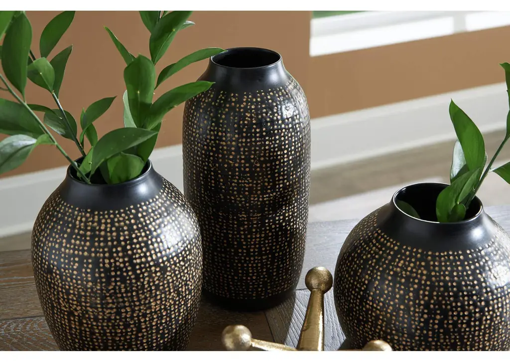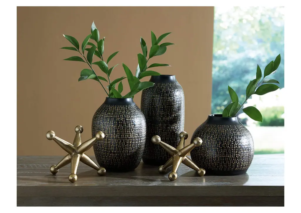Elevate your decor with the striking Vinburn accessory set. Its sleek black vases, adorned with delicate goldtone accents, are perfect for displaying your favorite faux blooms or standing alone as minimalist statements. They're paired with bold geometric sculptures, creating a dynamic and sophisticated look for modern spaces. Weight 8.000 lbs. (3.6kgs.)
