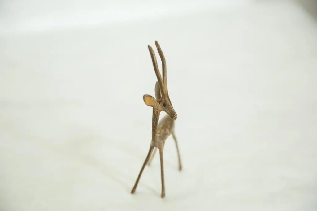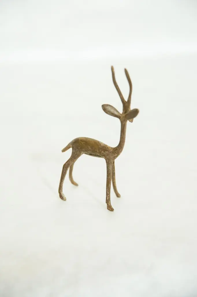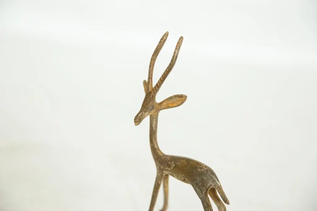 :: Vintage handmade African Bronze Left Facing Alert Gazelle. Circa mid 20th century and possibly older, this piece has such incredible handmade charm and no two are identical. Create a scene of wildlife with many of our vintage African animal sculptures or add just one to the shelf, these are beautiful collectibles that you or someone you love will cherish forever. As this item is in vintage condition, it may show signs of age and use. You may receive one that is slightly different than the one photographed since we have multiples of this item. Please contact us prior to purchase if you would like us to send additional snapshots of the one we would be sending.