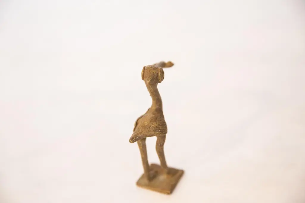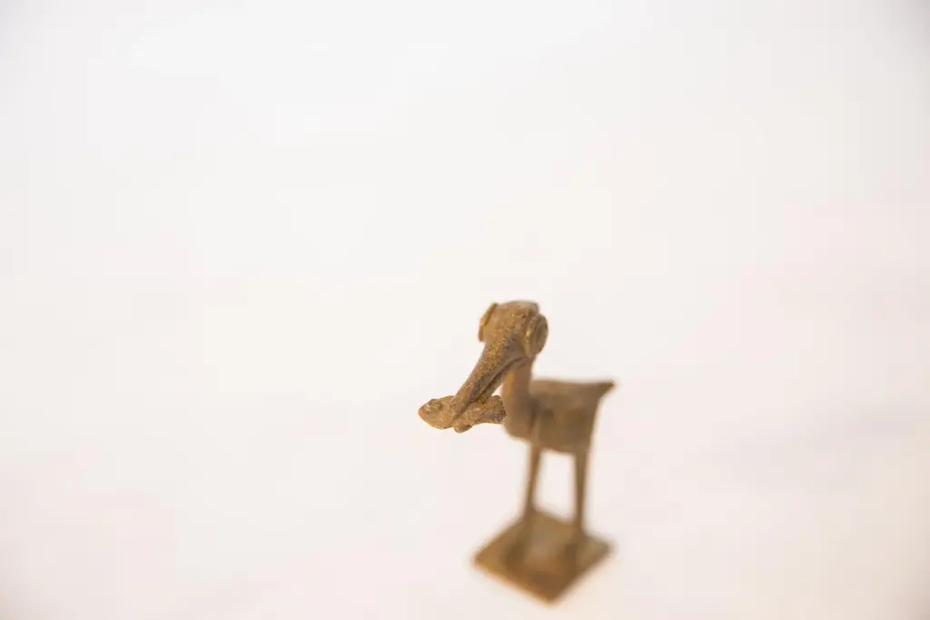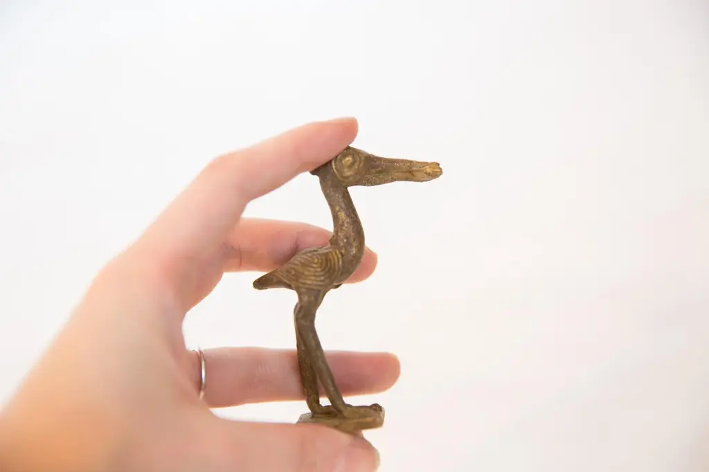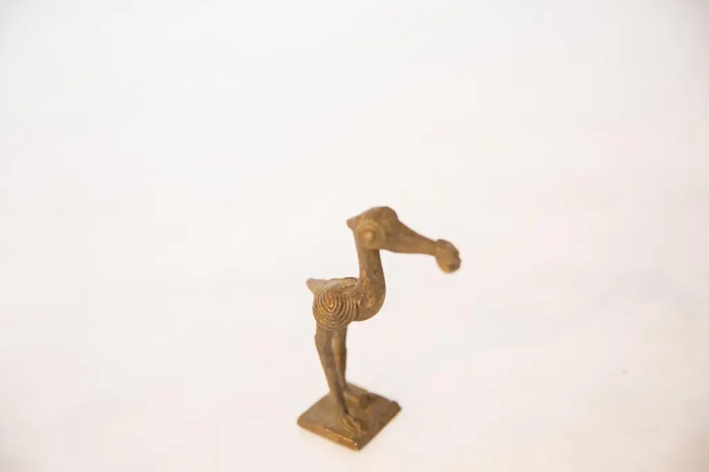 :: Vintage handmade bronze stork with fish. Circa mid 20th century and possibly older, this piece has such incredible handmade charm and no two are identical. As this item is in vintage condition, it may show signs of age and use. Possibly an example of an Ashanti gold weight, or Mbramoo, which were used in the measuring of gold and gold dust. Create a scene of wildlife with many of our vintage African animal sculptures or add just one to the shelf, these are beautiful collectibles that you or someone you love will cherish forever.