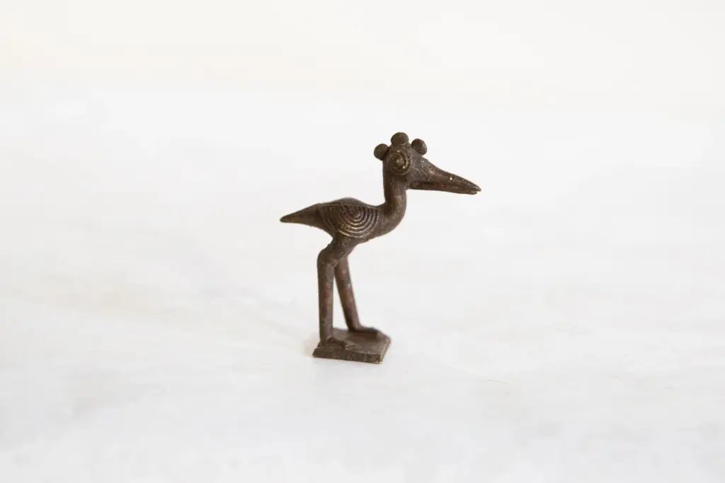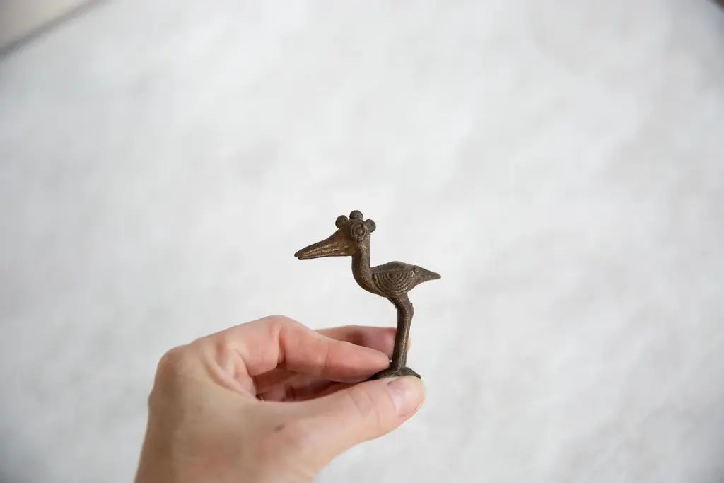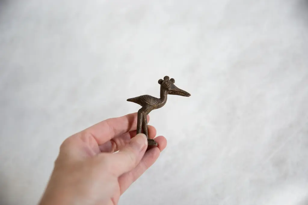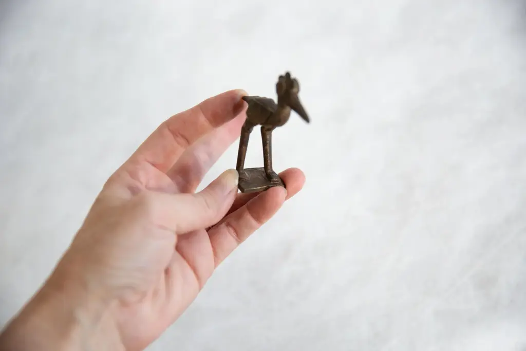 :: Vintage handmade African dark bronze crowned stork. Circa mid 20th century and possibly older, this piece has such incredible handmade charm and no two are identical. This may be an example of an Ashanti gold weight, also known as Mbramoo, which were used in the measuring of gold and gold dust. Create a scene of wildlife with many of our vintage African animal sculptures or add just one to the shelf, these are beautiful collectibles that you or someone you love will cherish forever. As this item is in vintage condition, it may show signs of age and use. You may receive one that is slightly different than the one photographed since we have multiples of this item. Please contact us prior to purchase if you would like us to send additional snapshots of the one we would be sending. Size measures: 1" x 2.5" x 3"
