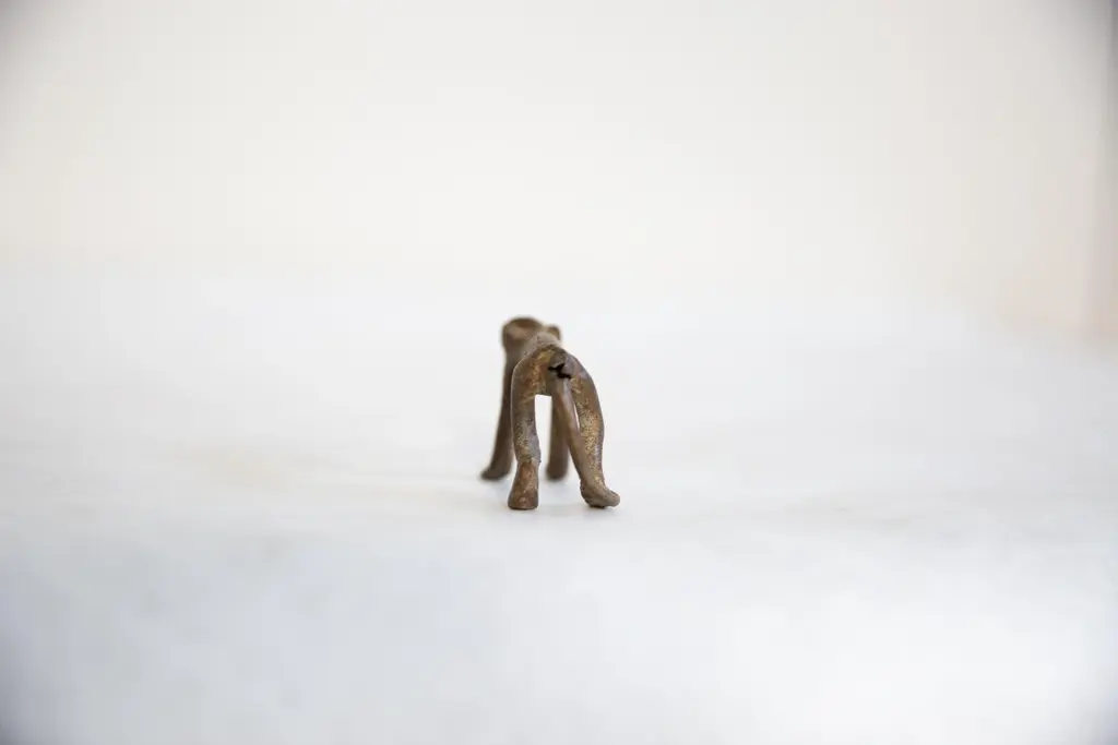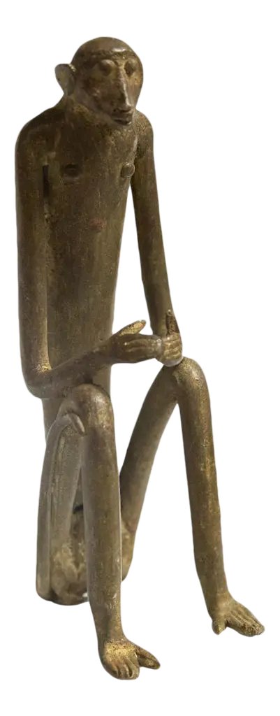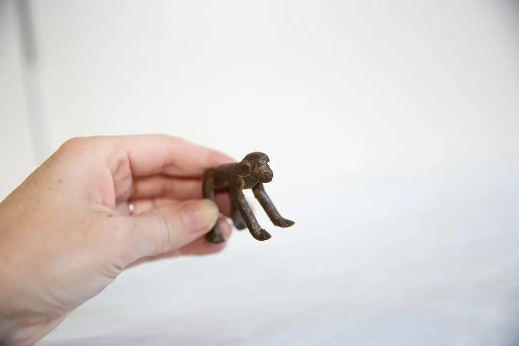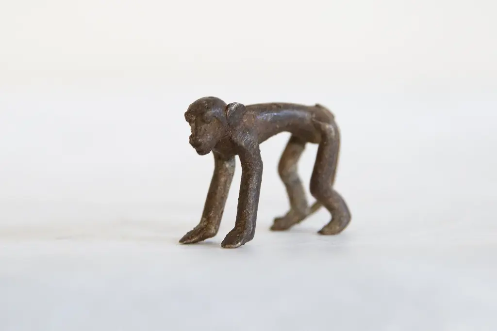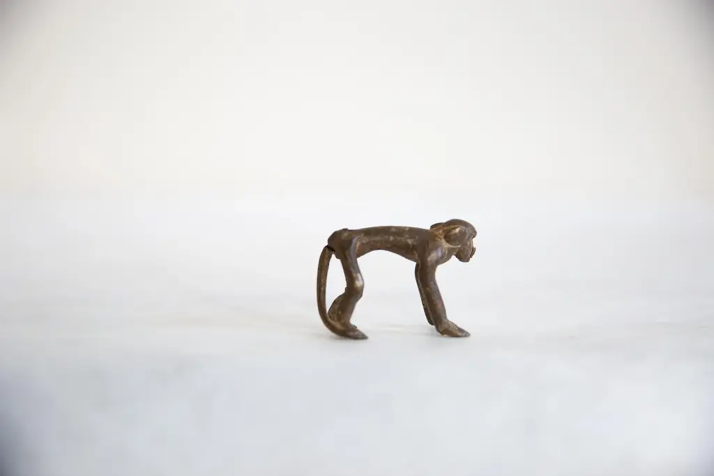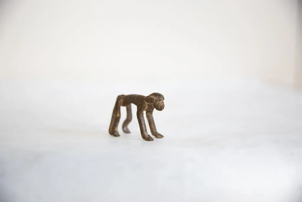 :: Vintage handmade African dark bronze smooth back monkey. Circa mid 20th century and possibly older, this piece has such incredible handmade charm and no two are identical. This may be an example of an Ashanti gold weight, also known as Mbramoo, which were used in the measuring of gold and gold dust. Create a scene of wildlife with many of our vintage African animal sculptures or add just one to the shelf, these are beautiful collectibles that you or someone you love will cherish forever. As this item is in vintage condition, it may show signs of age and use. You may receive one that is slightly different than the one photographed since we have multiples of this item. Please contact us prior to purchase if you would like us to send additional snapshots of the one we would be sending. Size measures: 1" x 2" x 1.5"