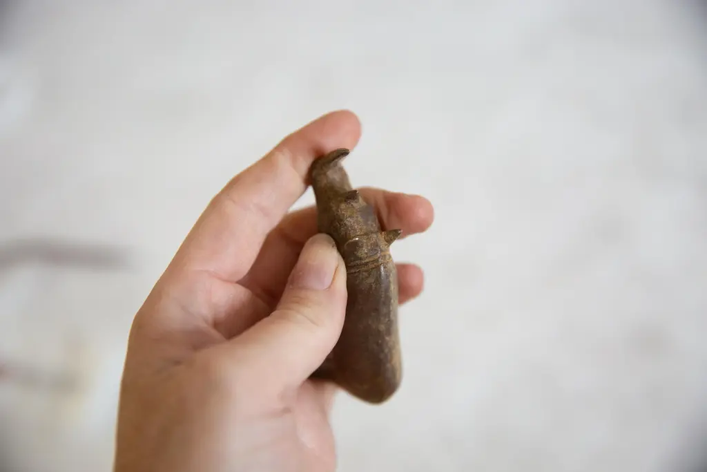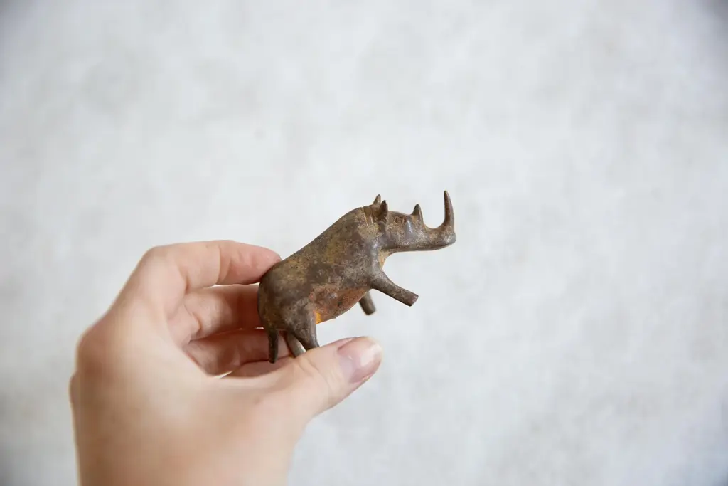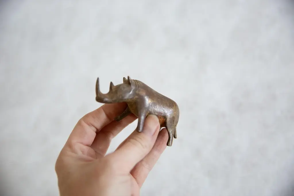 :: Vintage handmade African medium bronze alloy thin nosed rhino. Circa mid 20th century and possibly older, this piece has such incredible handmade charm and no two are identical. Create a scene of wildlife with many of our vintage African animal sculptures or add just one to the shelf, these are beautiful collectibles that you or someone you love will cherish forever.