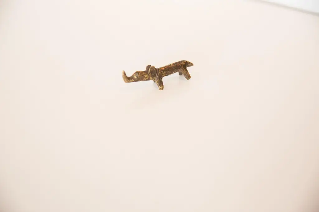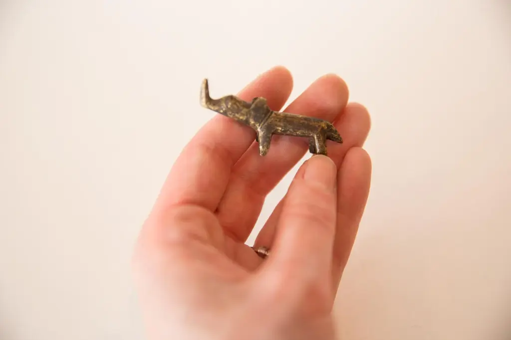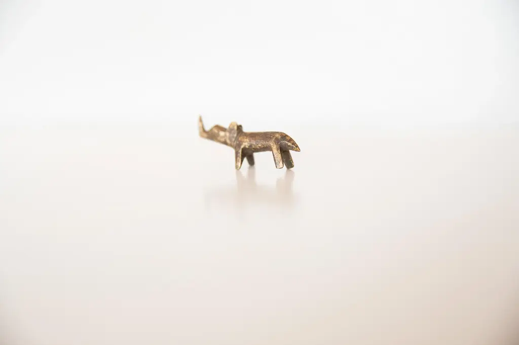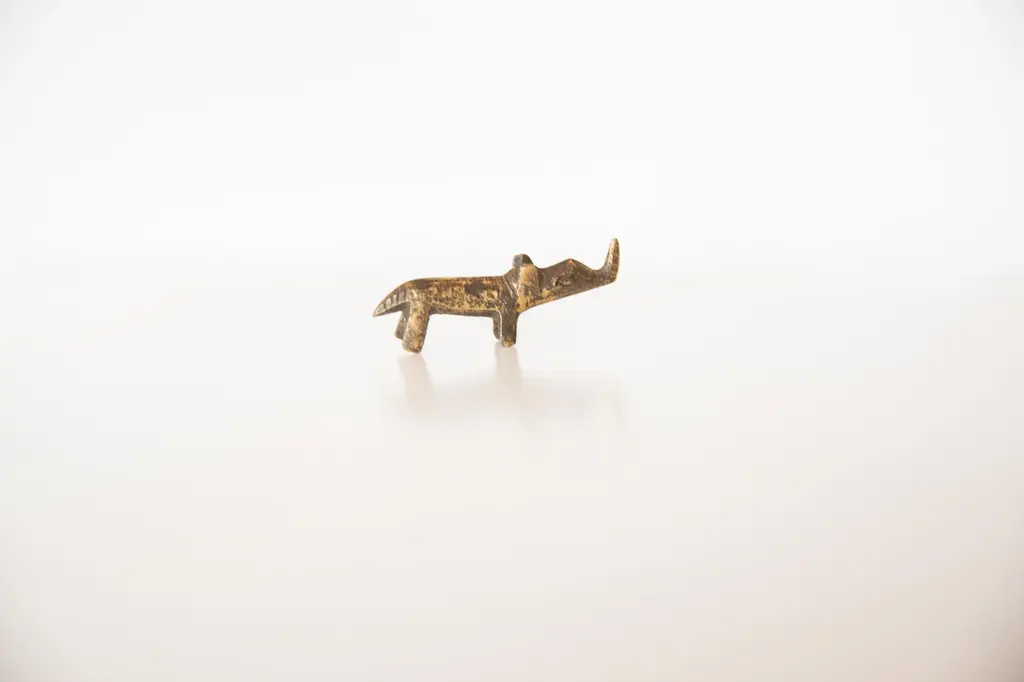 :: Vintage handmade bronze sculpture of a miniature rhinoceros. Circa mid 20th century and possibly older, this piece has such incredible handmade charm and no two are identical. As this item is in vintage condition, it may show signs of age and use. Possibly an example of an Ashanti gold weight, or Mbramoo, which were used in the measuring of gold and gold dust. Create a scene of wildlife with many of our vintage African animal sculptures or add just one to the shelf, these are beautiful collectibles that you or someone you love will cherish forever.