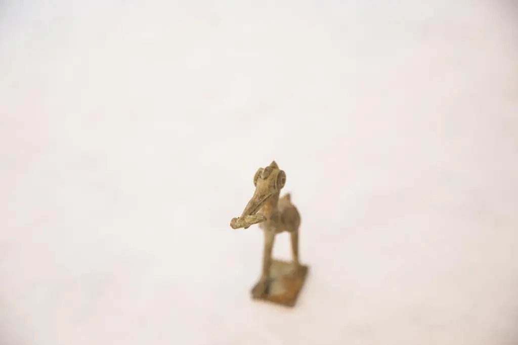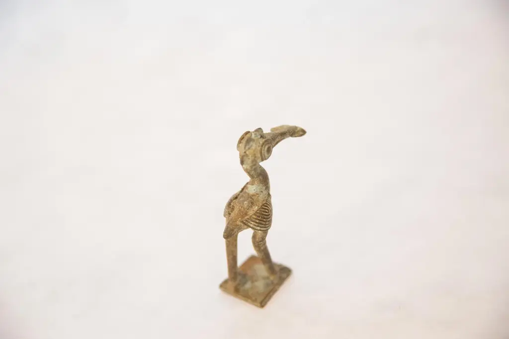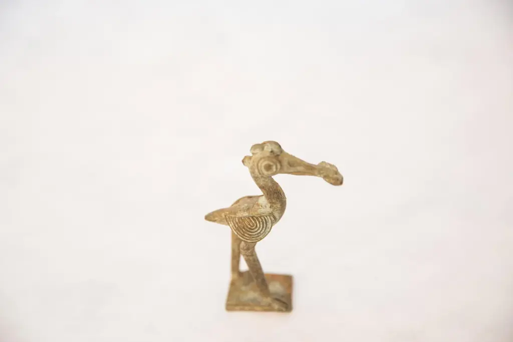 :: Vintage handmade oxidized bronze crowned stork with fish. Circa mid 20th century and possibly older, this piece has such incredible handmade charm and no two are identical. As this item is in vintage condition, it may show signs of age and use. Possibly an example of an Ashanti gold weight, or Mbramoo, which were used in the measuring of gold and gold dust. Create a scene of wildlife with many of our vintage African animal sculptures or add just one to the shelf, these are beautiful collectibles that you or someone you love will cherish forever. Kindly note the item photographed may not necessarily be an identical to that which you receive. This listing is for a one of a kind handmade item, however, we do have multiples which are being sold under one parent listing. Minor and subtle differences may apply to the finish, dimensions, slight imperfections, and in some cases a male or female being substituted interchangeably.