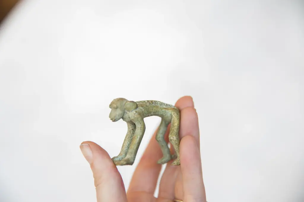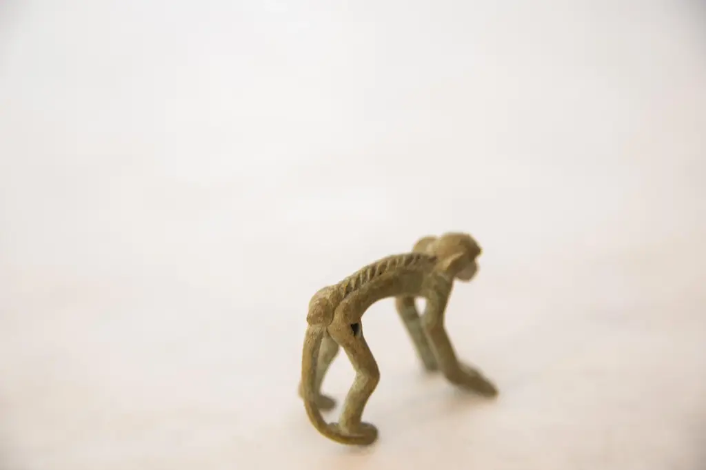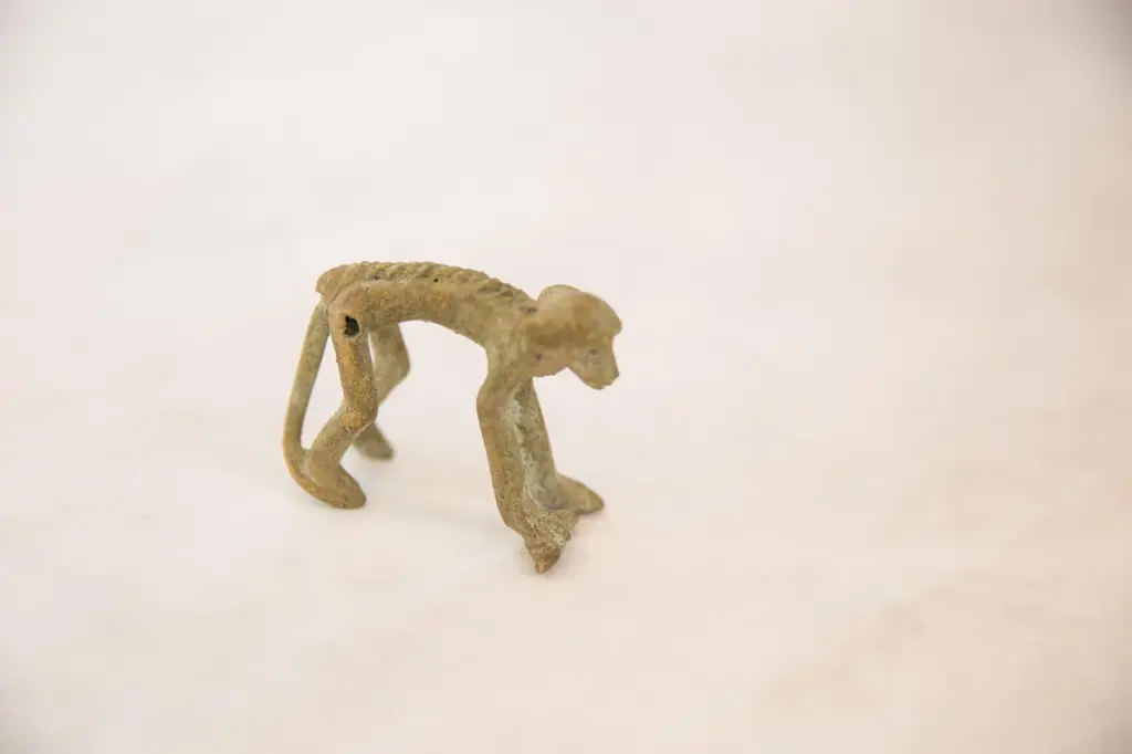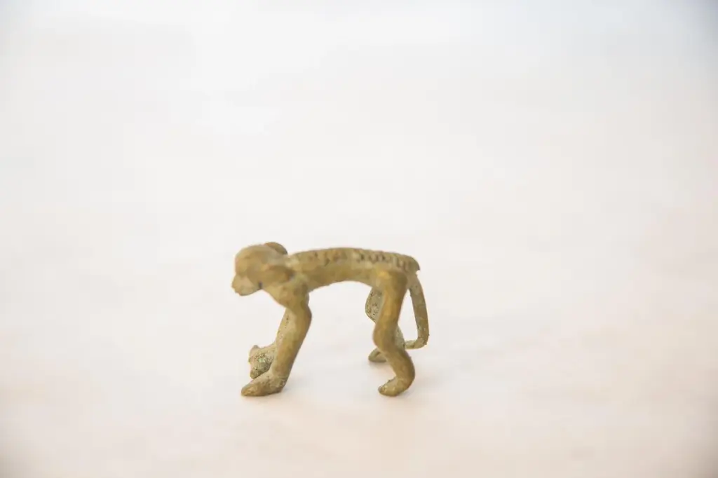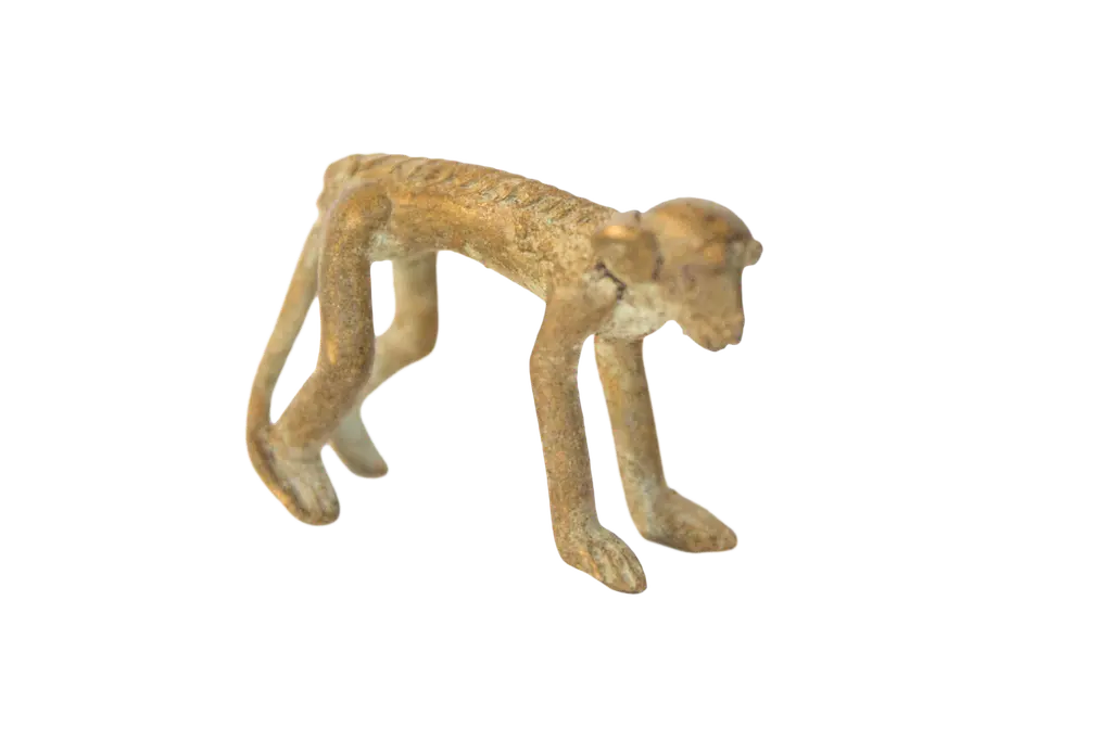 :: Vintage handmade oxidized bronze monkey holding banana. Circa mid 20th century and possibly older, this piece has such incredible handmade charm and no two are identical. As this item is in vintage condition, it may show signs of age and use. Possibly an example of an Ashanti gold weight, or Mbramoo, which were used in the measuring of gold and gold dust. Create a scene of wildlife with many of our vintage African animal sculptures or add just one to the shelf, these are beautiful collectibles that you or someone you love will cherish forever.