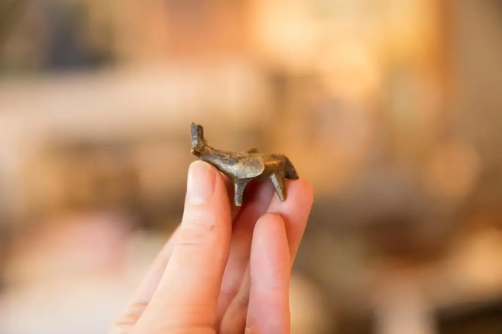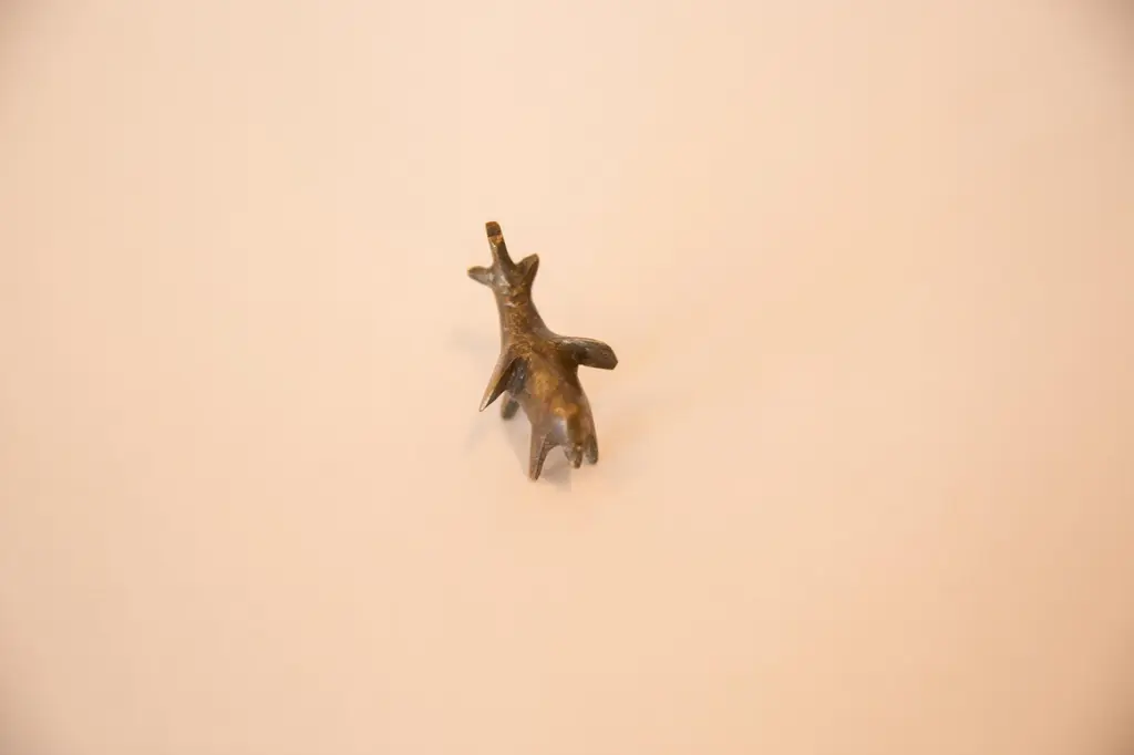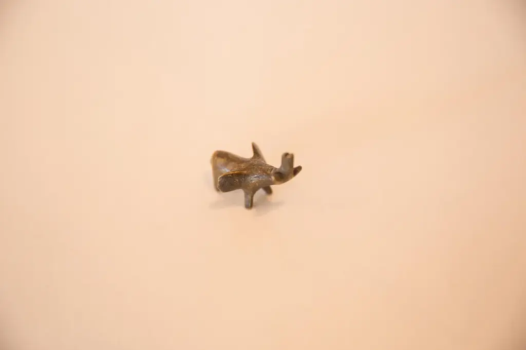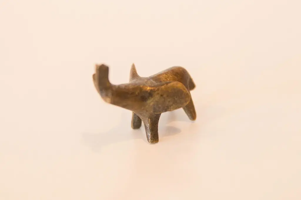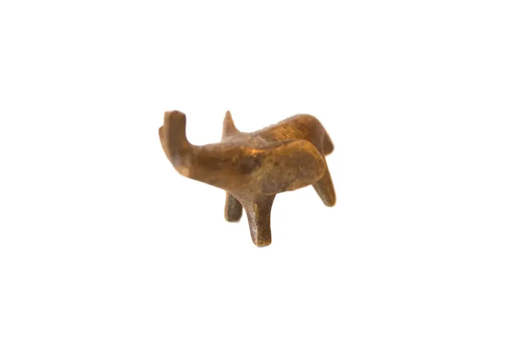 :: Vintage handmade bronze casting of a tiny elephant. Circa mid 20th century and possibly older, this piece has such incredible handmade charm and no two are identical. Possibly an example of an Ashanti gold weight, or Mbramoo, which were used in the measuring of gold and gold dust. Create a scene of wildlife with many of our vintage African animal sculptures or add just one to the shelf, these are beautiful collectibles that you or someone you love will cherish forever. You may receive one that is slightly different than the one photographed since we have multiples of this item. Please contact us prior to purchase if you would like us to send additional snapshots of the one we would be sending.