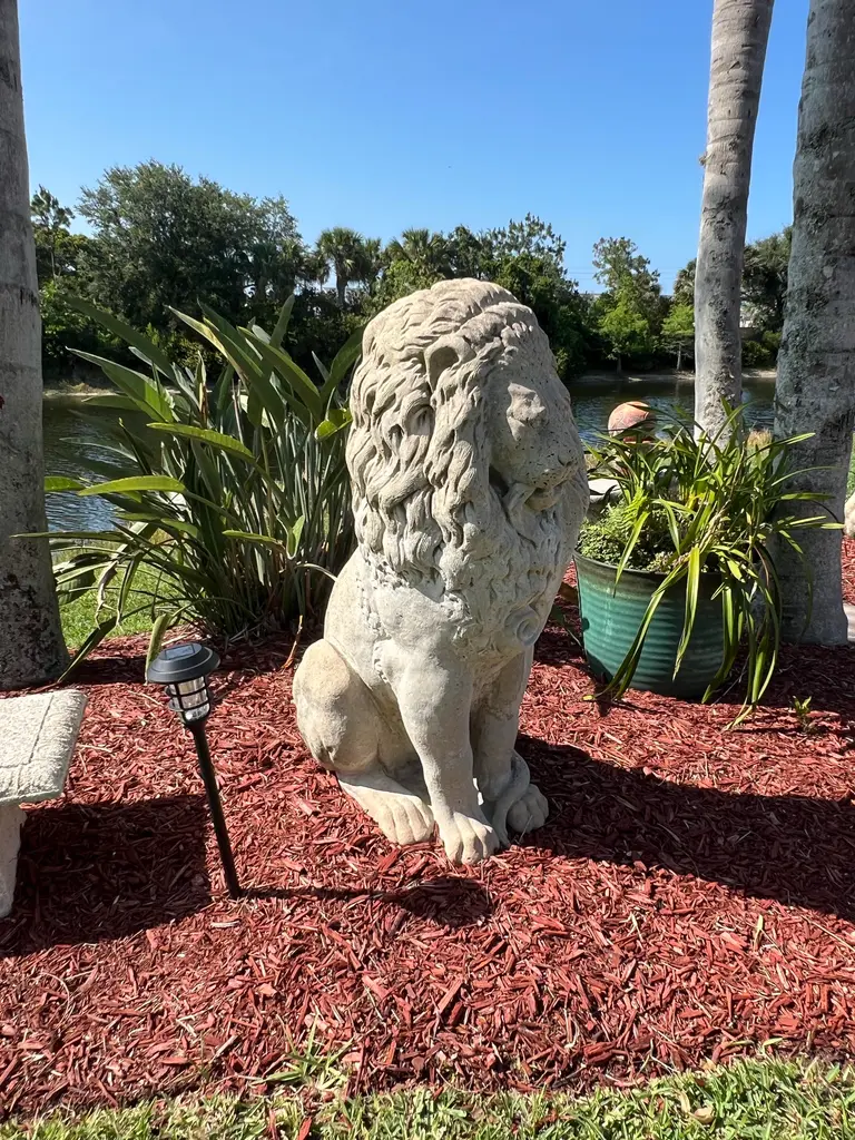 Large Concrete Statue of a Sentinel Guard Lion . The lion appears to be gazing out over his domain with a watchful protective eye. Heavy solid concrete weighs over 500 pounds. Large standing 45 inches tall. Lions are symbols of protection and strength. I have 2 available for sale.