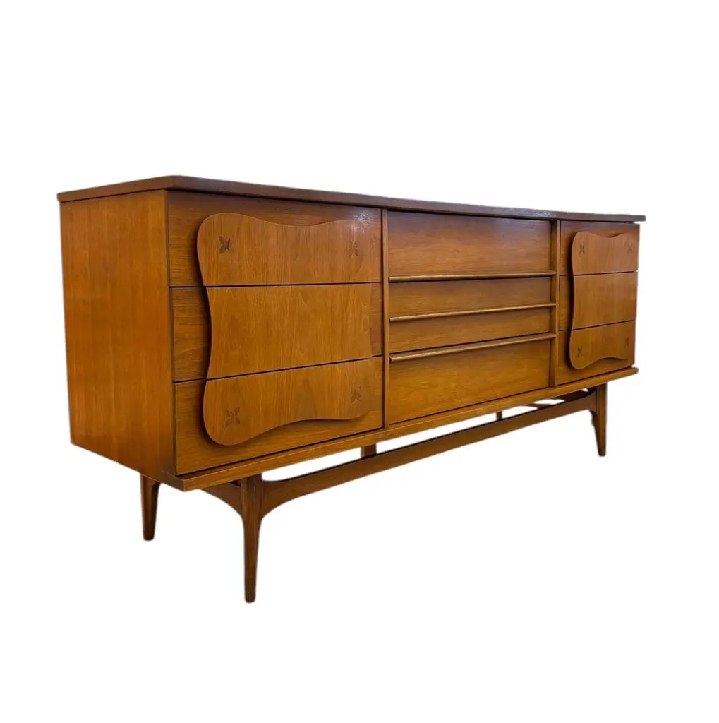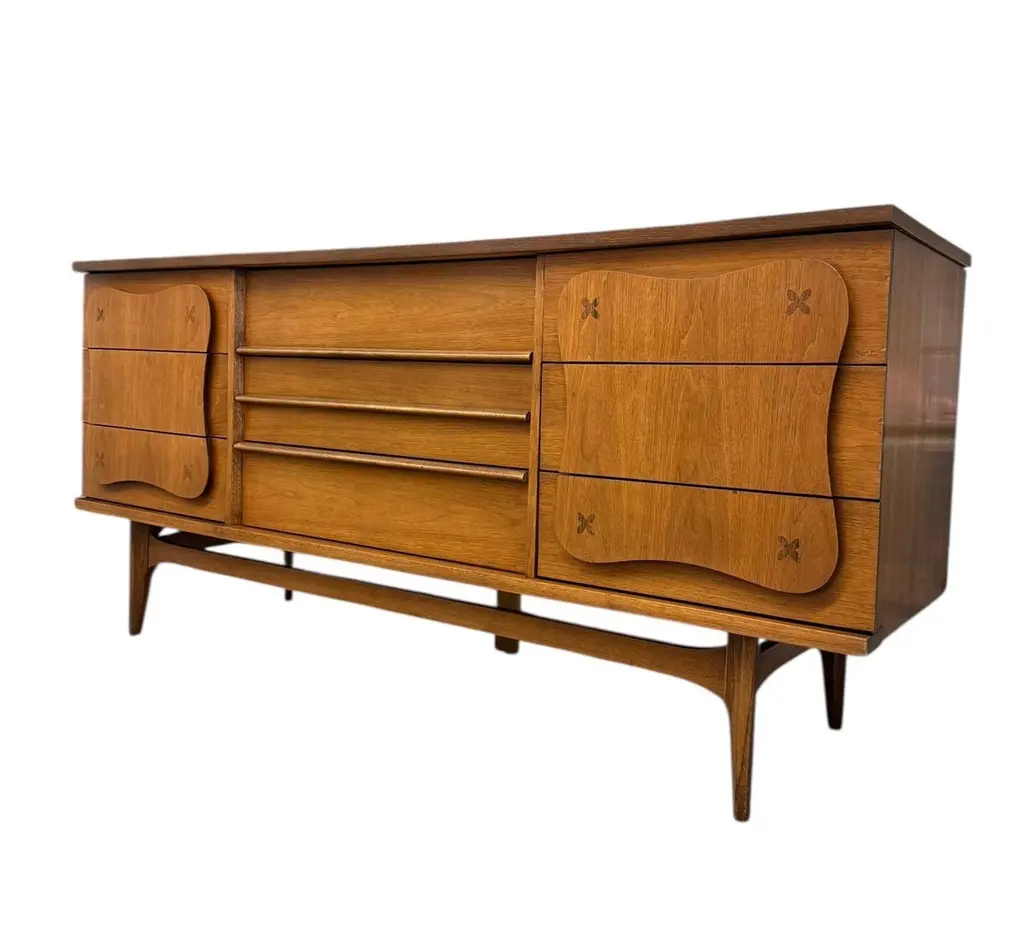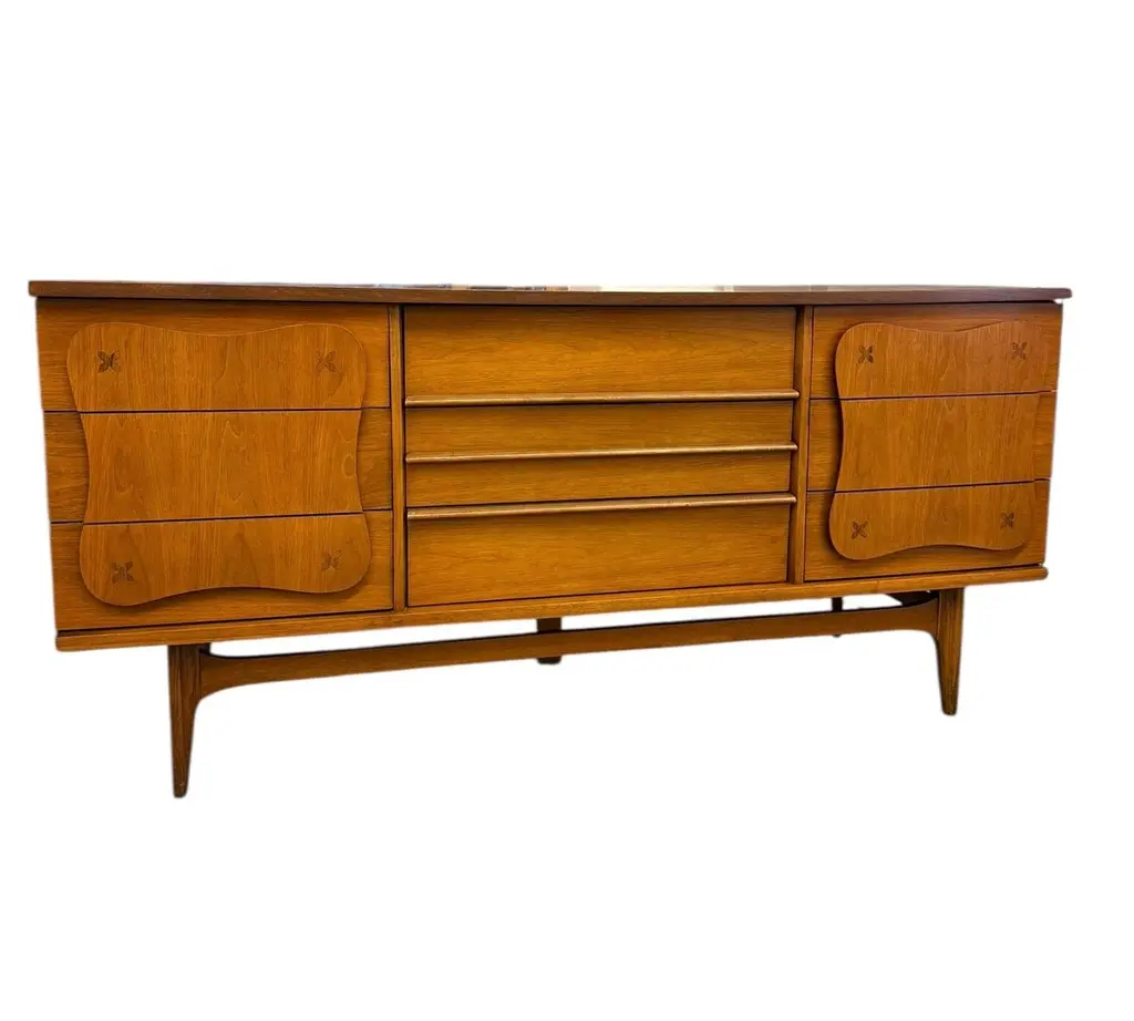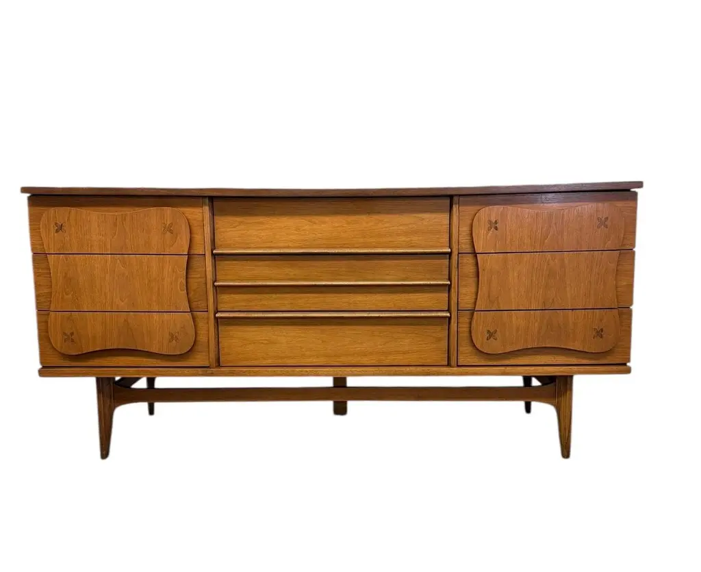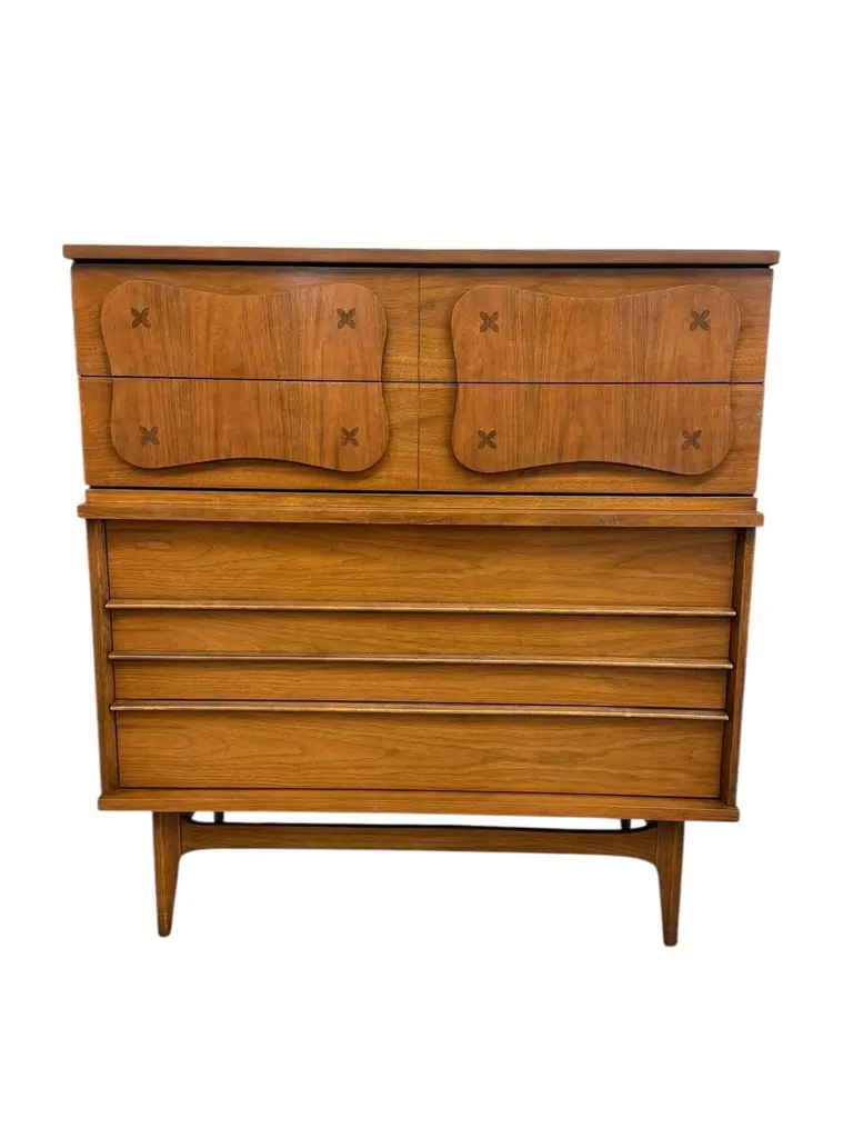 This rare Bassett Furniture dresser from the iconic “Monterey” line, designed by Leo Jiranek, was produced for only 10 months between 1962 and 1963. Crafted with a walnut veneer over solid wood, the set includes 5-drawer dresser and 9-drawer dresser adorned with sculpted rosewood “X” inlays that double as drawer pulls. The dresser’s sculptured legs and aprons, paired with its warm Carmel Walnut finish, reflect a seamless blend of Scandinavian-inspired design and American contemporary style.Dimensions Tallboy: 42"W × 18"D x 45"HDimensions Lowboy: 64”W × 18”D × 30.5”HCondition: Professionally restored, this vintage piece exhibits minor signs of wear consistent with its age and prior use, adding to its authentic charm.About the Monterey Line:Bassett’s “Monterey” collection is celebrated for its forward-thinking design, combining generous proportions with meticulous details. The rosewood inlays, horizontal wood pulls, and elegant walnut veneers create a timeless aesthetic, making this dresser a standout addition to any modern or mid-century-inspired space.