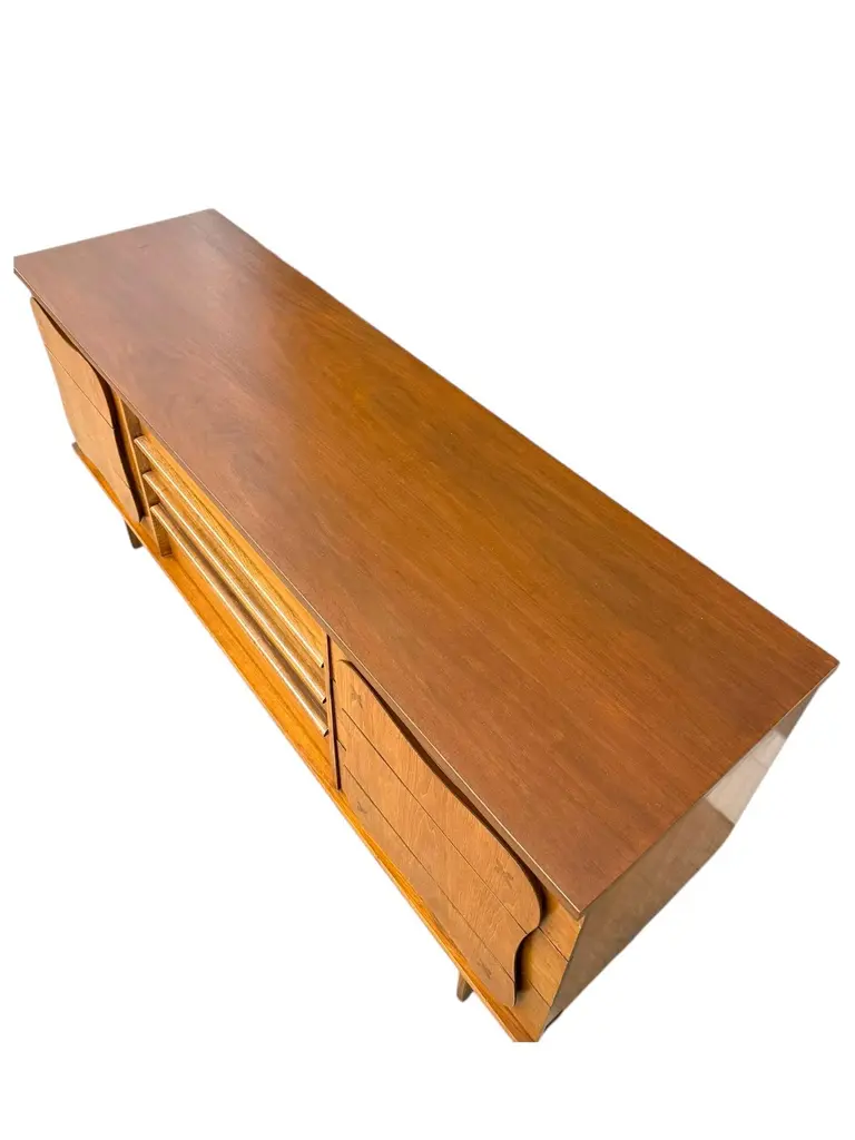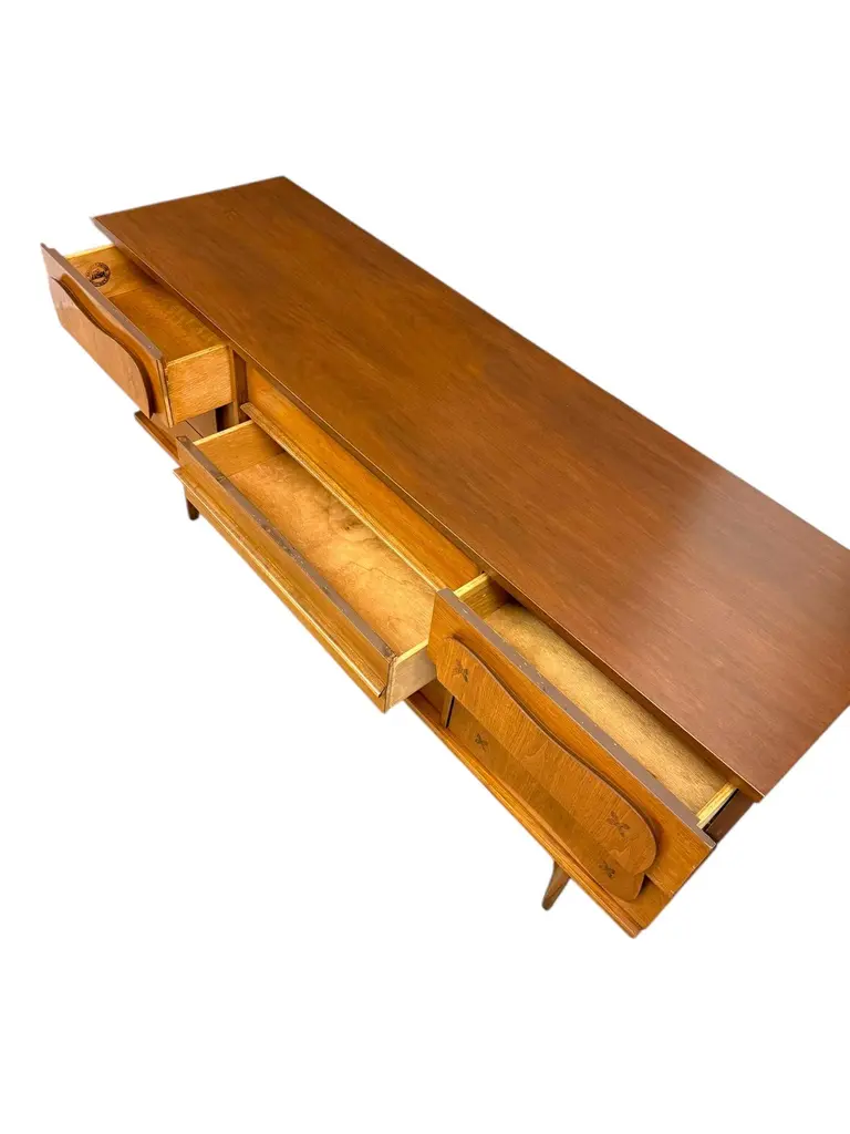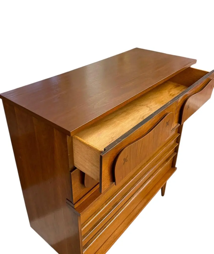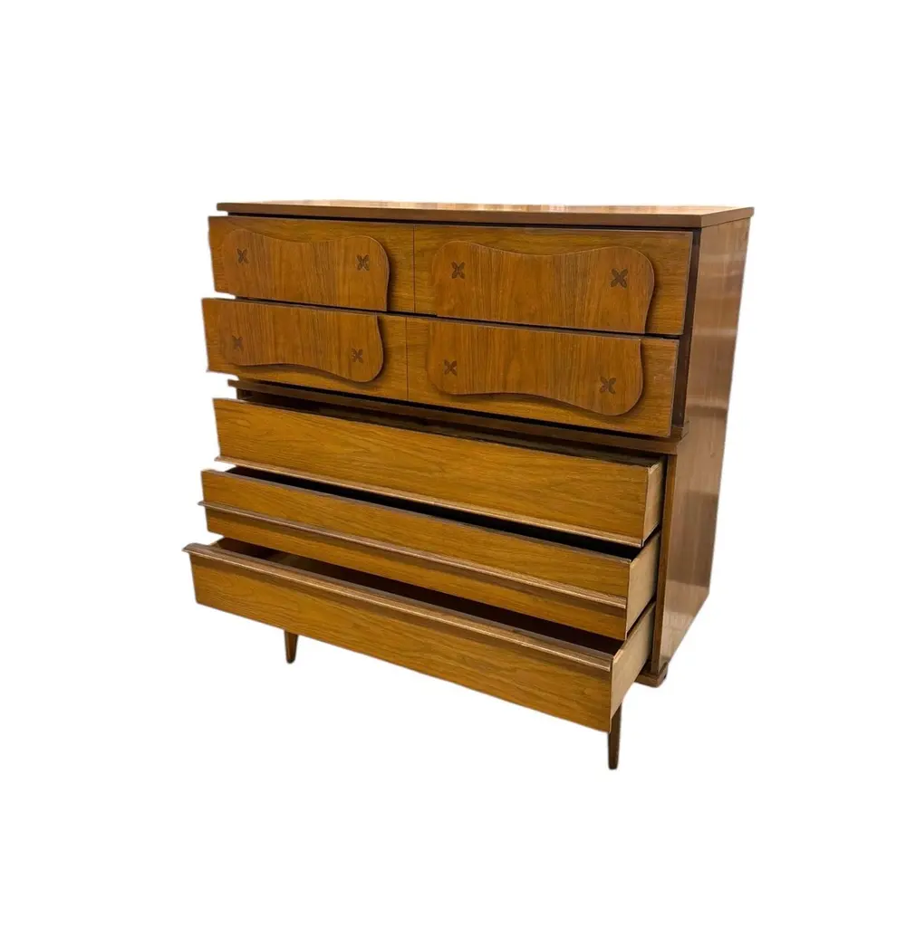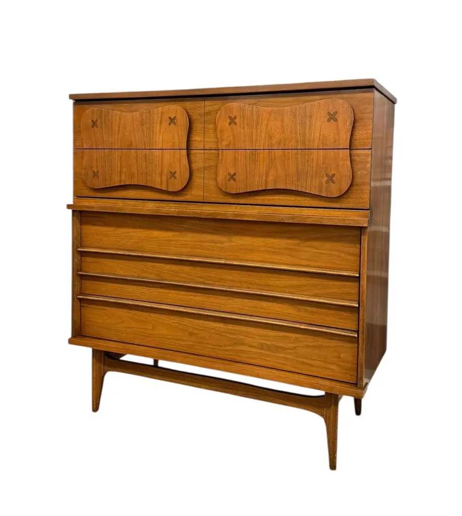 This rare Bassett Furniture dresser from the iconic “Monterey” line, designed by Leo Jiranek, was produced for only 10 months between 1962 and 1963. Crafted with a walnut veneer over solid wood, the set includes 5-drawer dresser and 9-drawer dresser adorned with sculpted rosewood “X” inlays that double as drawer pulls. The dresser’s sculptured legs and aprons, paired with its warm Carmel Walnut finish, reflect a seamless blend of Scandinavian-inspired design and American contemporary style.Dimensions Tallboy: 42"W × 18"D x 45"HDimensions Lowboy: 64”W × 18”D × 30.5”HCondition: Professionally restored, this vintage piece exhibits minor signs of wear consistent with its age and prior use, adding to its authentic charm.About the Monterey Line:Bassett’s “Monterey” collection is celebrated for its forward-thinking design, combining generous proportions with meticulous details. The rosewood inlays, horizontal wood pulls, and elegant walnut veneers create a timeless aesthetic, making this dresser a standout addition to any modern or mid-century-inspired space.