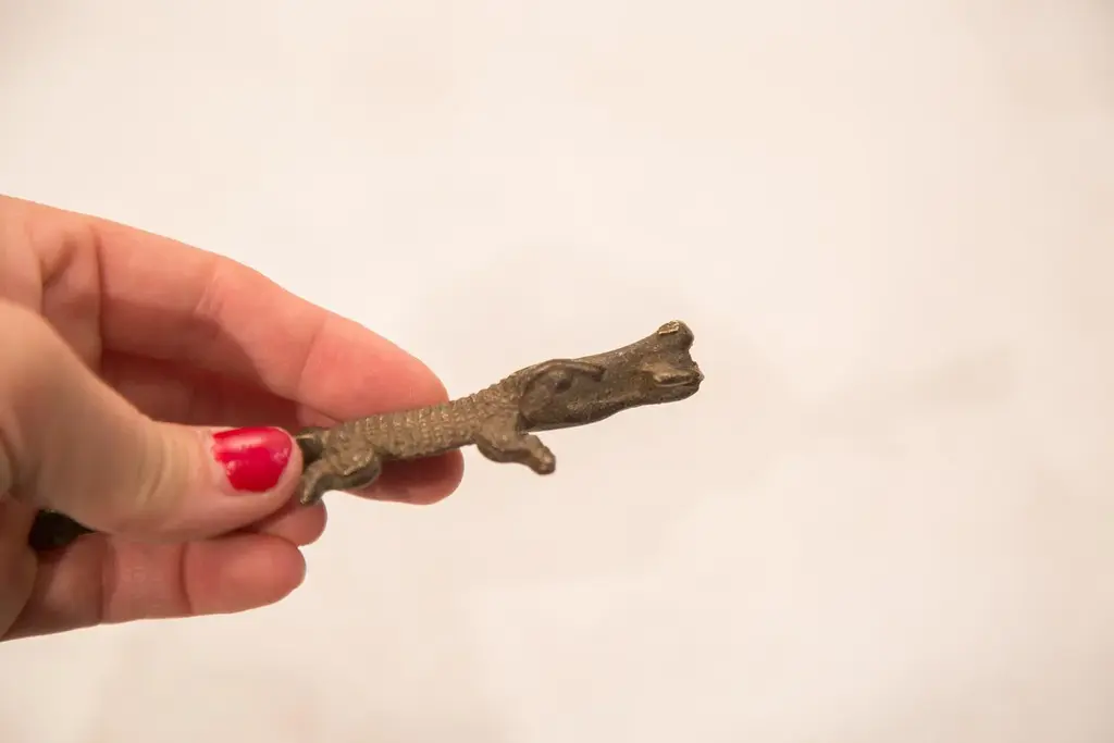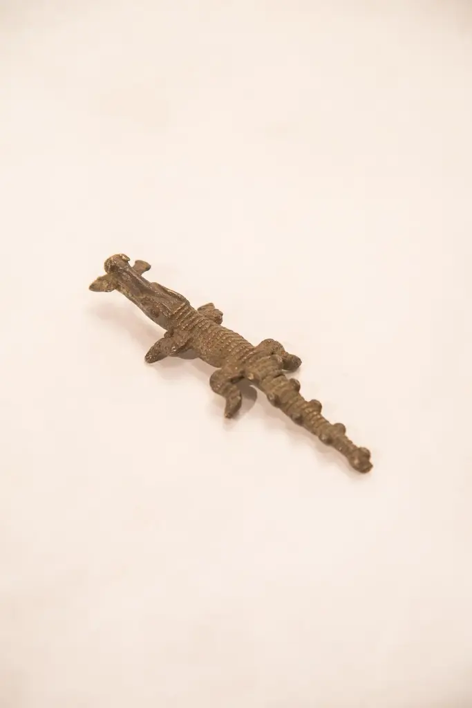 :: Vintage handmade bronze African sculpture of a crocodile with a fish in its mouth. Circa mid 20th century and possibly older, this piece has such incredible handmade charm and no two are identical. As this item is in vintage condition, it may show signs of age and use. Ashanti gold weights are also named Mbramoo and this may be an example of an Ashanti gold weight, used in the measuring of gold and gold dust. Create a scene of wildlife with many of our vintage African animal sculptures or add just one to the shelf, these are beautiful collectibles that you or someone you love will cherish forever. Kindly note the item photographed may not necessarily be an identical to that which you receive. This listing is for a one of a kind handmade item, however, we do have multiples which are being sold under one parent listing. Minor and subtle differences may apply to the finish, dimensions, slight imperfections, and in some cases a male or female being substituted interchangeably.
