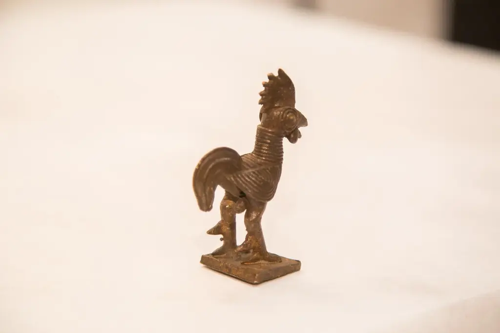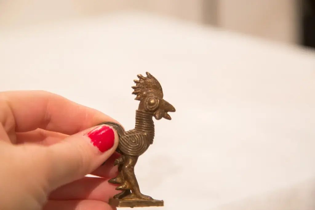 :: Vintage handmade bronze sculpture of a rooster with dark iron-like patina, and what appears to be some kind of armor, and its feet on a platform. Circa mid 20th century and possibly older, this piece has such incredible handmade charm and no two are identical. As this item is in vintage condition, it may show signs of age and use. Ashanti gold weights are also named Mbramoo and this may be an example of an Ashanti gold weight, used in the measuring of gold and gold dust. Create a scene of wildlife with many of our vintage African animal sculptures or add just one to the shelf, these are beautiful collectibles that you or someone you love will cherish forever. Kindly note the item photographed may not necessarily be an identical to that which you receive. This listing is for a one of a kind handmade item, however, we do have multiples which are being sold under one parent listing. Minor and subtle differences may apply to the finish, dimensions, slight imperfections, and in some cases a male or female being substituted interchangeably.