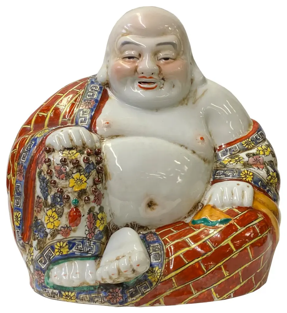 This is a Chinese Happy Laughing Buddha statue in Orange off-white color porcelain with a vintage rustic finishing touch. He is in a sitting posture with a hand holding a praying bead. It has precise detail on the hands and accessories.Dimensions: 6"x d4.5"X h6.5"( approx )Origin: ChinaMaterial: PorcelainCondition: handmade, vintage finish with black marks.