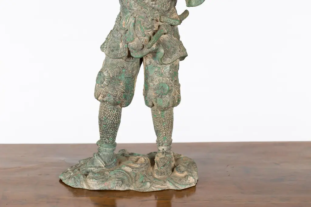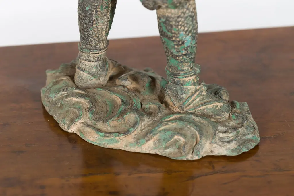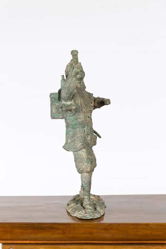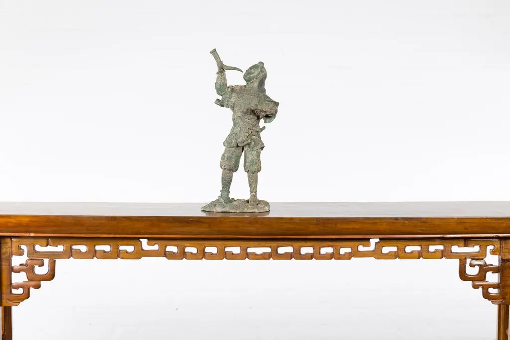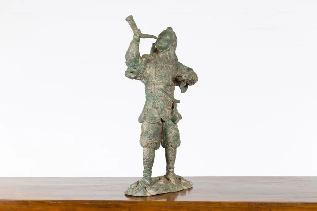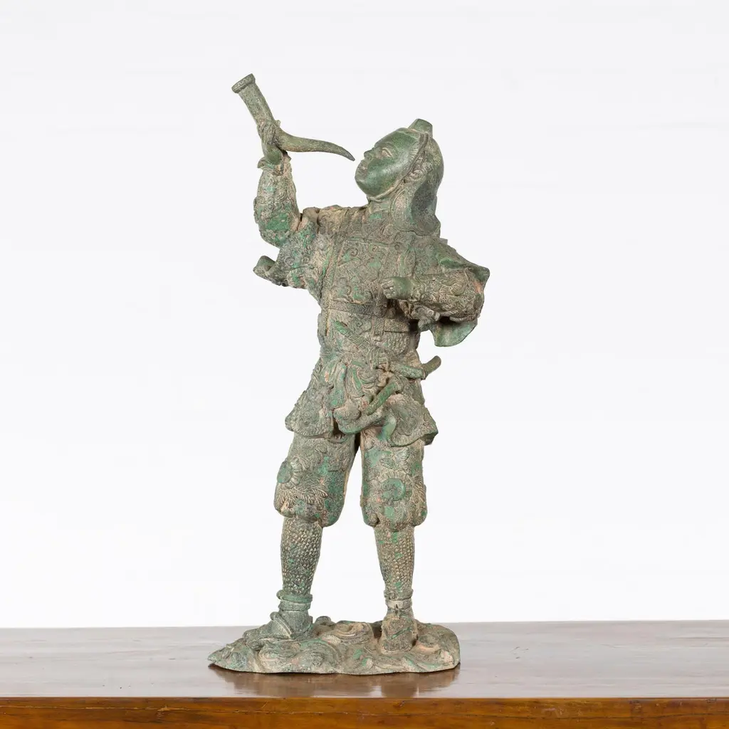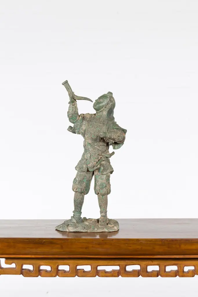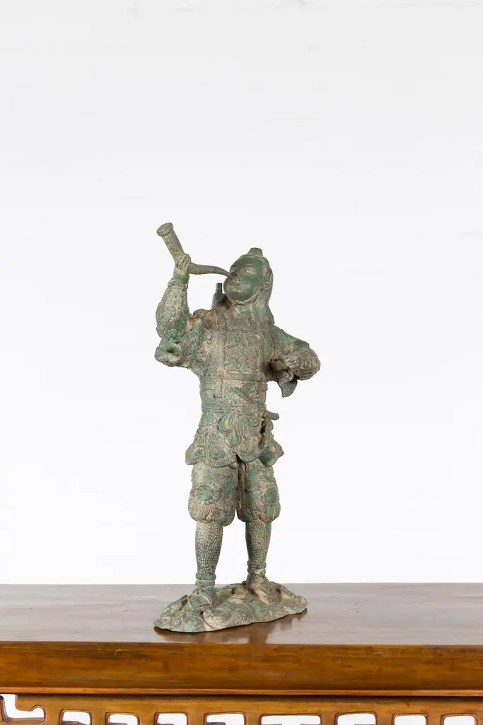A vintage lost wax cast bronze statuette of a soldier holding a horn in verde patina. Created with the traditional technique of the lost-wax (à la cire perdue) which allows for great precision and finesse in the details, this bronze statuette depicts a soldier holding a horn in his right hand, ready to blow it. Presenting great details particularly visible on his uniform adorned with curly clouds and floral motifs and wearing simple sandals, he is resting on a oblong base with scrolling patterns. Boasting a nice verde patina, this bronze statuette will be an excellent addition to any table top or shelf!