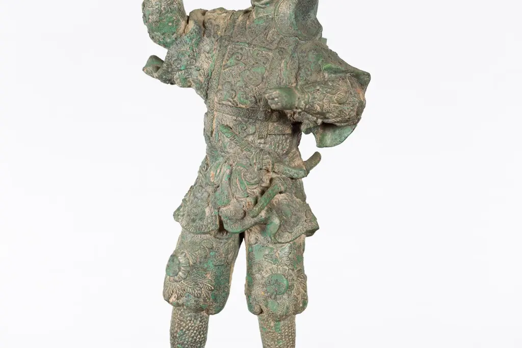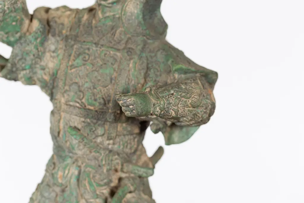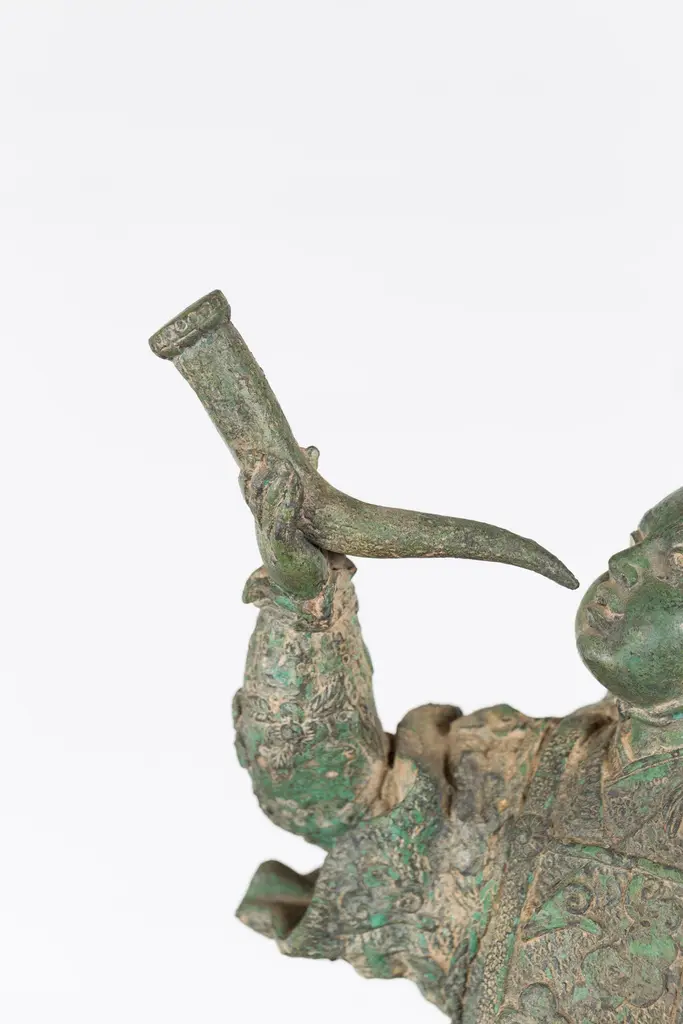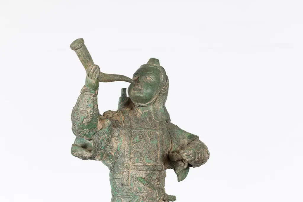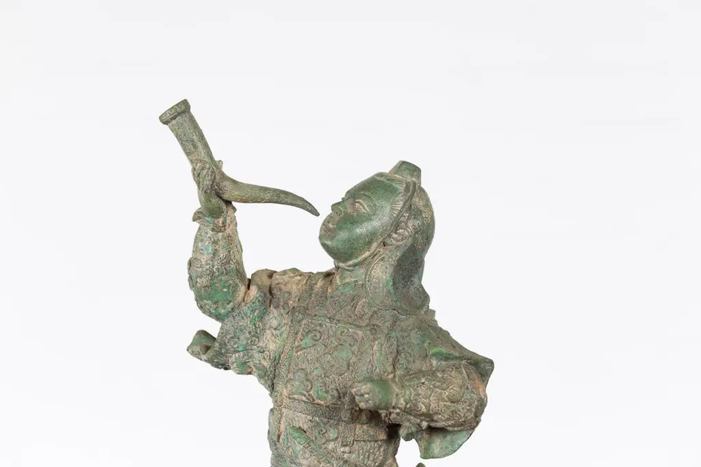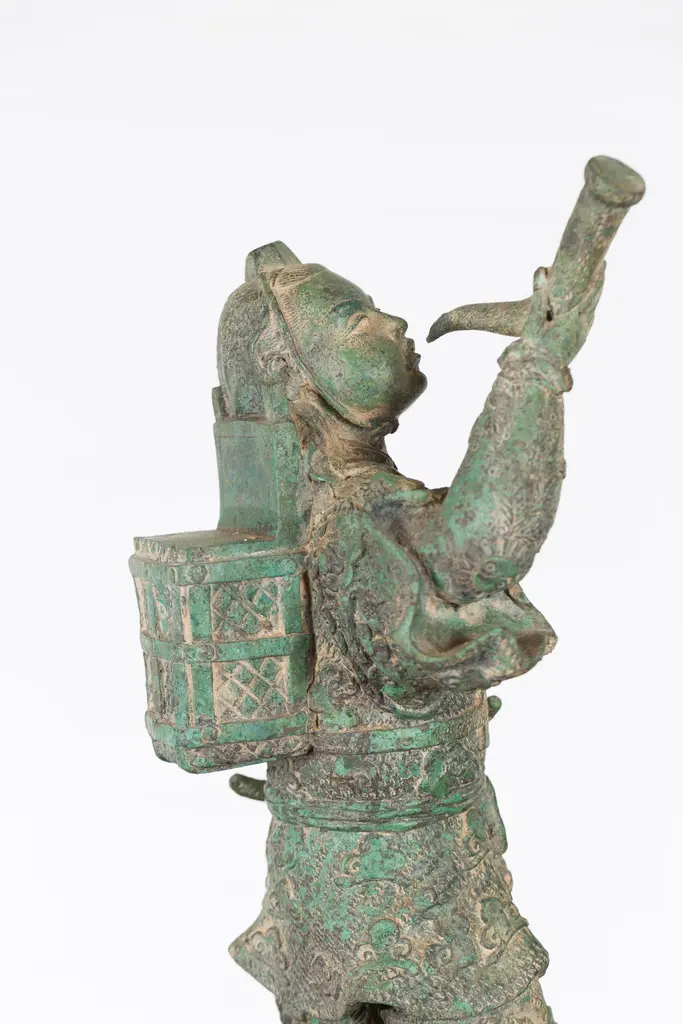 Vintage Lost Wax Cast Verde Bronze Statuette Of A Soldier Holding A Horn