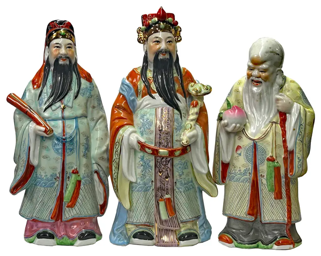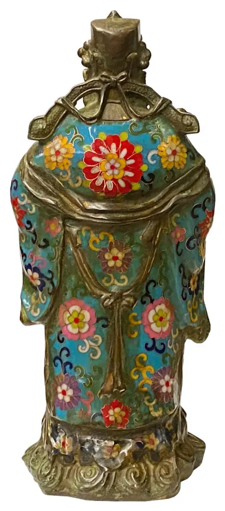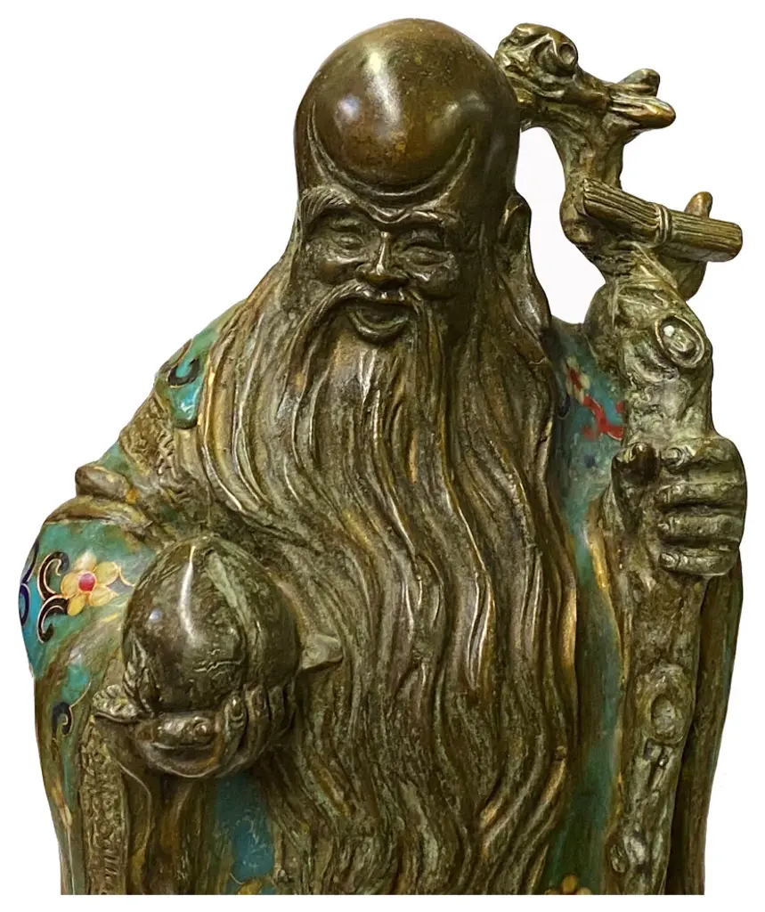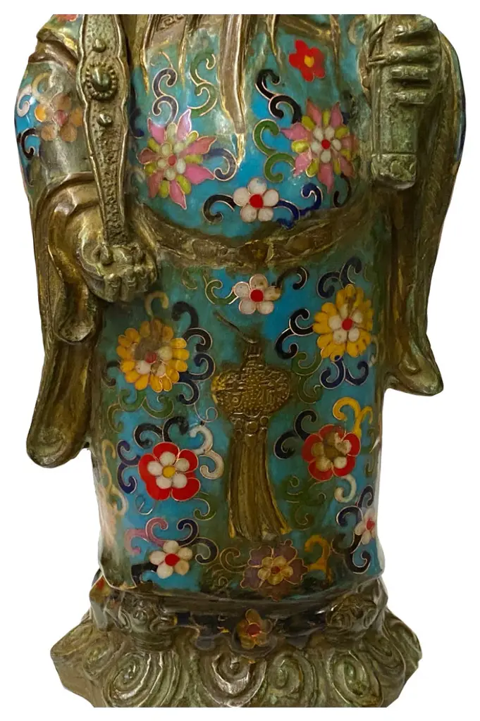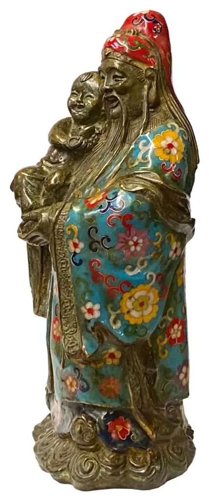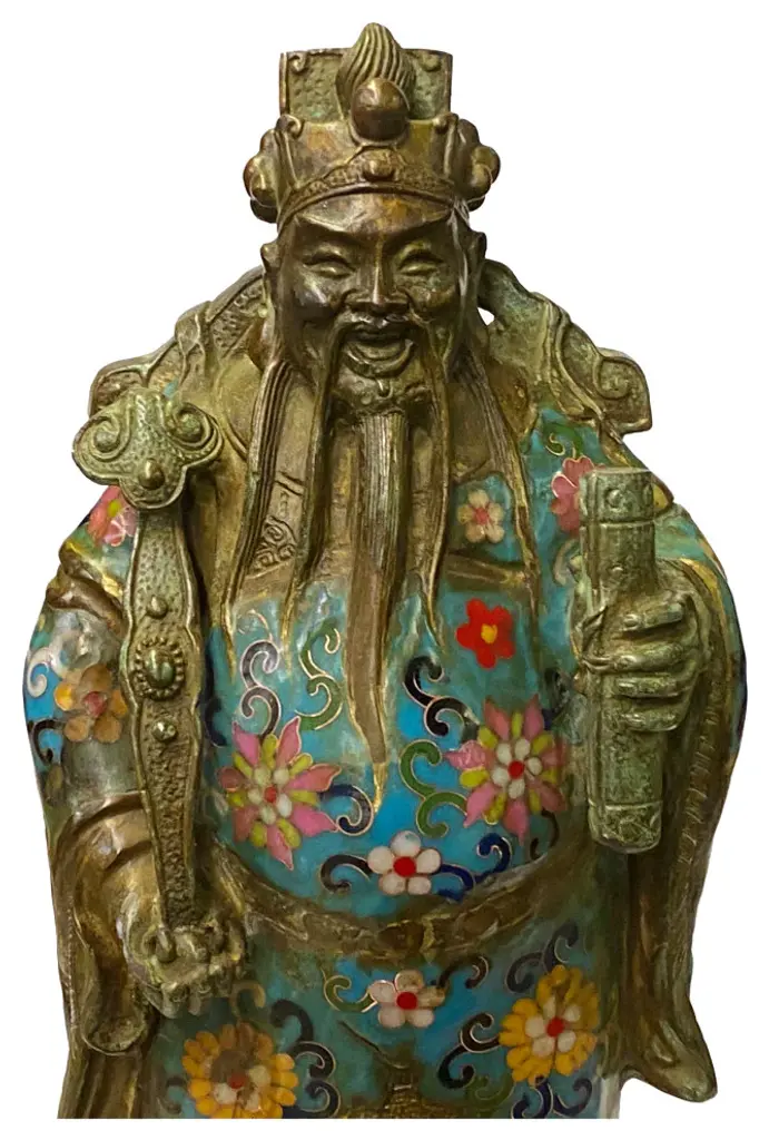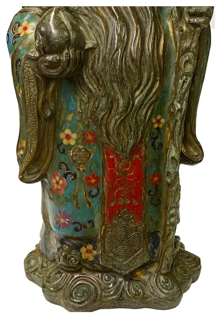 This is a set of 3 pieces of traditional oriental Chinese SanXing Fu Lu Shou statues made of metal and covered with blue and yellow multi-color enamel color. The main body is in a bronze color with a relief motif. The dress is in a floral theme cloisonne enamel pigment finish.Dimensions: 6" x 5"x h13.5" +-1" approximate eachOrigin: ChinaMaterial: MetalCondition: Handmade, Vintage style finish, wear out marks, minor color off, rust