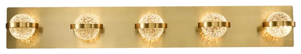Transform your bathroom into a sophisticated retreat with the Regent 5-Light Bath Fixture. Whether emphasizing a contemporary flair or augmenting a vintage charm, this fixture, crafted from faceted clear optic glass with a frosted interior, is an exquisite centerpiece. Available in a satin nickel or vintage bronze finish, it"™s designed to complement diverse decoration styles seamlessly, enhancing your bathroom space with its sleek and chic presence. The Regent fixture combines aesthetic prowess with functional efficiency, featuring five 3W G9 LED bulbs to deliver vibrant, energy-efficient illumination. Its robust construction from heavy-gauge steel ensures longevity and quality performance. Moreover, its dry and indoor ratings make it specifically engineered for bathroom use, while its elegant design adds a touch of class to any environment. - Dimensions: 5H x 32W x 5D inches - Backplate/Canopy: 1H x 6W x 4.50L inches - Wire length: 12L inches - Material: Glass and heavy-gauge steel - cETL-Listed for safety - Bulb base: G9 LED, 5 bulbs included - Finish options: Satin Nickel or Vintage Bronze - Style: Transitional - Collection: Regent