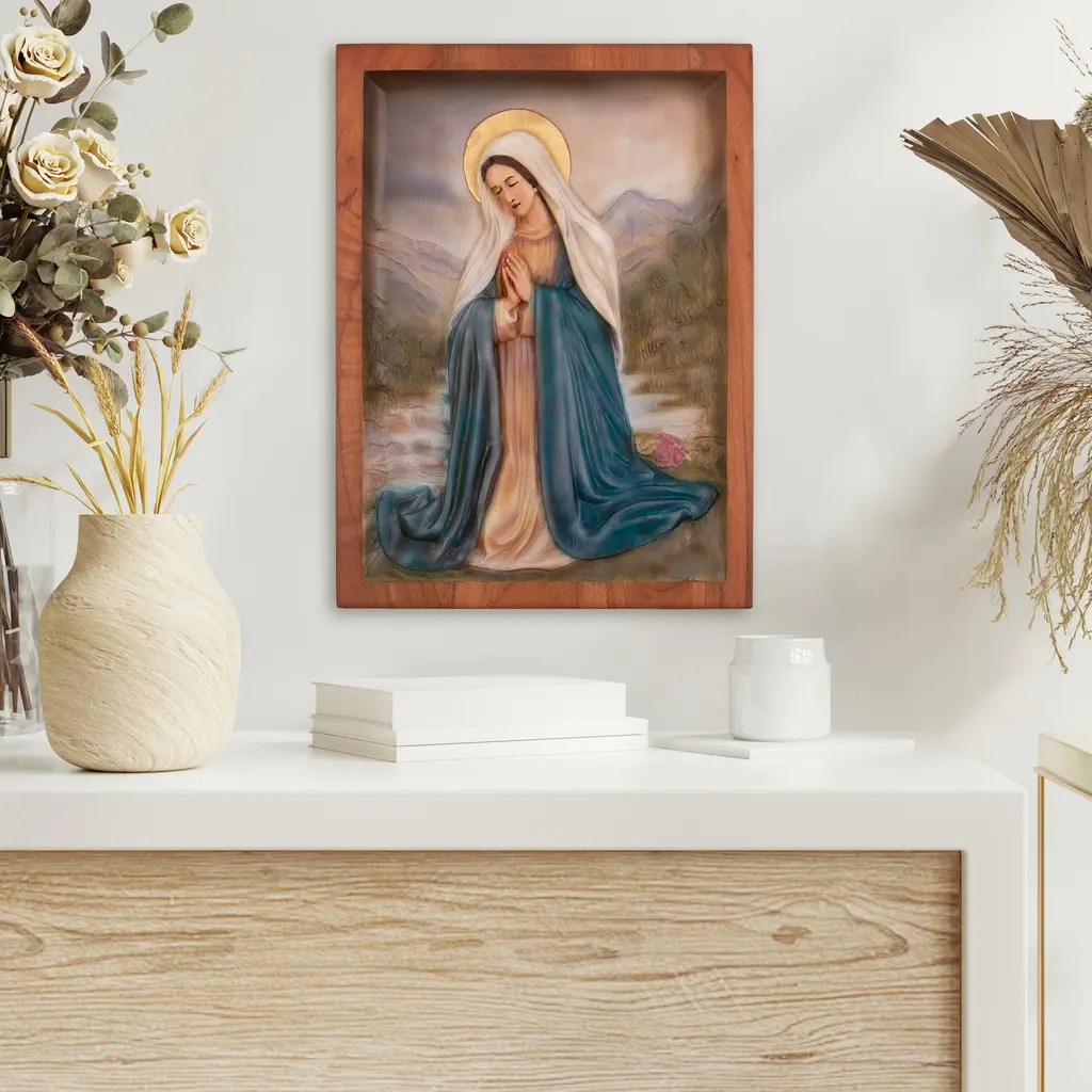 The "Virgin Mary Welcoming" sculpture depicts the Blessed Mother welcoming her followers. Finished in bronze patina with a marble base, the sculpture is a wonderful rendition of Christian faith.