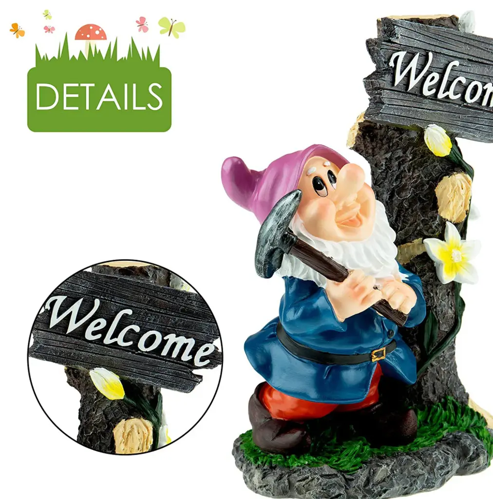 Features:- HIGH QUALITY DESIGN: Colorful handcrafted garden gnome with a classic look; weighs approximately 2 lbs, not too heavy to carry but not so light as to blow away in the elements; UV and water resistant- DURABLE YARD DECORATION: Made from high grade durable polyresin to weather the outdoors for years to come; display this garden gnome statue in your garden, lawn, patio, or even indoors- FOR OUTDOORS & INDOORS: Garden gnome statue is around 9.4 inches tall and fits any garden or shelf; watch guests smile as they discover your bearded friends- PERFECT GIFT IDEA: An excellent gift for friends & family; compact size makes it an excellent home & office decoration, while durable polyresin design makes it perfect for outdoors