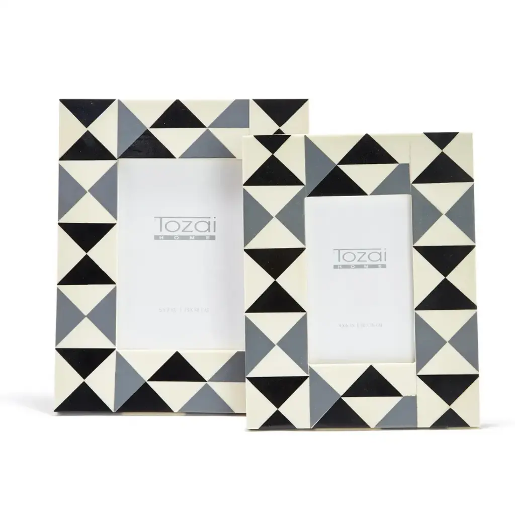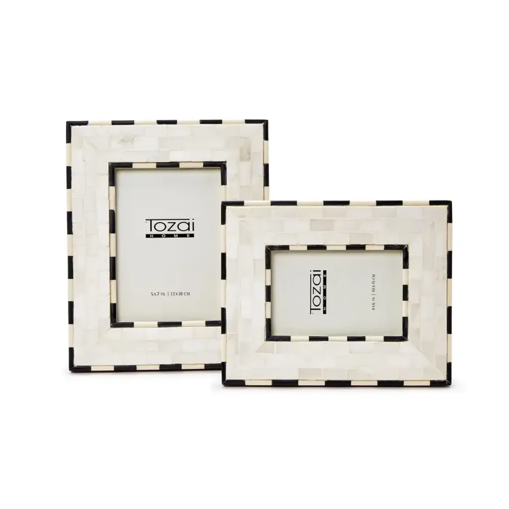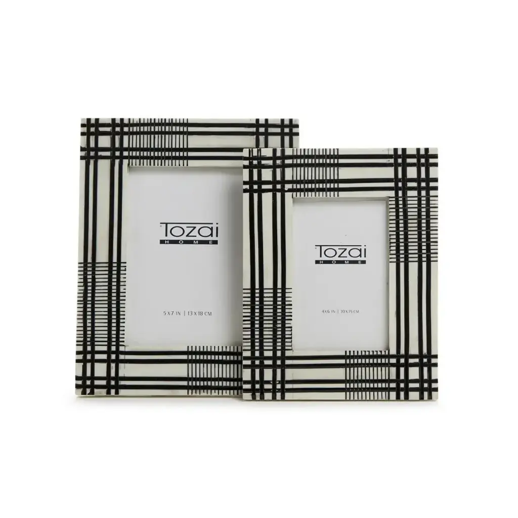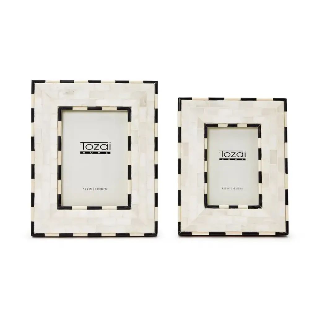 So modern but so chic. This frame is beautifully hand made by skilled artisans of natural bone. Each piece is hand cut and placed symmetrically to create a sculptured graphic look. With the added accents of a checkerboard boarder these will be a welcome addition to many decors.