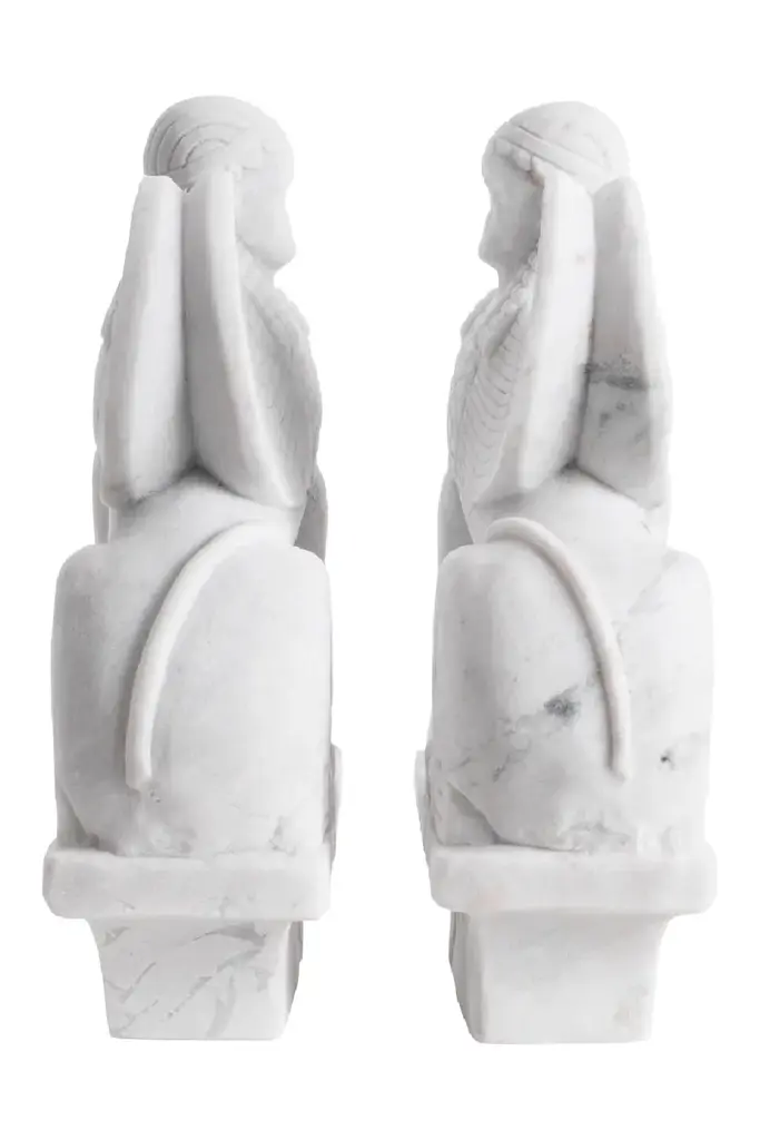The "Sphinx Set of 2" brings the mystique of ancient Egypt to your space. Crafted from white marble with meticulous handwork, each piece is a unique work of art, marked by variations in color and veining. Measuring W. 8, D. 4, and H. 12 inches per item, these sphinxes once graced the grave shaft of Philinos or Thalinos during the sixth century B.C. This set is a testament to the early Archaic period's fusion of Greek and Egyptian sculptural styles, bearing the same stylized features and architectural influences. Let them stand as guardians of history and beauty in your home.HISTORIC PROVENANCEThe Object Sphinx Set of Two is inspired by a marble sphinx (ca. 580–575 B.C.) on a cavetto capital—its carved, curved base—dating back to Greece’s Archaic period. The marble sculpture, now in the collection of The Metropolitan Museum in New York, once topped the tall grave shaft of a young man named Philinos or Thalinos, and belongs to the earliest type of grave stele produced in Attica during the 6th century B.C. In the early Archaic period, Greek sculptors took design cues from the Egyptians for large-scale monuments. This example has a four-sided structure with flat, stylized features. Our reproductions come as a pair and have been handcrafted in sophisticated white marble, so that each piece shows variations in color and natural veins.