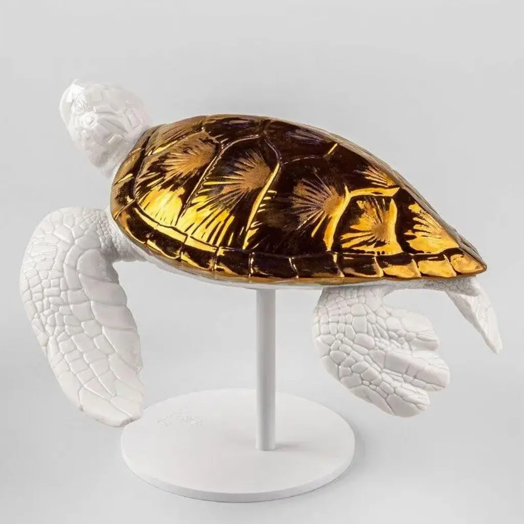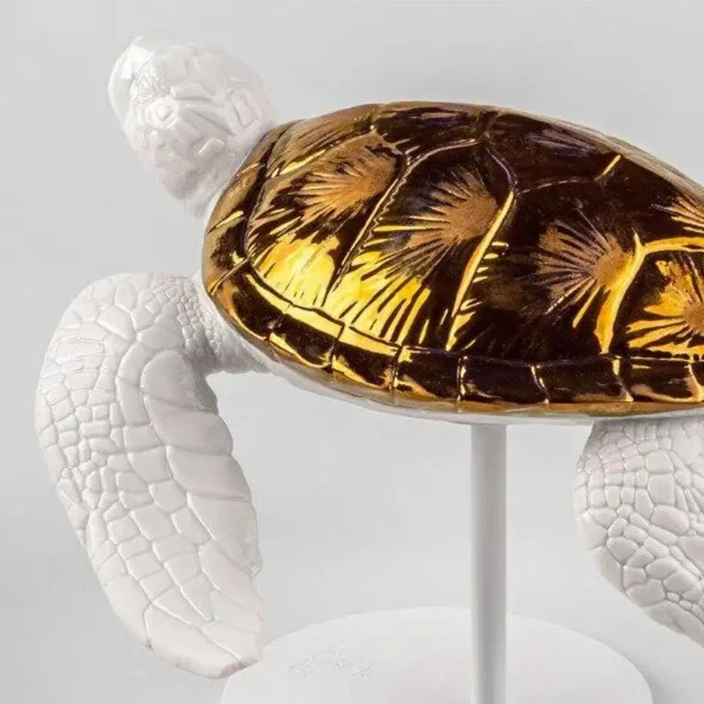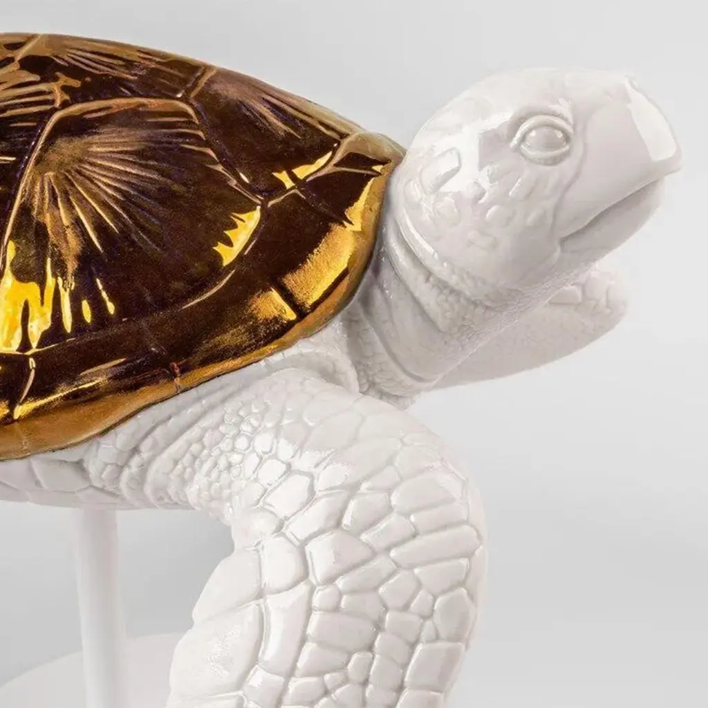 Sculpture White Tortoise B with all structure in porcelain in shiny finish and in glazed copper lustrous finish. Sculpture on white matte metal base.