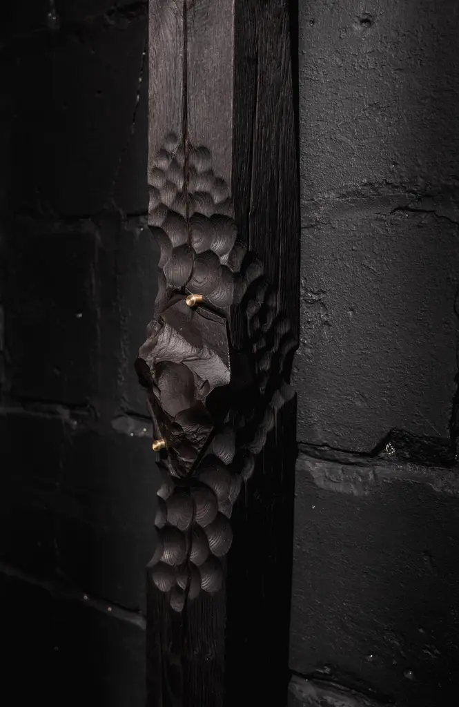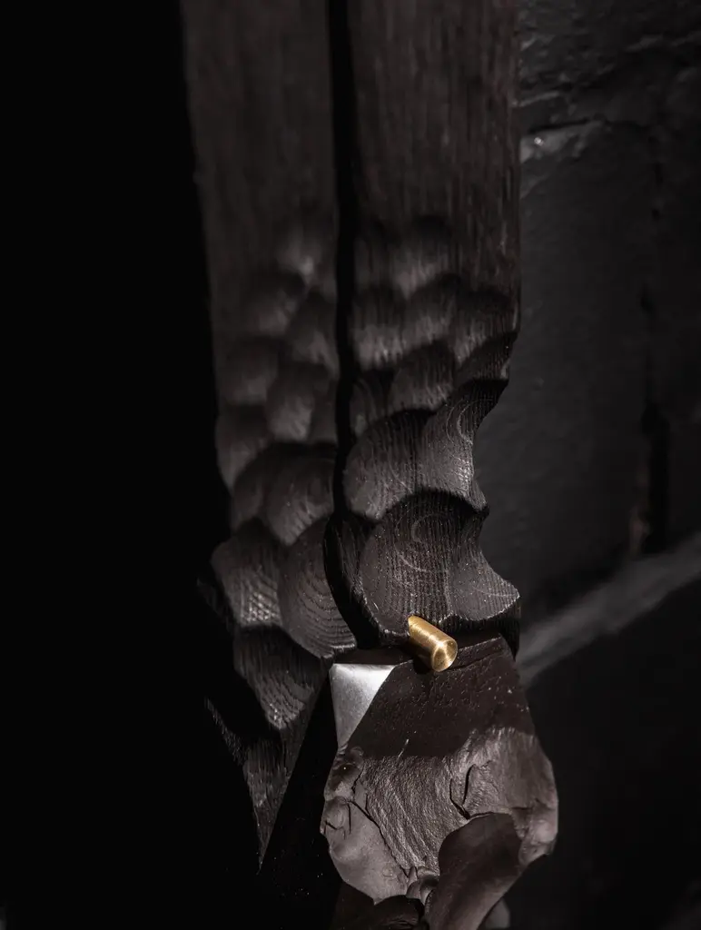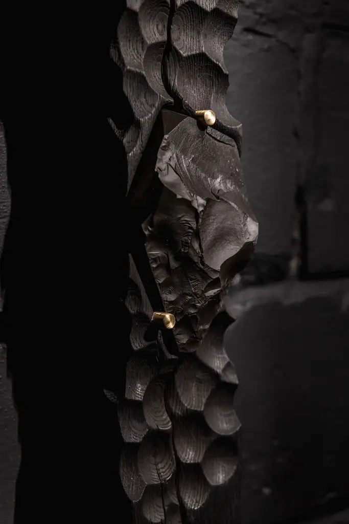 Witness 04 Unique Charcoal wall sculpture by Jeremy DescampsUnique pieceDimensions: W 12 x D 12 x H 185 cmMaterials: Oak, brass, marble.Jeremy Descamps Born in Namur, July 7, 1987 Always attracted to manual trades, he went on to study as a lathe miller and made it his profession for more than ten years. It was in 2016 that he used his technical skills and his sensitivity to make his first creations, which will remain in the private sphere. It was the interest that these creations aroused in his entourage that prompted him to take the plunge and embark on the LFN adventure. He therefore embarked on the creation of tailor-made furniture for private and professional alike. This has enabled him to have nice collaborations such as the one with the Hors Champs restaurant. He also creates an annual collection, ORIGIN, made up of a range of home accessories, produced in very small series. Today LFN is evolving.Custom-made creations give way to total and unconstrained creation in the world of fine art furniture. He decides to present his creations made of wood only under the "Shu sugi ban" technique to mark his identity, his DNA, his black country in deep black (= Charleroi)He learns the previous gestures to cut and shape stone, a material he is particularly fond of. Supported by the benevolence of a former stonemason well known in Belgian quarries, it is the energy of the past that resurfaces in his creationsBrass makes its entry, as well as copper.Jeremy is an artist whose main concern is to share, provide emotions, give meaning to objects, sublimate shades of black, textures.He meets people, in particular that of Caroline NOTTE, architect whose presentations are no longer to be made.From this meeting was born a collaboration since she offered to exhibit two creations in his famous house designed by Louis Herman De Koninck.A great introduction to the world of fine art furniture, as well as the various requests from the famous VILLAS magazine to appear in their issues.
