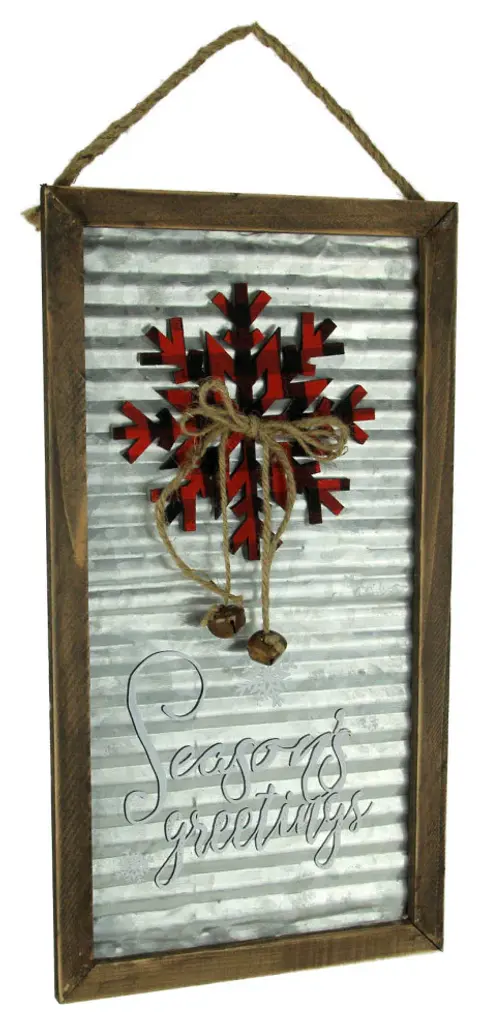 OVERALL SIZE - 19.25 Inches High, 10.5 Inches Long, 1 Inch WideMade of Galvanized Metal with a Washboard Texture in a Wood Frame with a Jute Rope Hanger at the TopFeatures a Red Buffalo Plaid Cutout Metal Snowflake Sculpture with a Jute Bow and Jingle Bells and the Words Seasons Greeting in White Near the BottomBrings a Rustic Touch Filled with the Spirit of Christmas to Any Home Decor SettingA Merry Addition to Your Holiday Decor that Looks Great Hanging On the On the Wall or On Your Front PorchBring a festive addition to your holiday decorating with this season''s greetings wall hanging. It''s made of metal with a washboard texture inside a wood frame and decorated with a cutout metal red buffalo plaid snowflake with a jute bow and jingle bells, and the words Seasons Greetings in white are near the bottom. It brings a rustic touch filled with a rustic Christmas spirit to any home decor setting. Hang it on the wall or on the front door from the jute rope hanger at the top. Deck the mantel, wall, or hall with this 19.25-inch high, 10.5-inch long, 1-inch wide festive Christmas decor wall hanging.