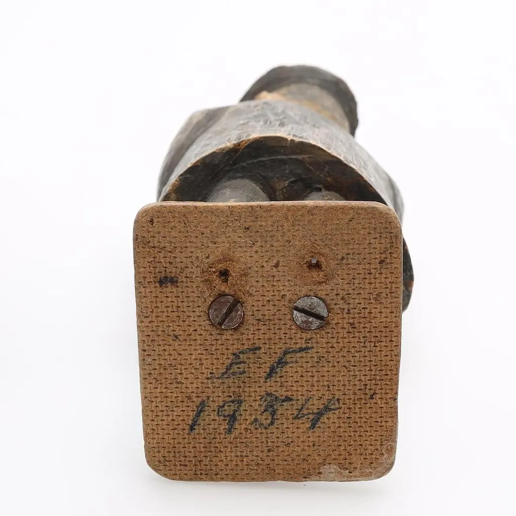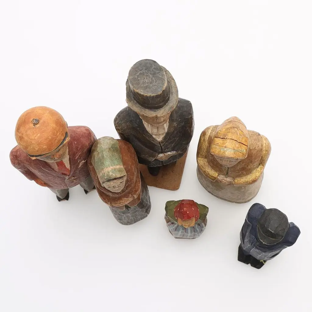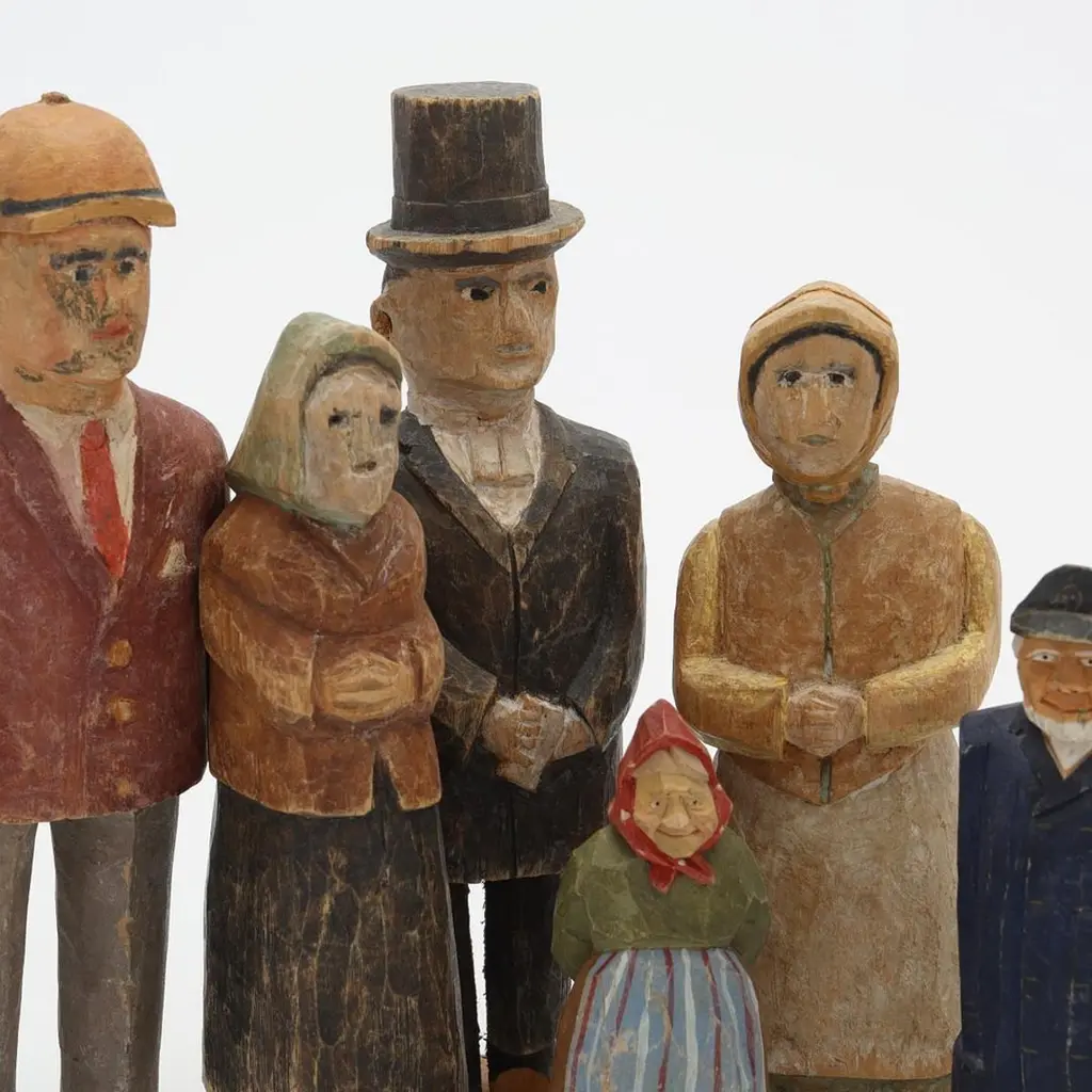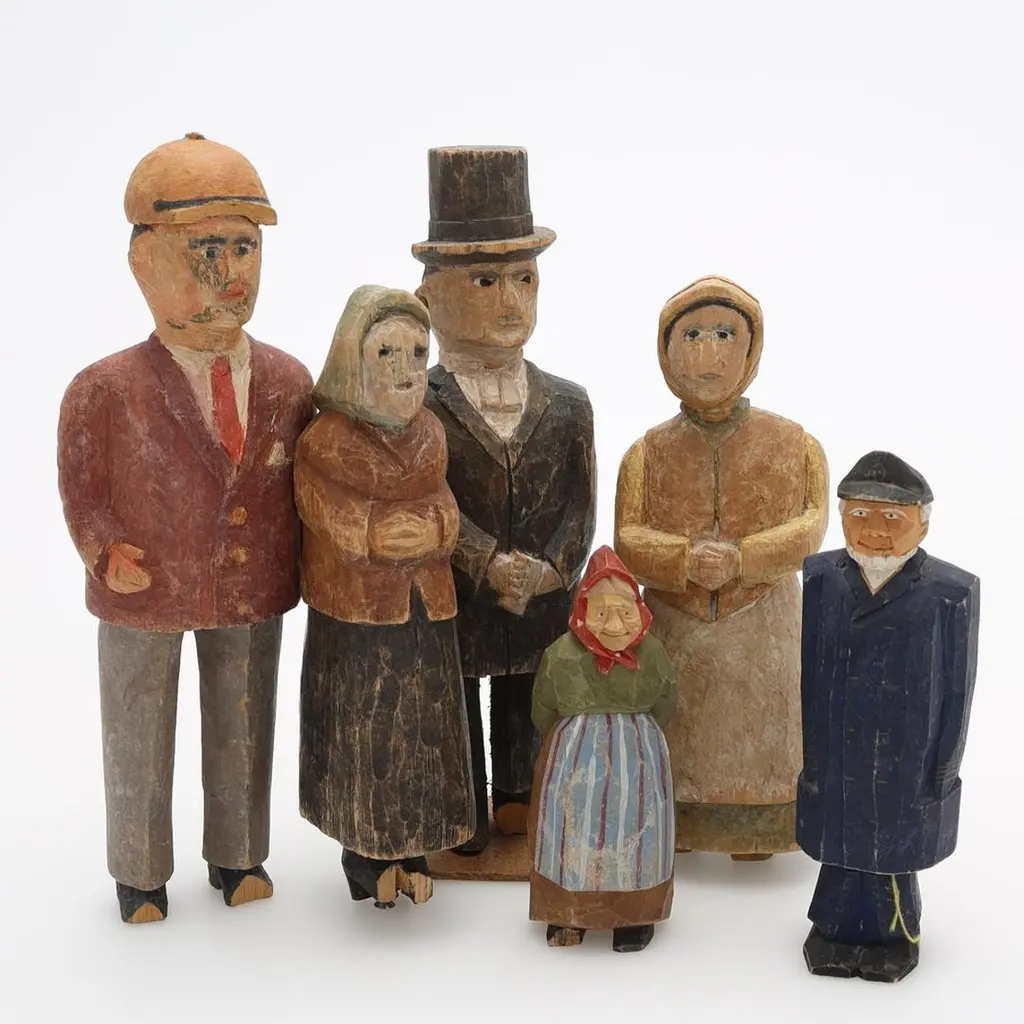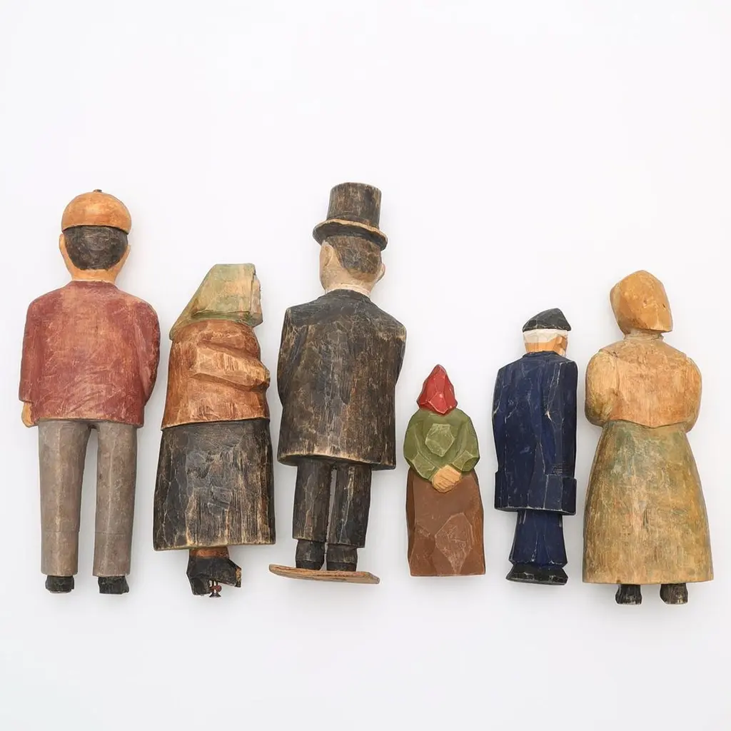 Beautifully stylized a set of 6 figurines with a great balance of harmony stood, portrays the beauty of the inner world through pure beauty.This Valuable unique art piece is a great chance to bring your office or home decor and interior an artistic characteristic.Signed by EF 1934, was one of the recognized Swedish masters of 20th-century woodcarving, most famous for the Scandinavian flat-plane style of woodcarving.EF generally carved solo figures from basswood or pine and mounted them on a base. He had a stylized execution with clean cuts, working from a single piece of wood. A highlight of Trygg's carvings is his use of vibrant paint. He often painted his character's clothing in plaid.A Set Of 6 Antique Decorative Wooden Figurine of a Family Carving Sculptures.Height 12 - 22 cm.In excellent condition.