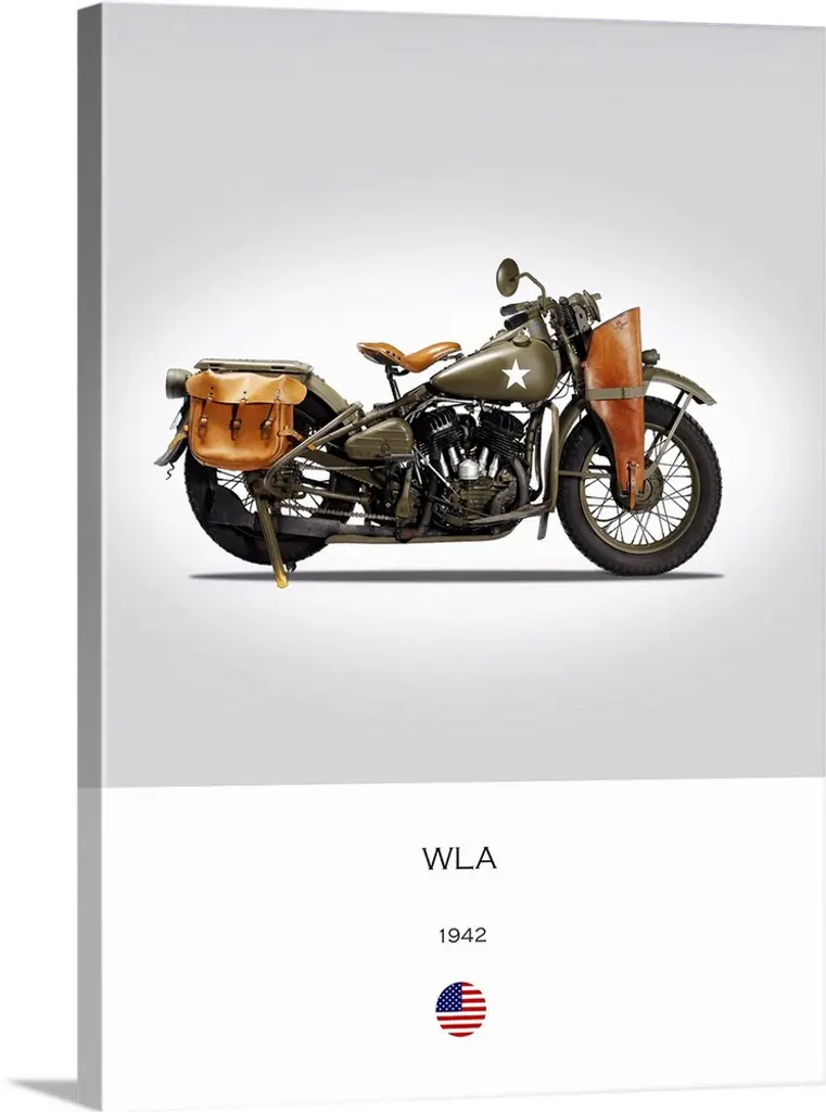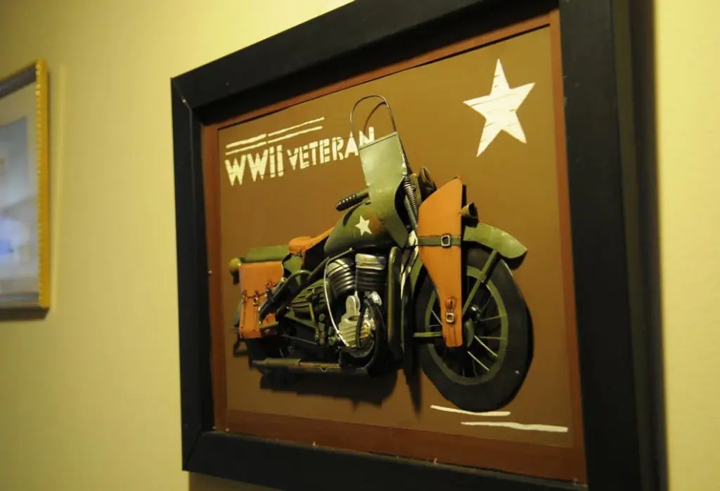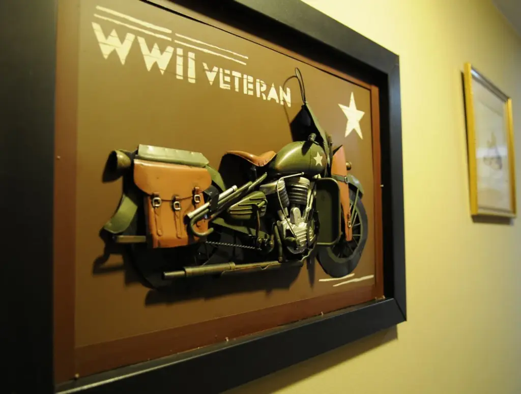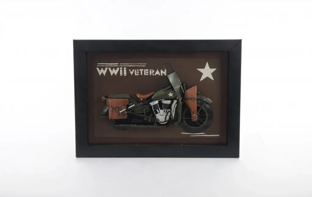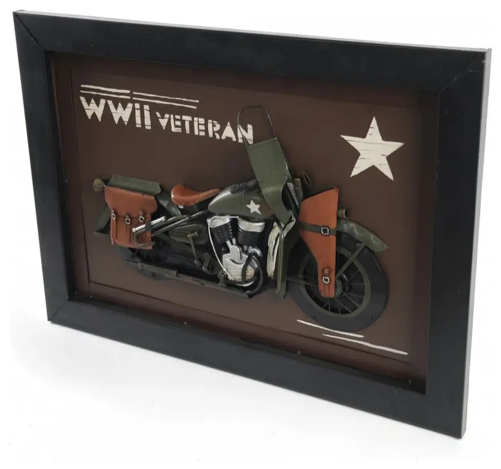 Eye-catching and super cool, the WWII Harley Motorcycle Wall Sculpture is a unique handmade metal replica of Harley Davidson XA. It features many original details, such as a V-twin engine, storage compartment, gas tank, and gun pouch. It comes on a vintage frame making it perfect for displaying on walls. 1.5" x 27.5" x 20"