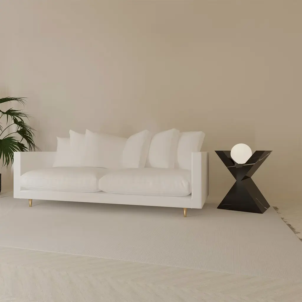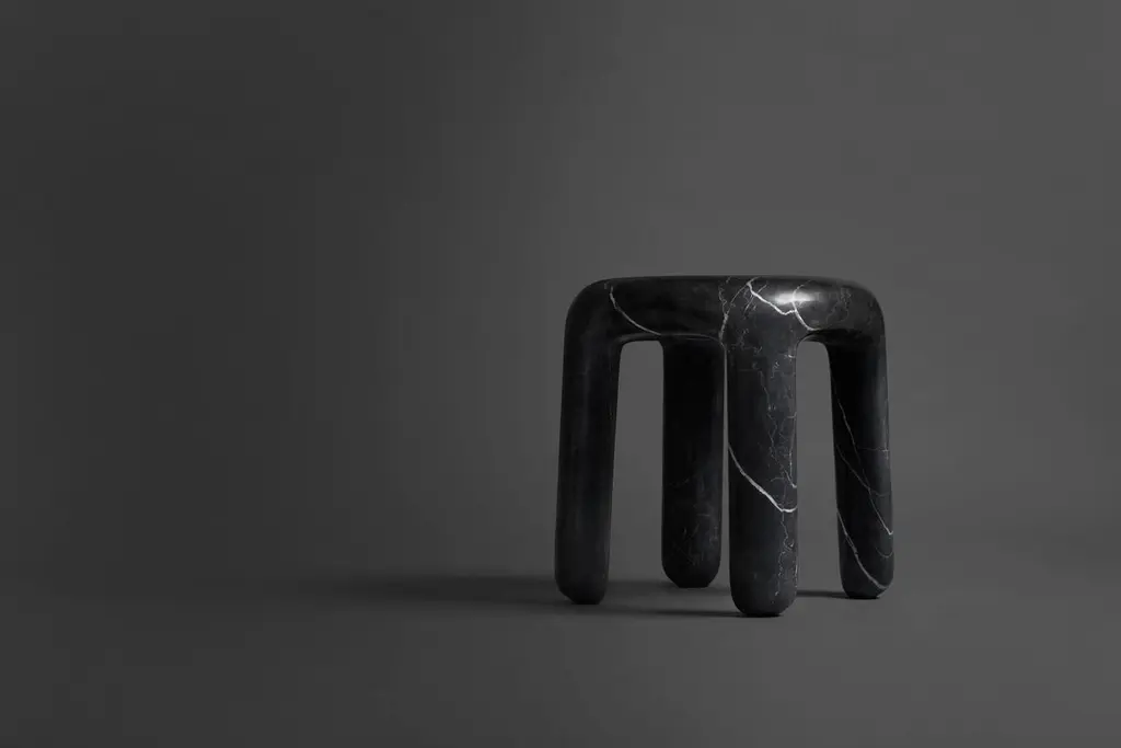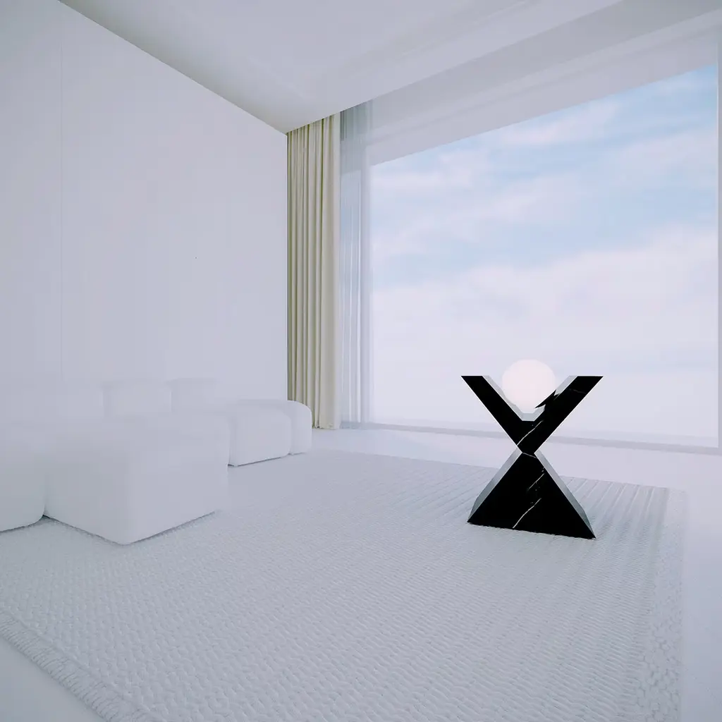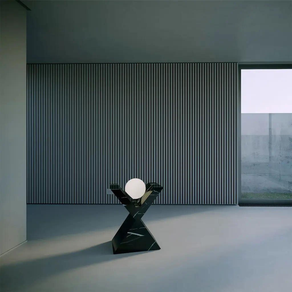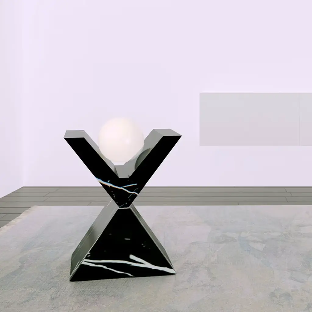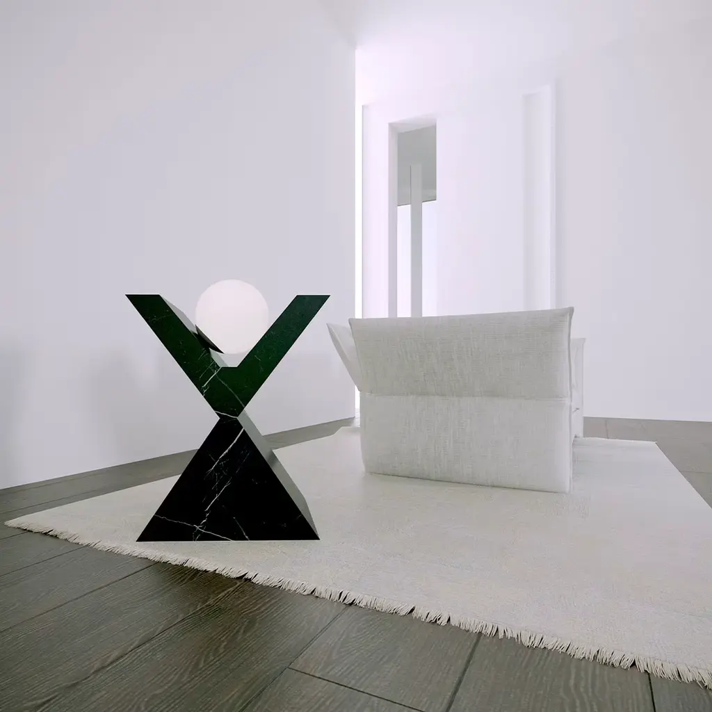 A dynamic and sharply-cut X-like silhouette marks this singular sculpture in prized Marquinia marble, whose deep-black tone is naturally veiled by dynamic traceries. Set within its upper V-shaped profiles as a precious stone is set in a ring, a glass globe housing a light source provides an exceptional level of illumination.