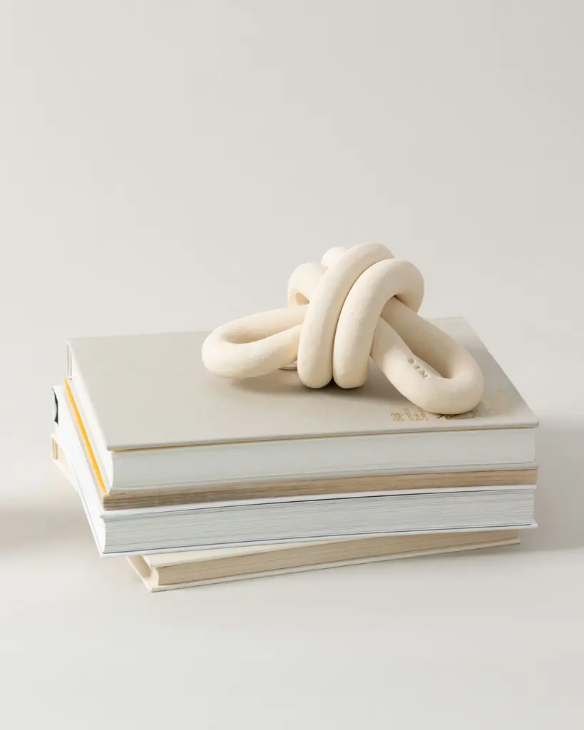 The XL Double Loop Knot (2025) is the playful big sibling to Virginia Sin's signature collection of ceramic knot sculptures. Handmade from extruded stoneware coils, it adds tactile elegance to any space, whether displayed alone or alongside a stack of your favorite books. From her Brooklyn-based studio SIN Ceramics, the multidisciplinary artist combines art and utility, pushing the limits of clay while bringing warmth to everyday objects. Crafted in the USA.