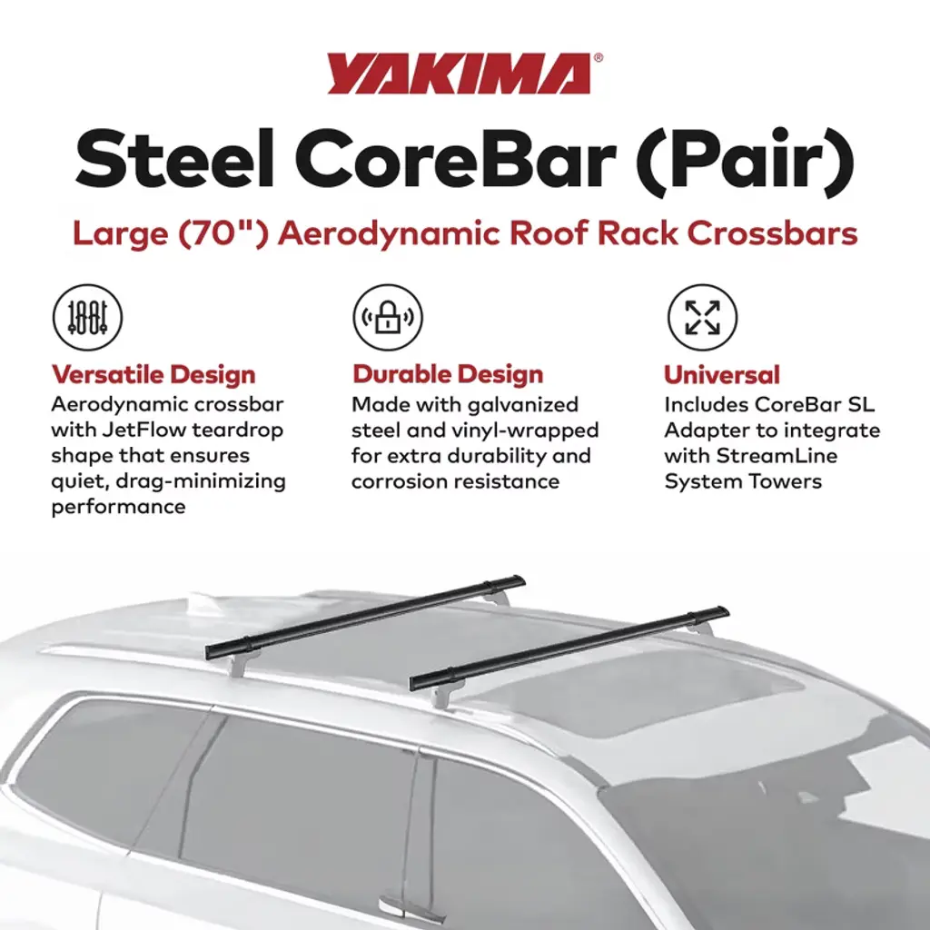 Experience the ultimate in rooftop cargo versatility with the YAKIMA 70-Inch Steel CoreBar Aerodynamic Roof Rack Crossbars. Engineered for peak performance, these crossbars boast a wind tunnel-tested JetFlow teardrop shape that combines strength, whisper-quiet operation, and exceptional aerodynamics. Crafted from roll-formed galvanized steel, these bars are the epitome of robustness, capable of securely holding your gear for any expedition. Aesthetically sleek and aerodynamic, these crossbars don't just carry your load, they also enhance the visual appeal of your vehicle. Each bar is meticulously wrapped in vinyl, ensuring longevity and formidable resistance to corrosion, ready to withstand the elements of every adventure. Integration is seamless with the included CoreBar SL adapter, effortlessly connecting to the entire StreamLine system towers range. These bars work seamlessly with Yakima gear mounts and other universal systems, offering boundless possibilities for your outdoor gear while embracing the convenience of compatibility Installation is a breeze, taking just over 60 minutes for the complete setup. With minimal assembly required, you'll be ready to hit the road in no time, your gear secured by a system designed for a carrying capacity of up to 165 pounds (75 kilograms) across 2 bars. Reach greater heights on your journeys with the 70-Inch Steel CoreBar Aerodynamic Roof Rack Crossbars from YAKIMA, committed to durability, efficiency, and a design that complements the adventure-ready spirit of your vehicle.