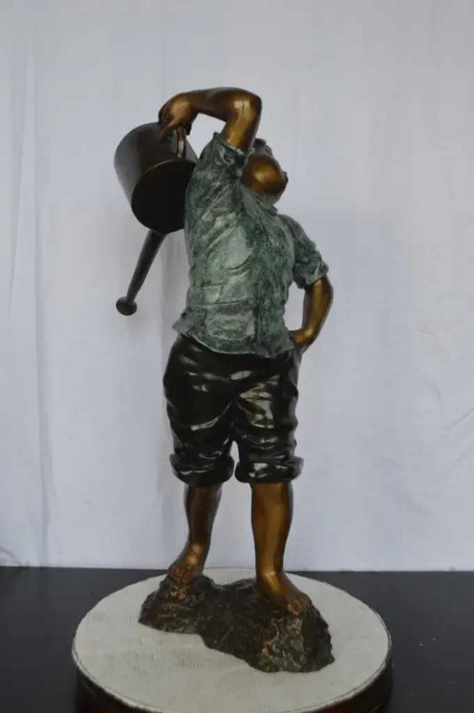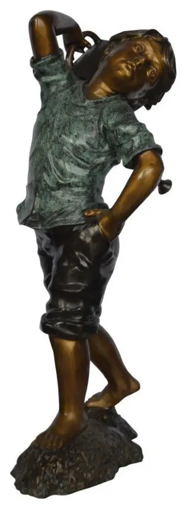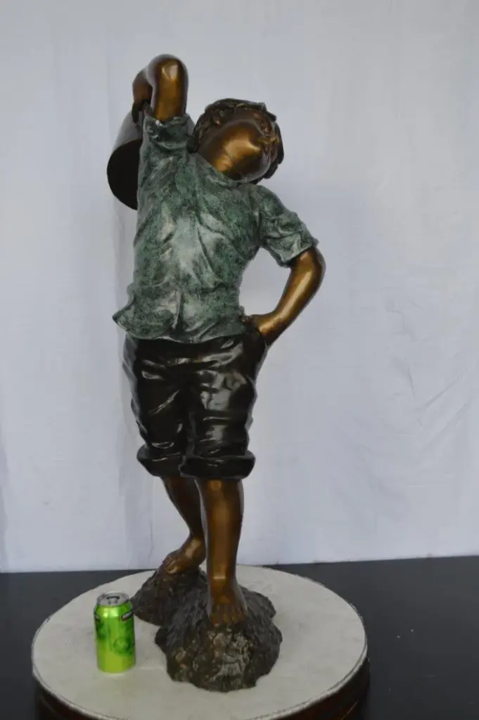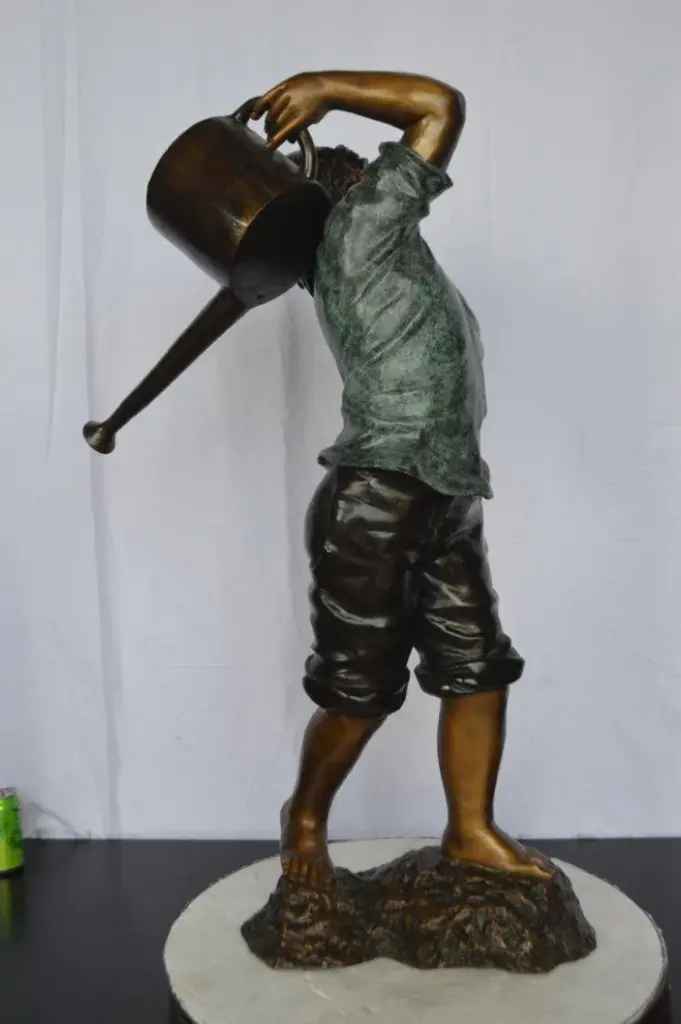 Magnificent young boy bronze sculpture "“ Fountain, holding a watering can over his head. Water spills from the watering can with the use of a fountain pump (pump not included).This sculpture is a finely crafted, highly detailed work of art. You will be very pleased with the quality of this amazing sculpture. This bronze sculpture was cast using the lost Wax Method. This impressive Bronze Statue will be a permanent fixture on the grounds of your estate for years to come. Size: 25"L x 17"W x 41"H. Weight is: 47Lb