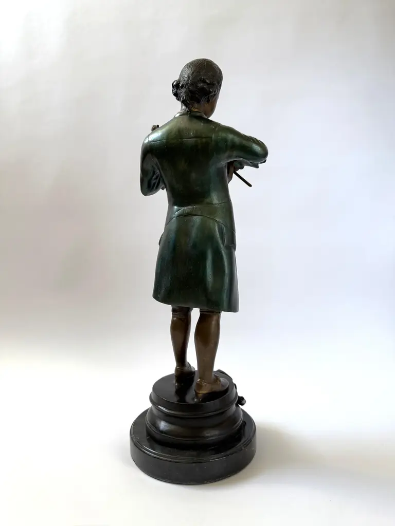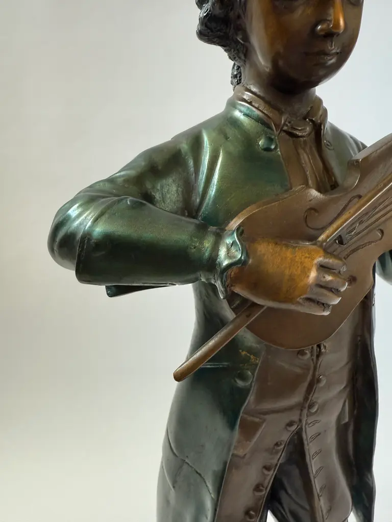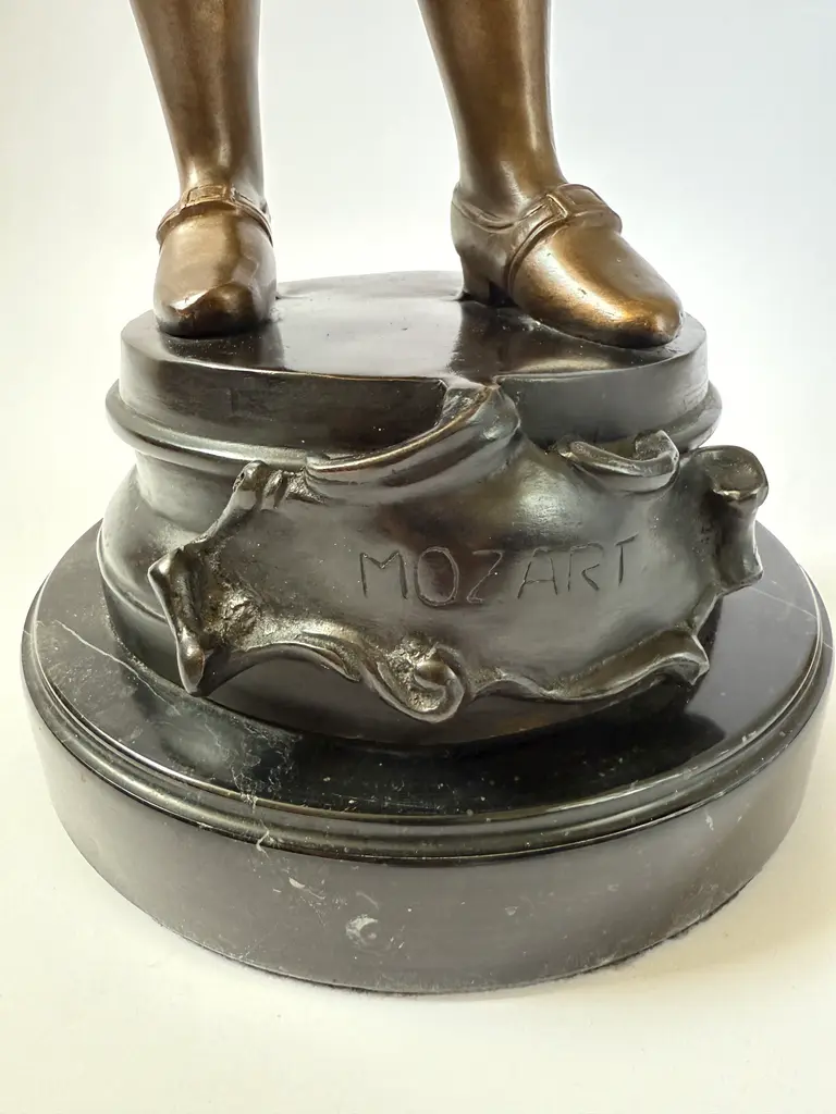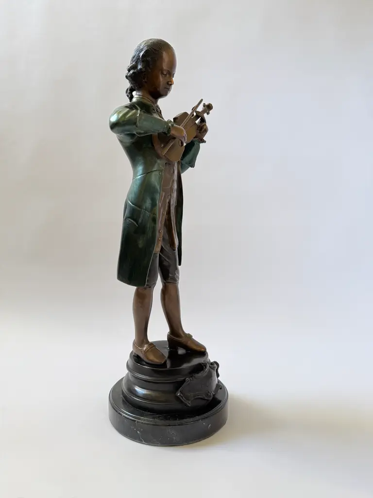 A cast bronze figure of a young Wolfgang Amadeus Mozart, modeled in the style of 19th-century European academic sculpture. The piece depicts Mozart. The green-brown coloration of the coat and warm bronze tones of the face and hands echo the techniques of French and Austrian Romantic-era sculptors. Mounted on a black marble base. This work follows the tradition of 19th-century sculptors such as Houdon and Carrier-Belleuse, who popularized refined portrait bronzes of historical and cultural icons.