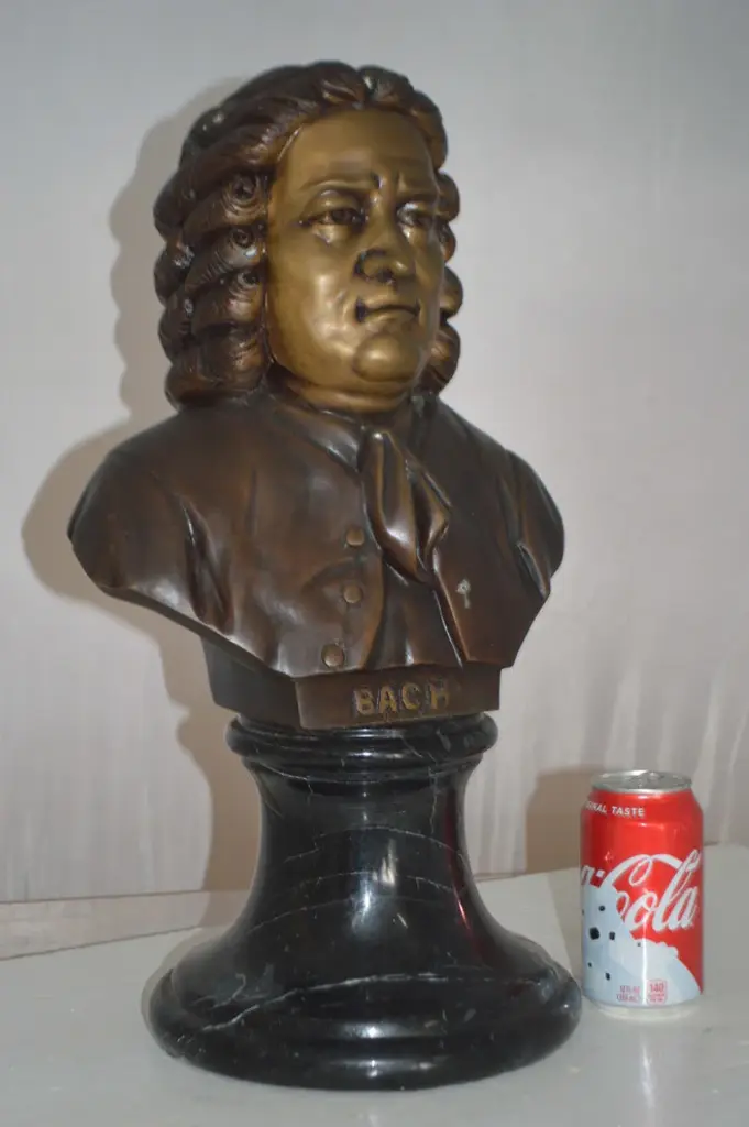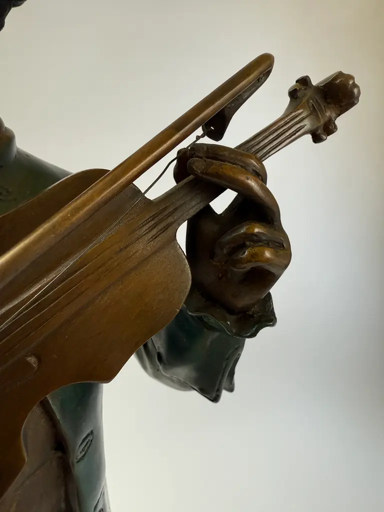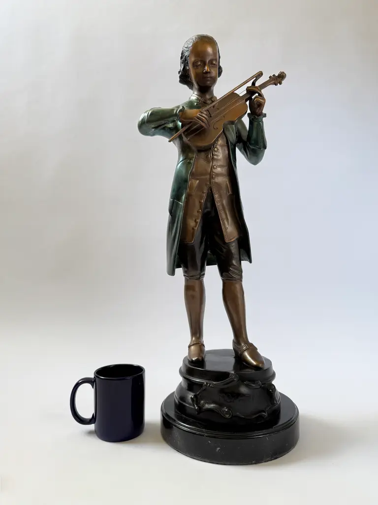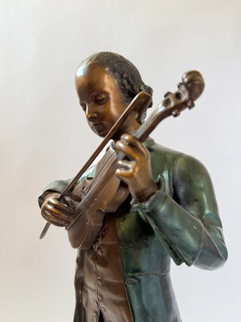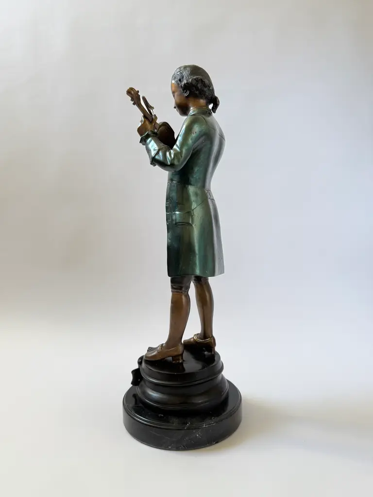 A cast bronze figure of a young Wolfgang Amadeus Mozart, modeled in the style of 19th-century European academic sculpture. The piece depicts Mozart. The green-brown coloration of the coat and warm bronze tones of the face and hands echo the techniques of French and Austrian Romantic-era sculptors. Mounted on a black marble base. This work follows the tradition of 19th-century sculptors such as Houdon and Carrier-Belleuse, who popularized refined portrait bronzes of historical and cultural icons.