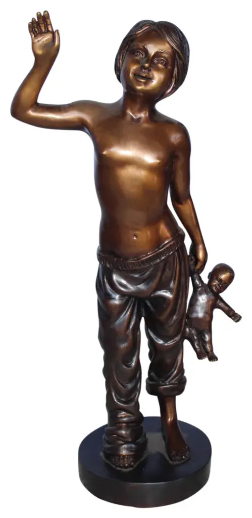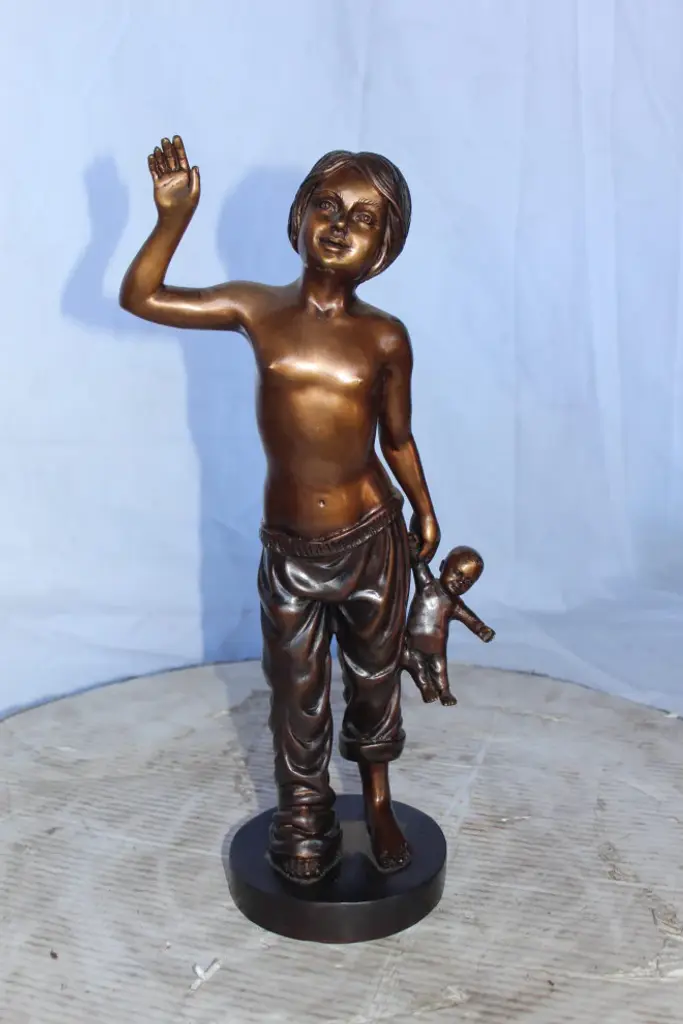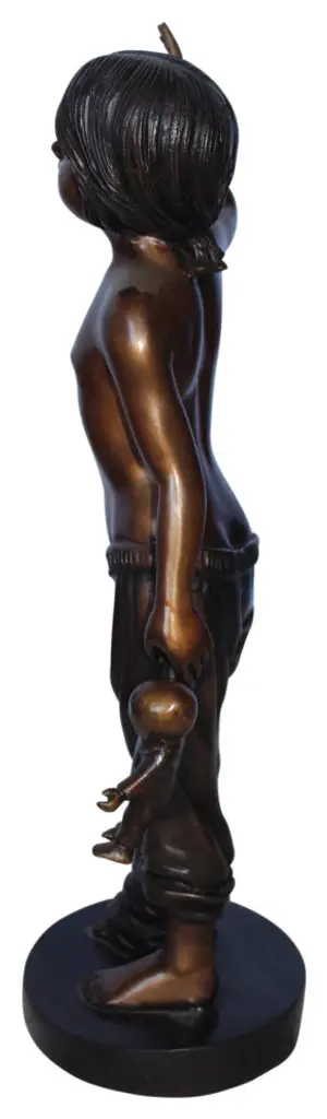 Using a lost wax method and green patina finish, this bronze statue depicts a girl holding a baby dole. This statue would look great on the lawn or in the home of any art collector. Size: 8"L x 5"W x 16"H. Weight is: 4Lb
