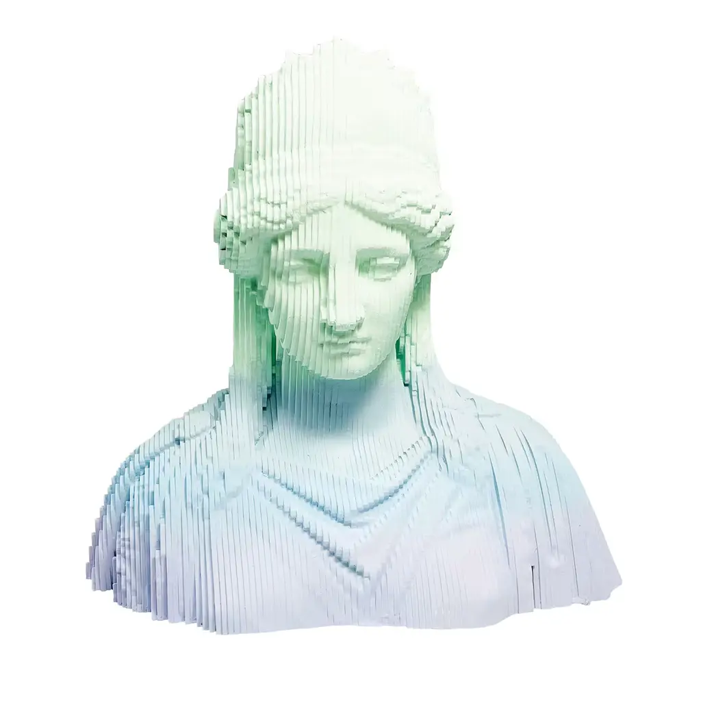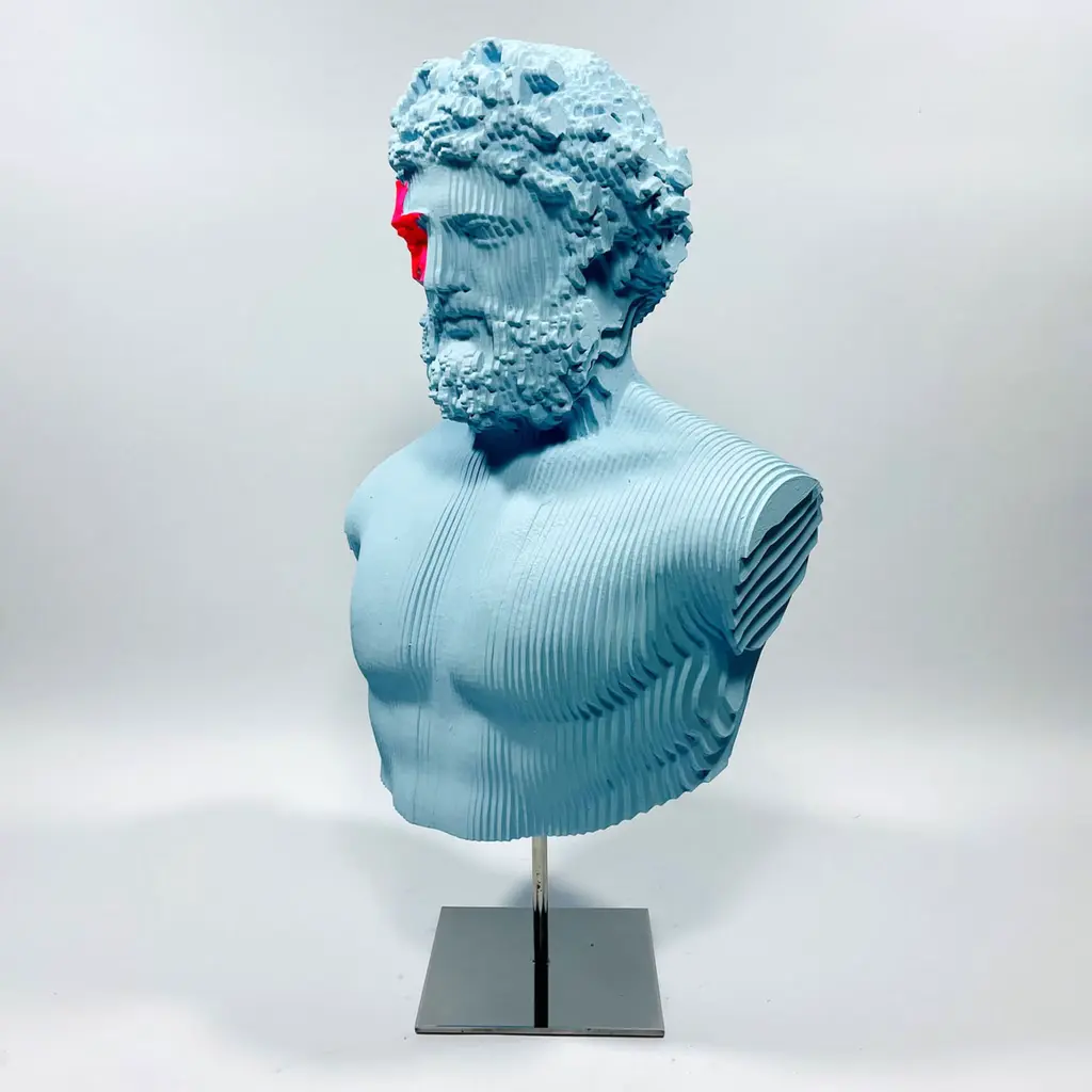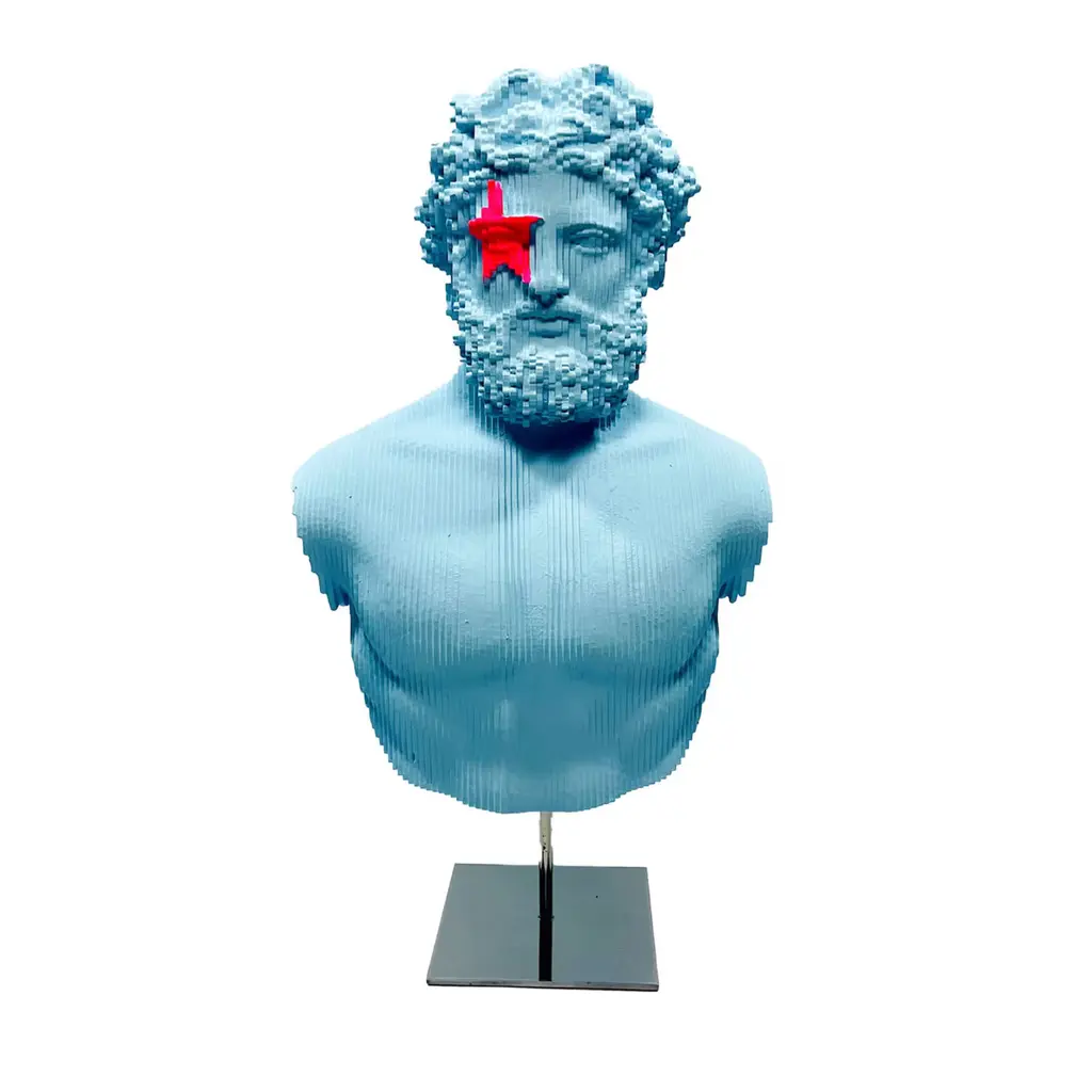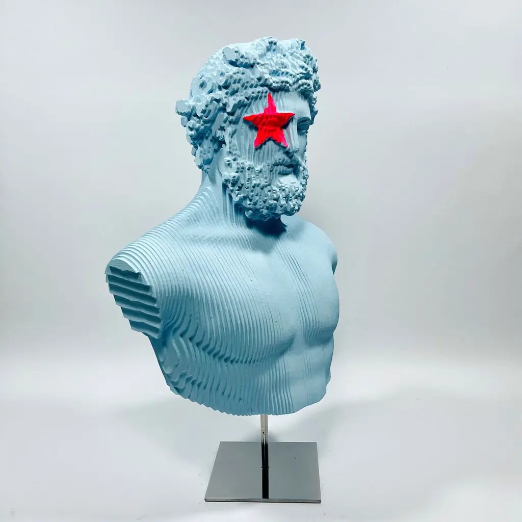The subject of the work by Daniele Fortuna, Zeus Superstar is the face inspired by the canons of beauty and aesthetics of antiquity. The fusion of past and present within the same work is typical. In this case, the bright, brilliant colors and the star on the statue's face recall the contemporary world. Within his works, Daniele Fortuna wants to create a sort of imaginary bridge between the past and the present.