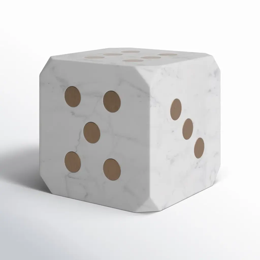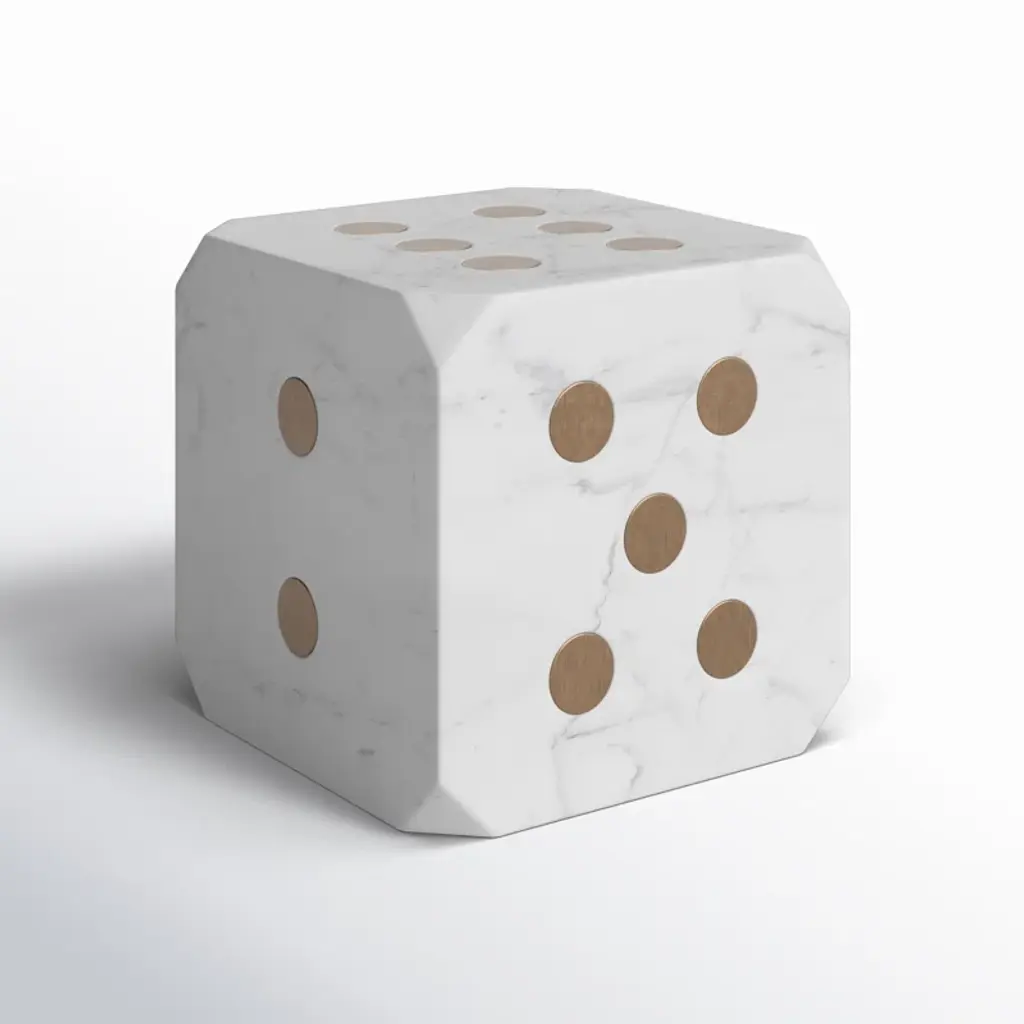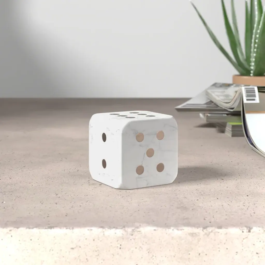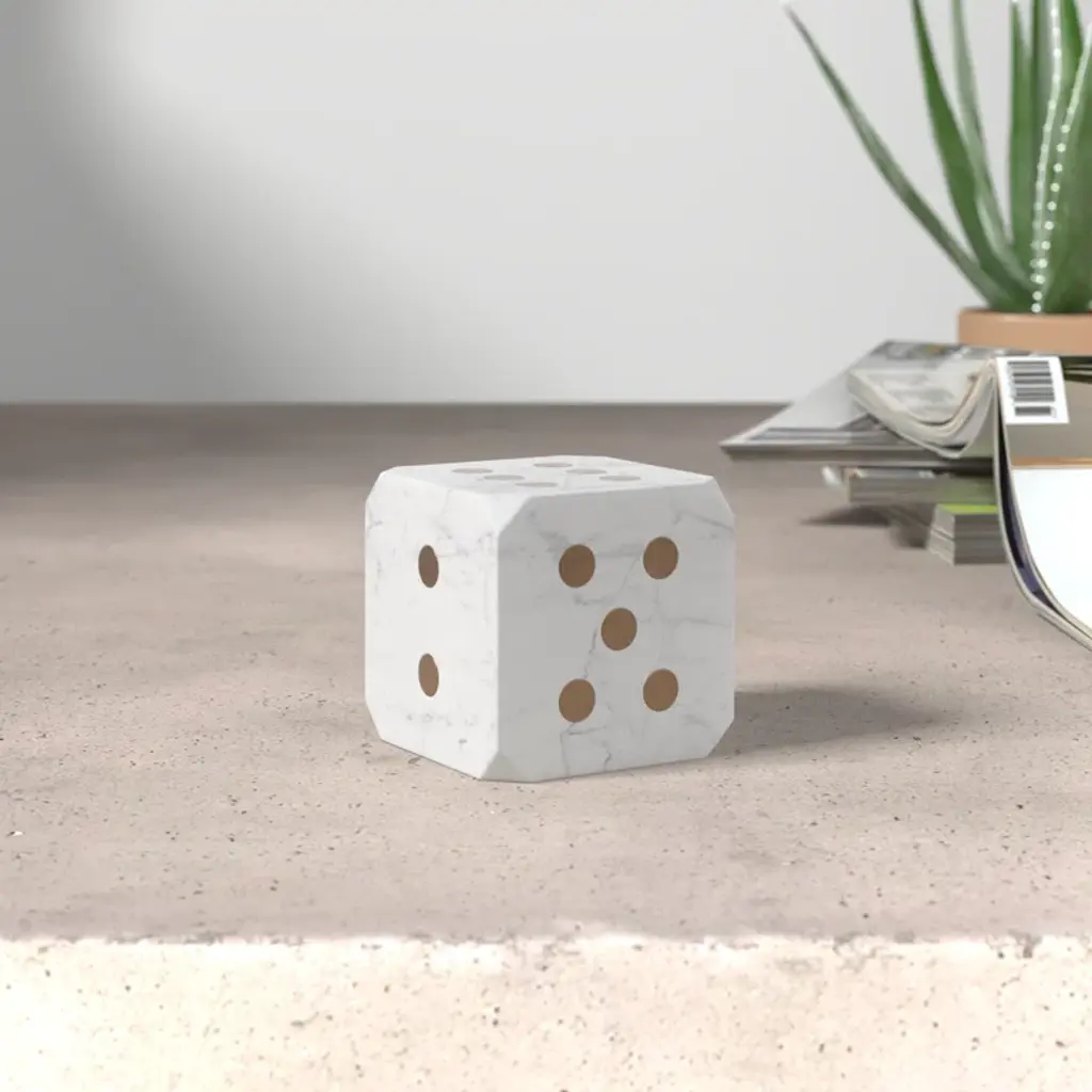 Take a chance. Crafted from cool white marble with organic gray veining, this oversized die sculpture is accented by dots of warm brass. Dice are supposed to be good luck – and this one would make an elevated paperweight or bookend for the board game aficionado in your life.