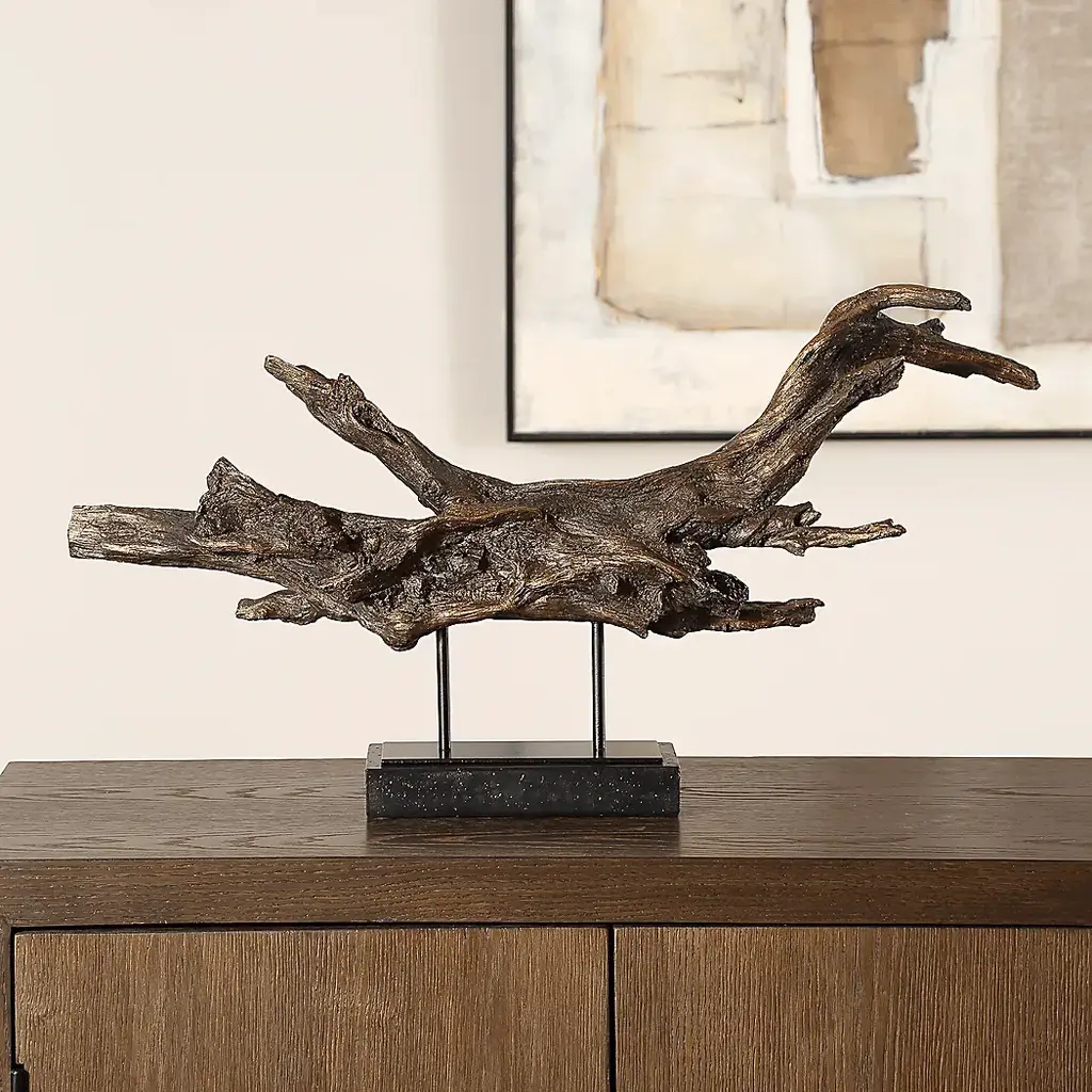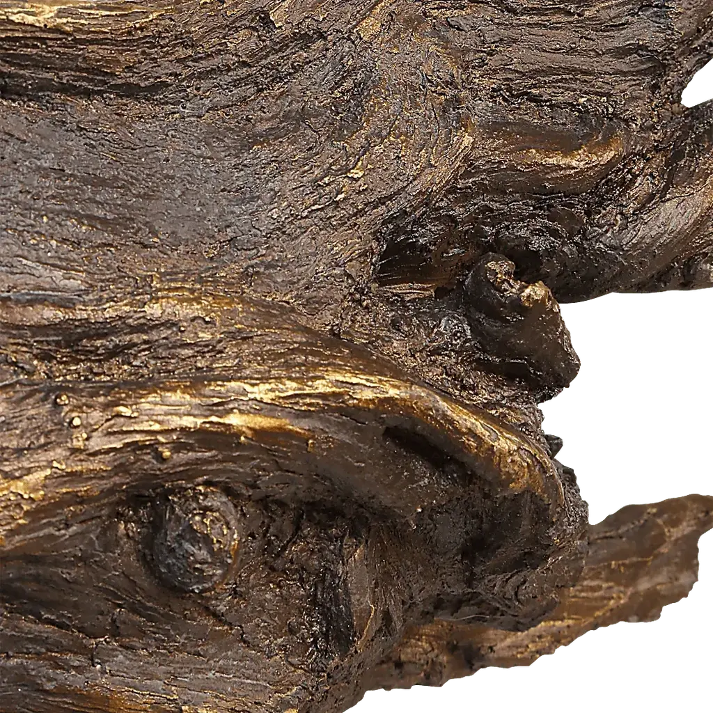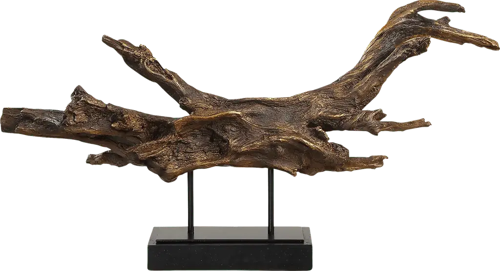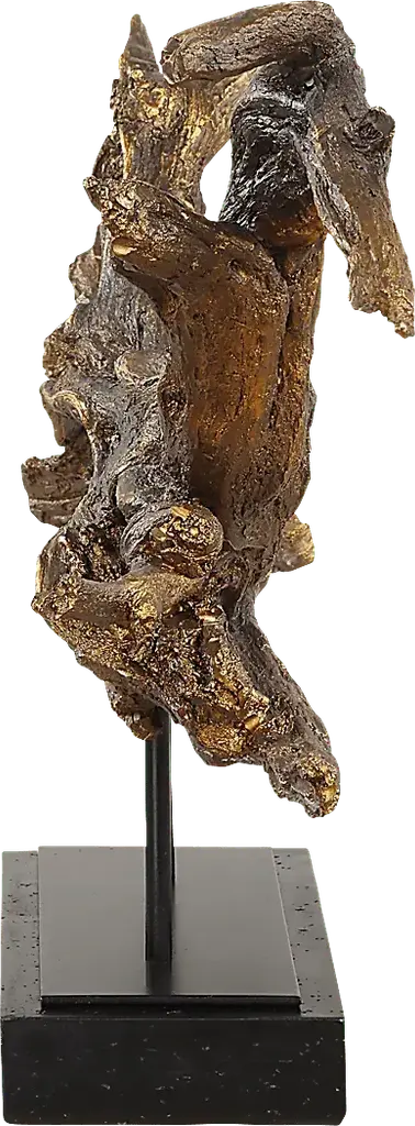 This captivating Zyras branch sculpture boasts a deep dark brown finish accented with metallic gold highlights, bringing a sense of nature and elegance into your space. Artfully displayed on a matte black stand, this piece combines organic beauty with modern aesthetics, making it a striking focal point for any room.
