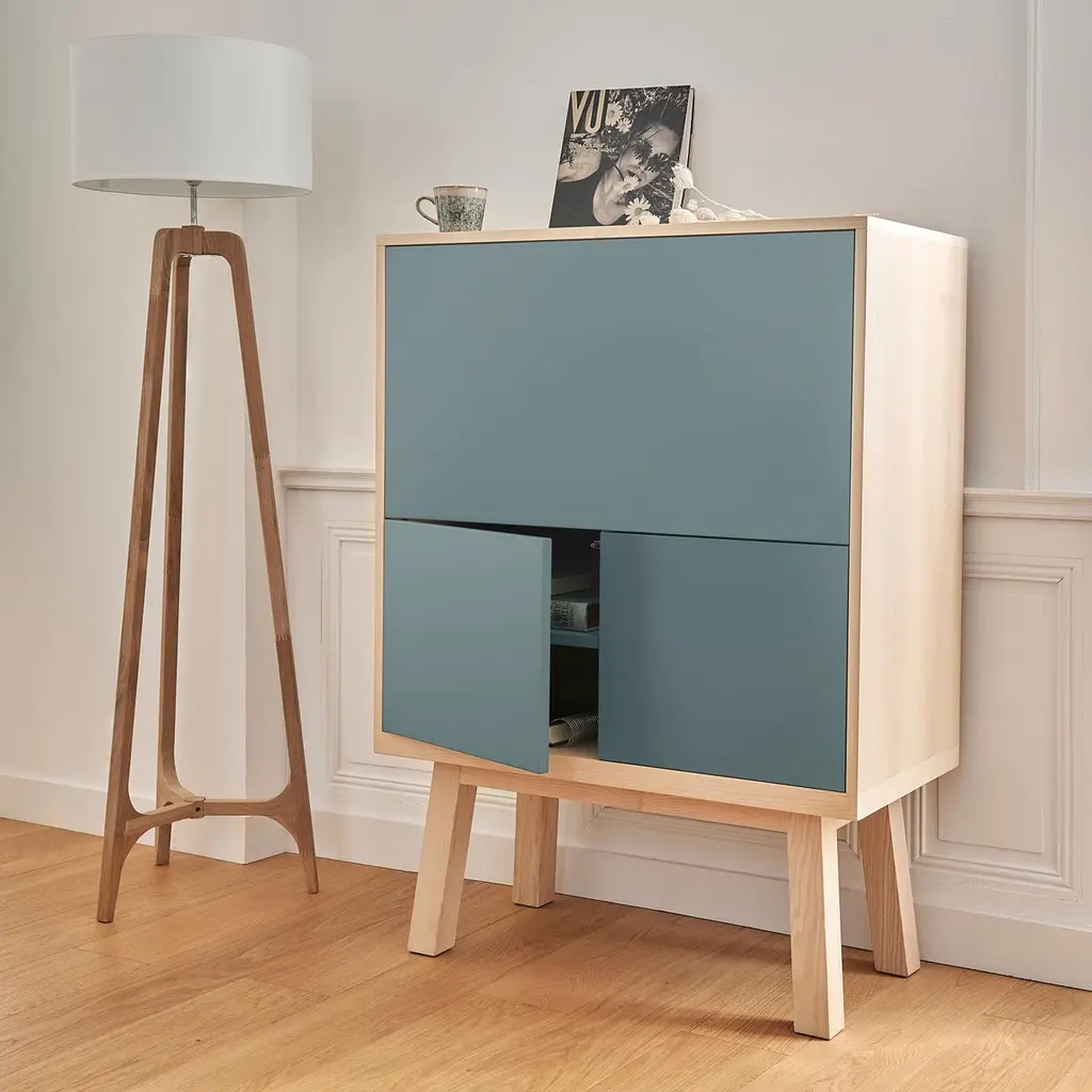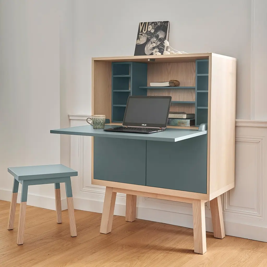 This secretary Desk belongs to our ÉGÉE COLLECTION and is designed by the Parisian designer Eric Gizard. Eric adopts for this collection the refined codes of Scandinavian design, combining natural materials and sobriety of lines and adds very beautiful muted and "trendy" colours.The wood used for this collection is Ash.For all dimensions, we kindly advise to have a look at the scheme with dimensions in the pictureThe dimensions of the box itself are width 90 cm / 35.4'' x height 90 cm / 35.4'' x depth 46 cm / 18;11''Height of the feet is 35 cm / 13.8''Useful height behind the lower hinged doors is 37 cm / 14.6''Overall width of each compartment behind the hinged doors is 42 cm / 16.5'' and useful width is 38 cm / 15.0'' due to the hinges. The vertical interior divider can be moved during the manufacture process to allow the installation of printers with a width> 42 cm / 16.5''.The upper working part is fitted with a flap door on a "push-loose" opening for an efficient work with your laptop and smartphone. The storage space inside the cube and behind the flap is for your screen or to store your paperwork in the removable shelves. The lower part with the 2 hinged doors opens with a "push-to-release" pressure in the middle of the flap. The horizontal 2 shelves are on cleats and removable. The cable passage is made made in the middle of niche behind the flap and at the back of each low removable shelf. MON PETIT MEUBLE FRANÇAISoffers you exlusively 100% French products. The solid wood comes exclusively from sustainably managed French forests, PEFC certified.The manufacture and finishes are of very high-end quality, carried out in workshops in Mayenne, France.
