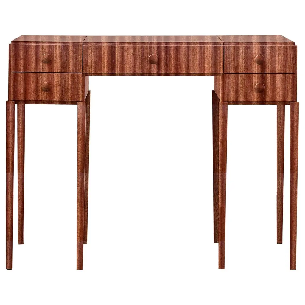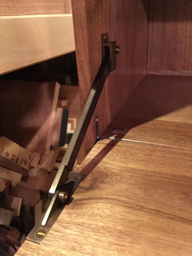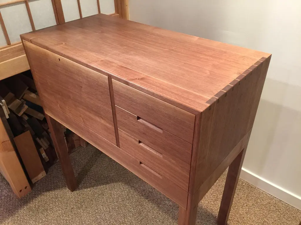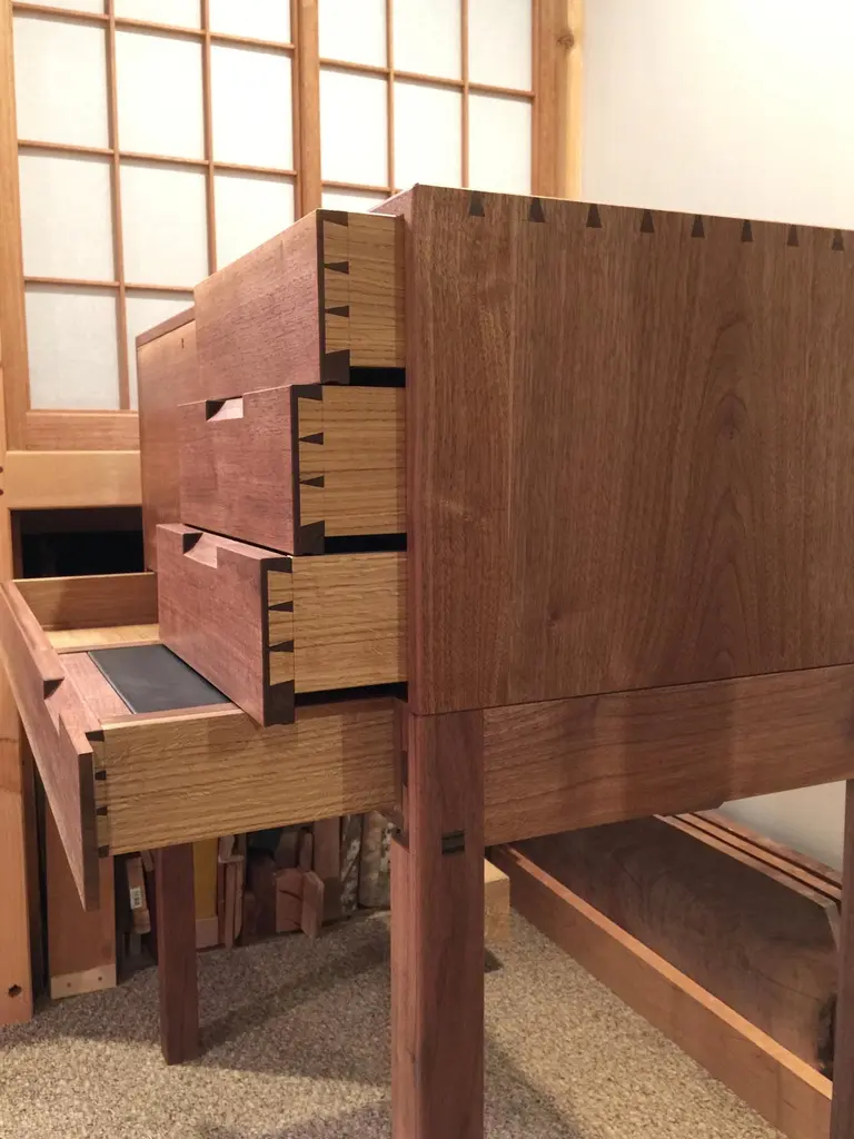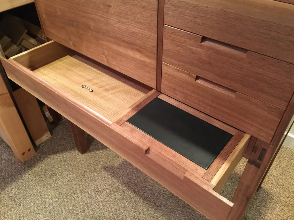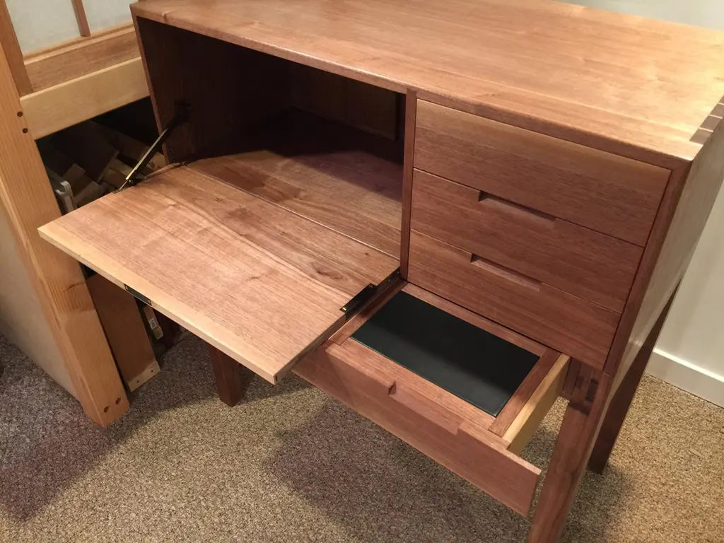 A contemporary take on the butler's desk. A butler's desk is a cabinet that converts into a desk, concealing its function. A desk, standing on its own looks out of place without an accompanying chair and lamp, but a cabinet that functions as a desk looks fine all by itself.This is entirely handmade, down to the desk hardware which I custom make in my shop. This desk requires very careful selected lumber to allow the facade to be created from one single section of a slab making a seamless transition from door to drawers. Similarly the exterior case is also constructed of sequenced matched lumber.The desk is constructed of solid wood, including drawer bottoms which are made of white oak and the back panel which will be made out of the main choice of lumber.The desk features three side drawers, one large pull out drawer which functions as a support for the fold down desk and a sliding tray.The interior compartment of the desk features a shelf to hold and store small electronics with a pass through for wiring which is hidden behind two wooden sliding doors.This desk is made of American black walnut.